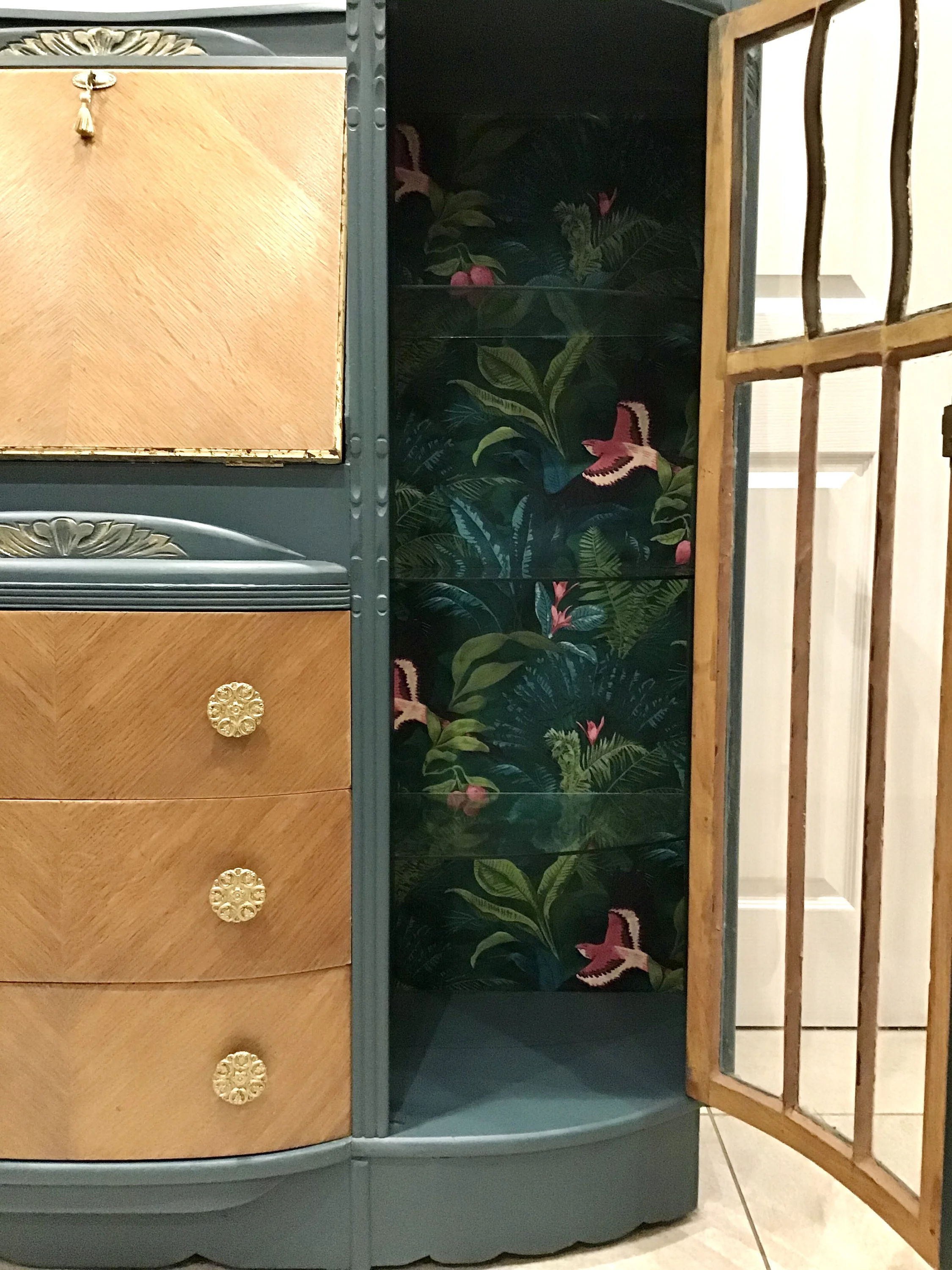 The fold down compartment and backs on the shelves have been lined with striking coordinating paper. The leather inlay has been painted in the blue to bring it all together.