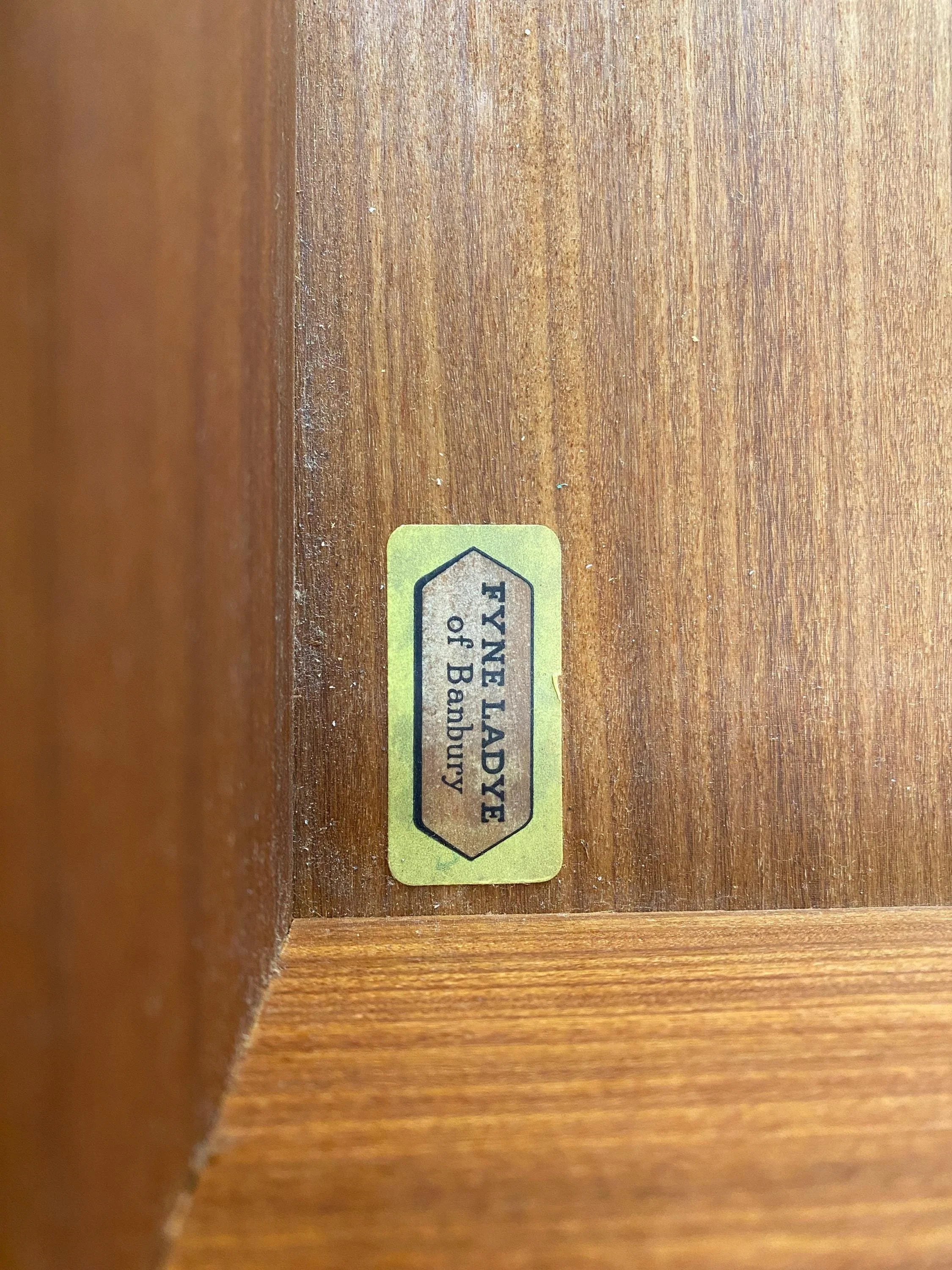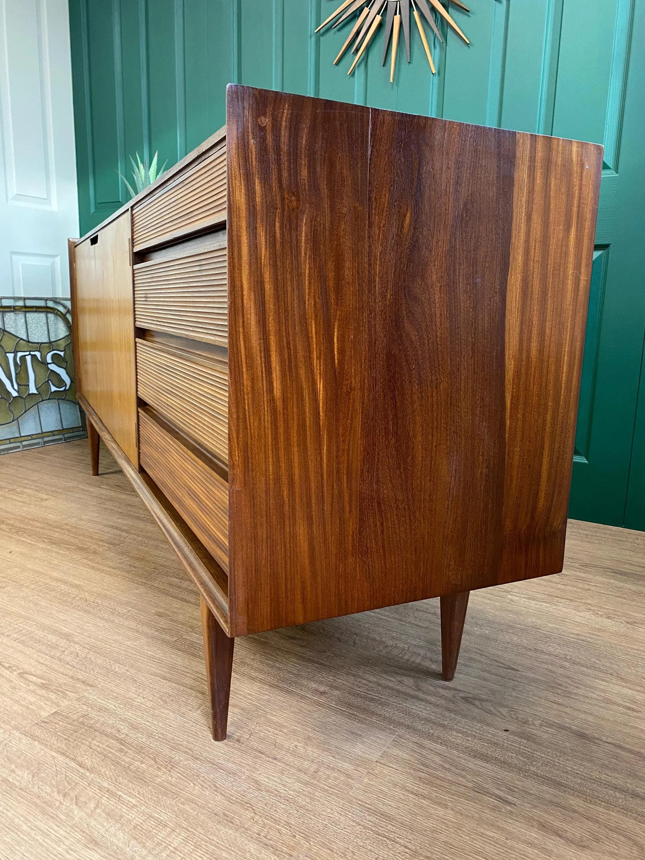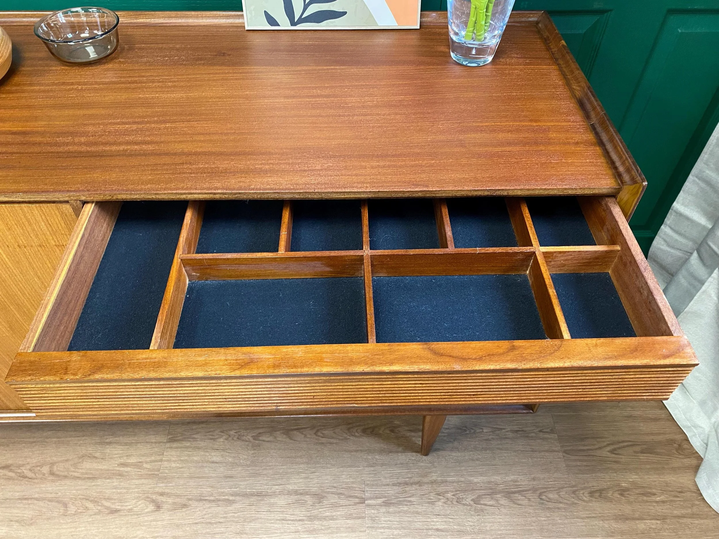 Sleek Danish style oozing with mid century appeal. A double cupboard with cut out handles alongside four drawers with thick solid afromosia reeded fronts and cut out handles underneath. The top drawer is segmented for cutlery and lined in the original black felt. There are solid afromosia adjustable shelves in the cupboards and a pull out tray for preparing drinks! The legs are made from solid afromosia as is the attractive bevelled edge around the top. The Fyne Ladye sticker is still in the drawer.