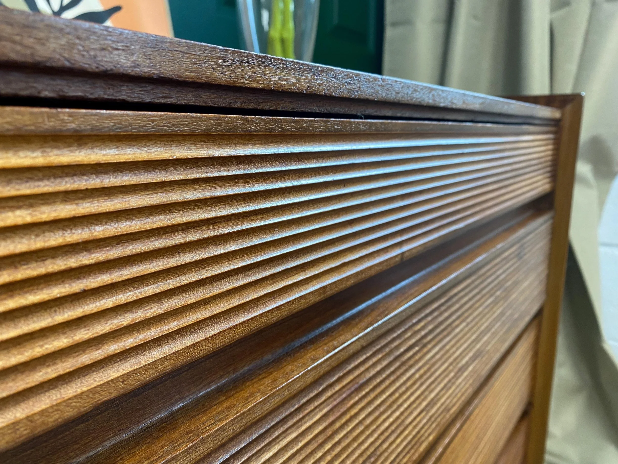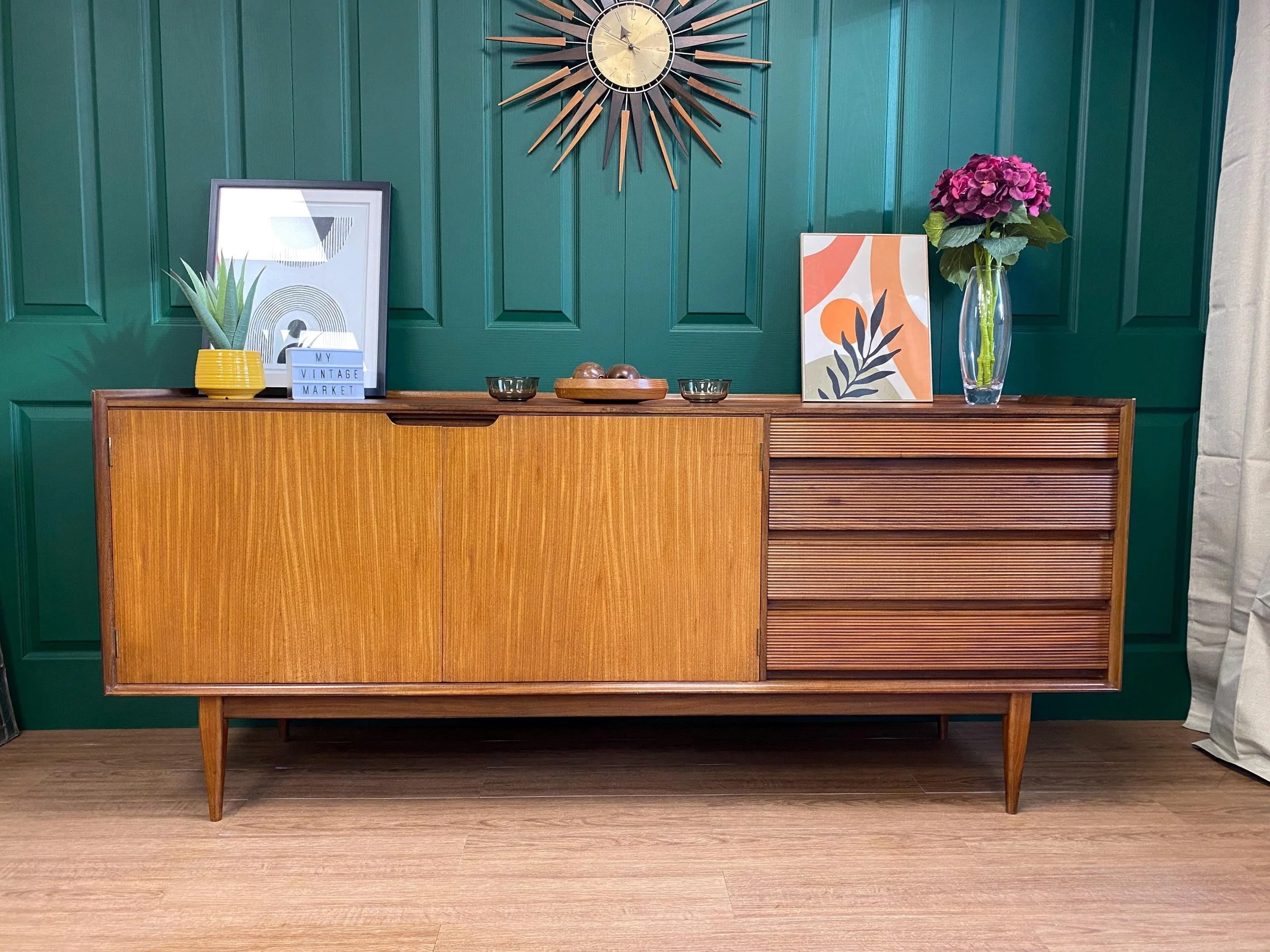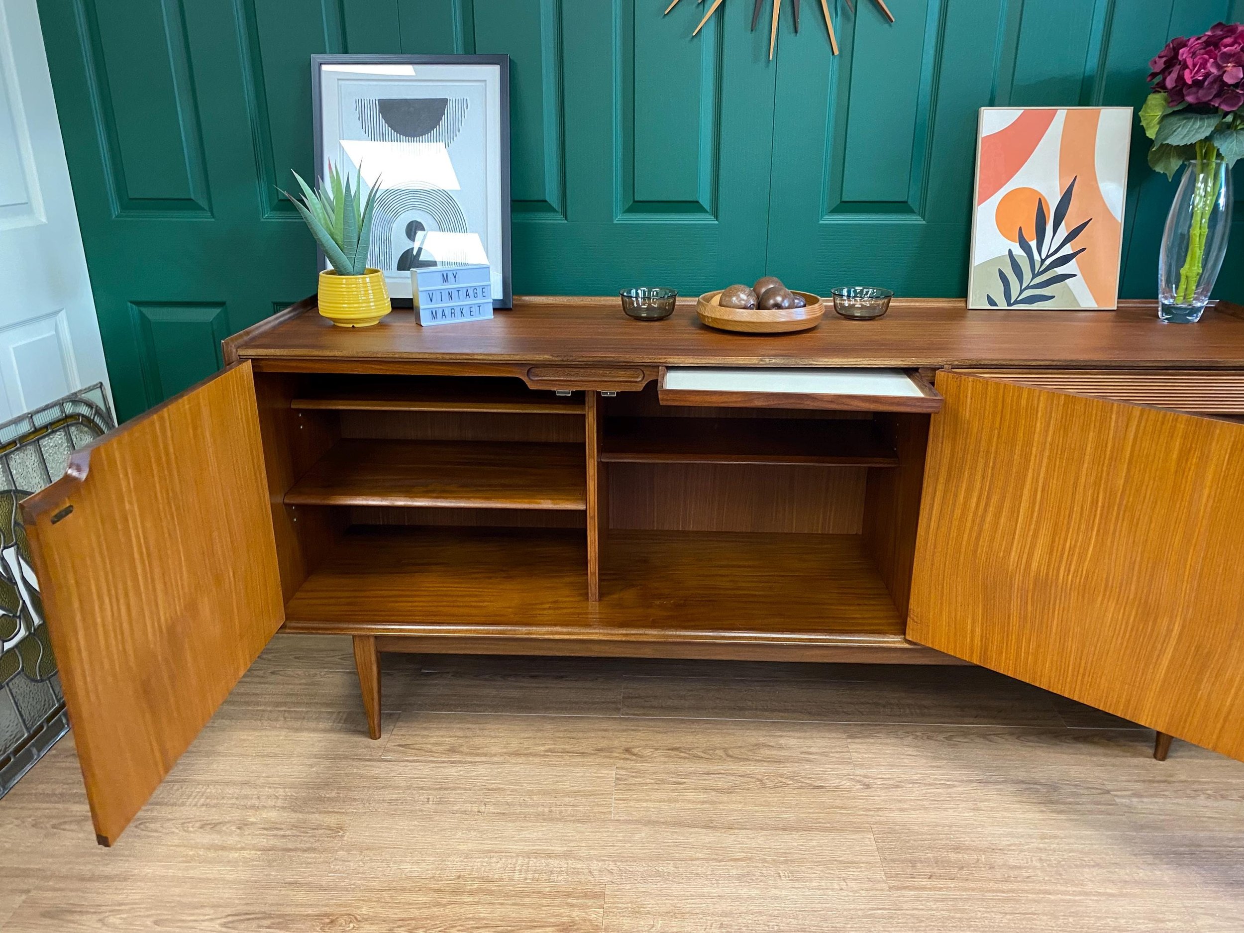 Sleek Danish style oozing with mid century appeal. A double cupboard with cut out handles alongside four drawers with thick solid afromosia reeded fronts and cut out handles underneath. The top drawer is segmented for cutlery and lined in the original black felt. There are solid afromosia adjustable shelves in the cupboards and a pull out tray for preparing drinks! The legs are made from solid afromosia as is the attractive bevelled edge around the top. The Fyne Ladye sticker is still in the drawer.