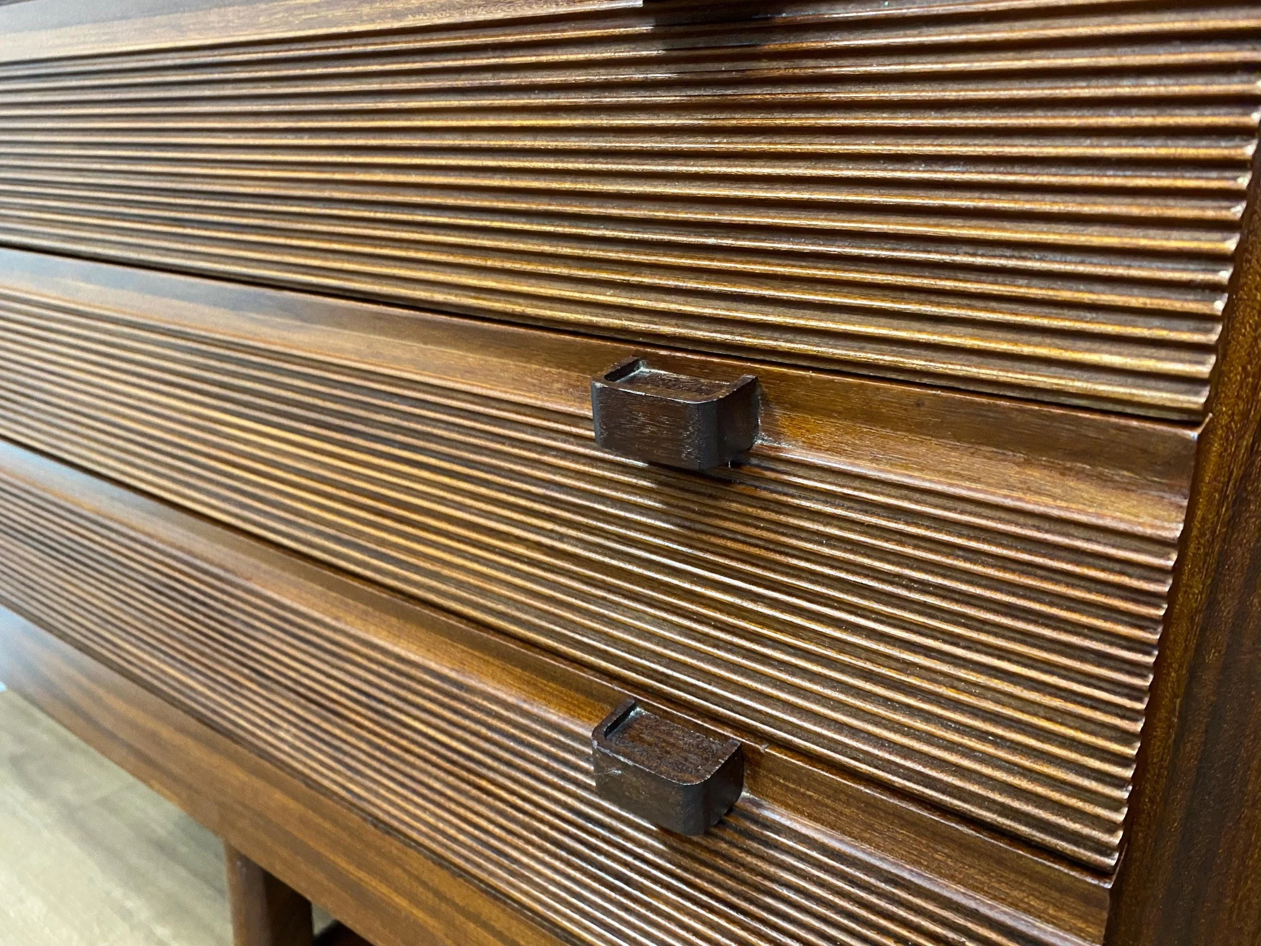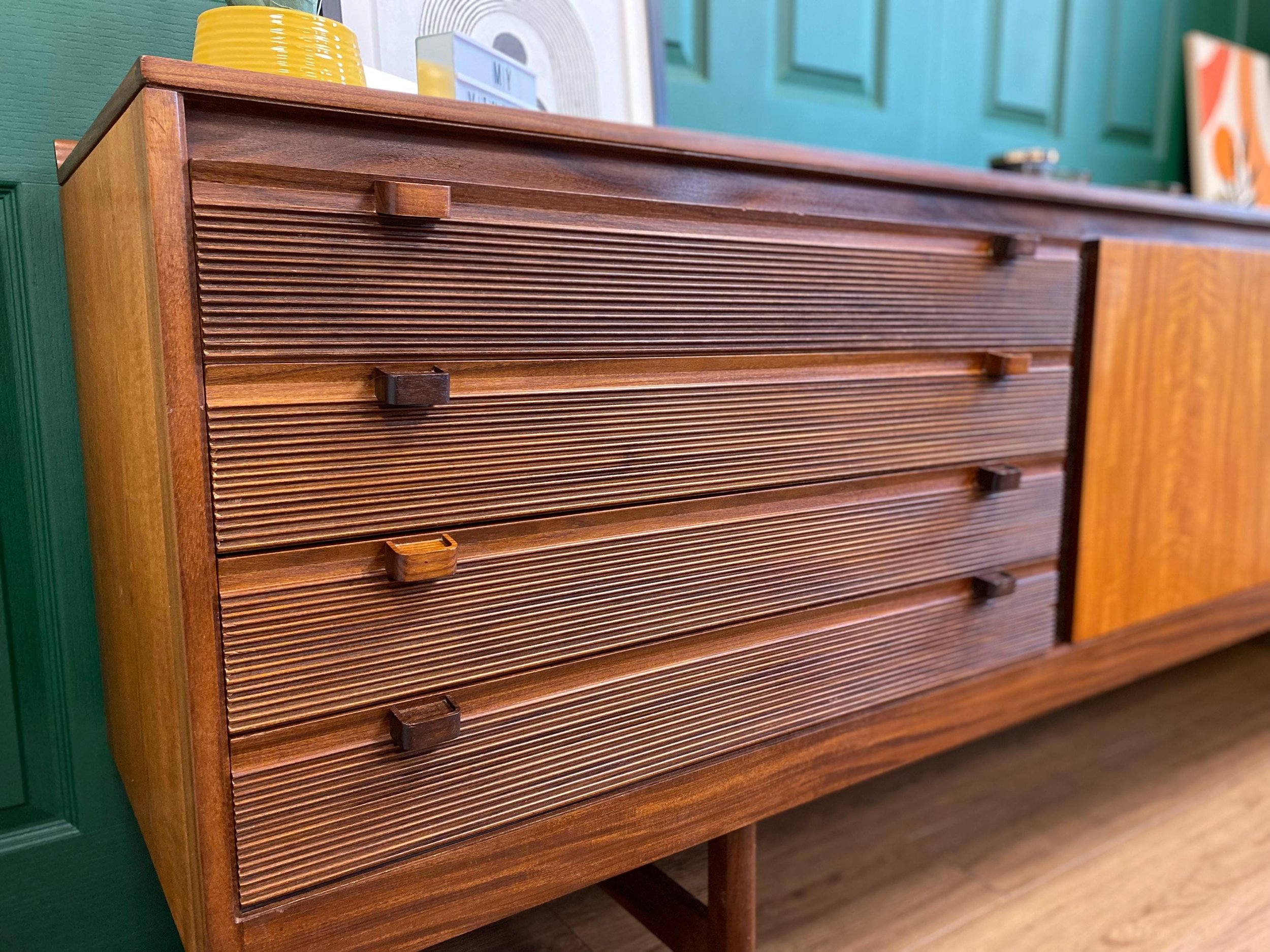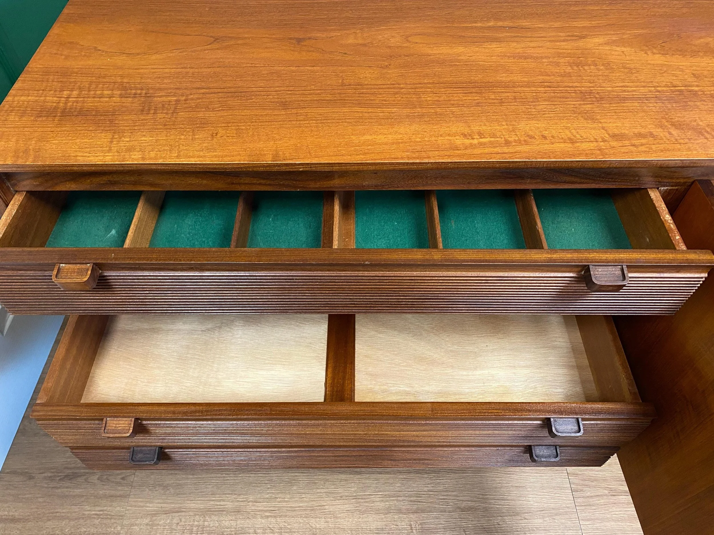 Sleek Danish style oozing with mid century appeal. Two cupboards with teak veneer doors alongside four drawers with solid afromosia reeded fronts and square handles. The top drawer is segmented for cutlery and lined in the original green felt. The legs are made from solid afromosia as is the attractive lip at the back of the top.