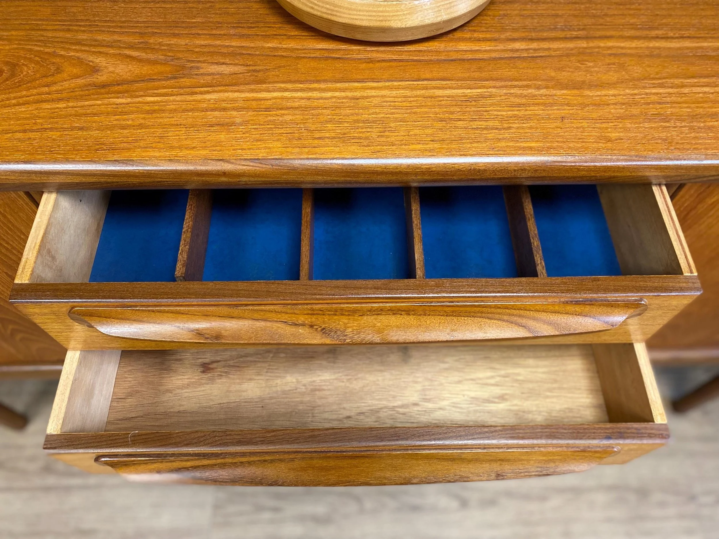 Two double cupboards flanking four drawers Teak veneer with solid teak edging, handles and legs Elegant moulded handles and slim tapered legs give it its stylish Danish style appeal Each cupboard has a double door and single shelf Four drawers; the top one has cutlery compartments lined in blue vinyl