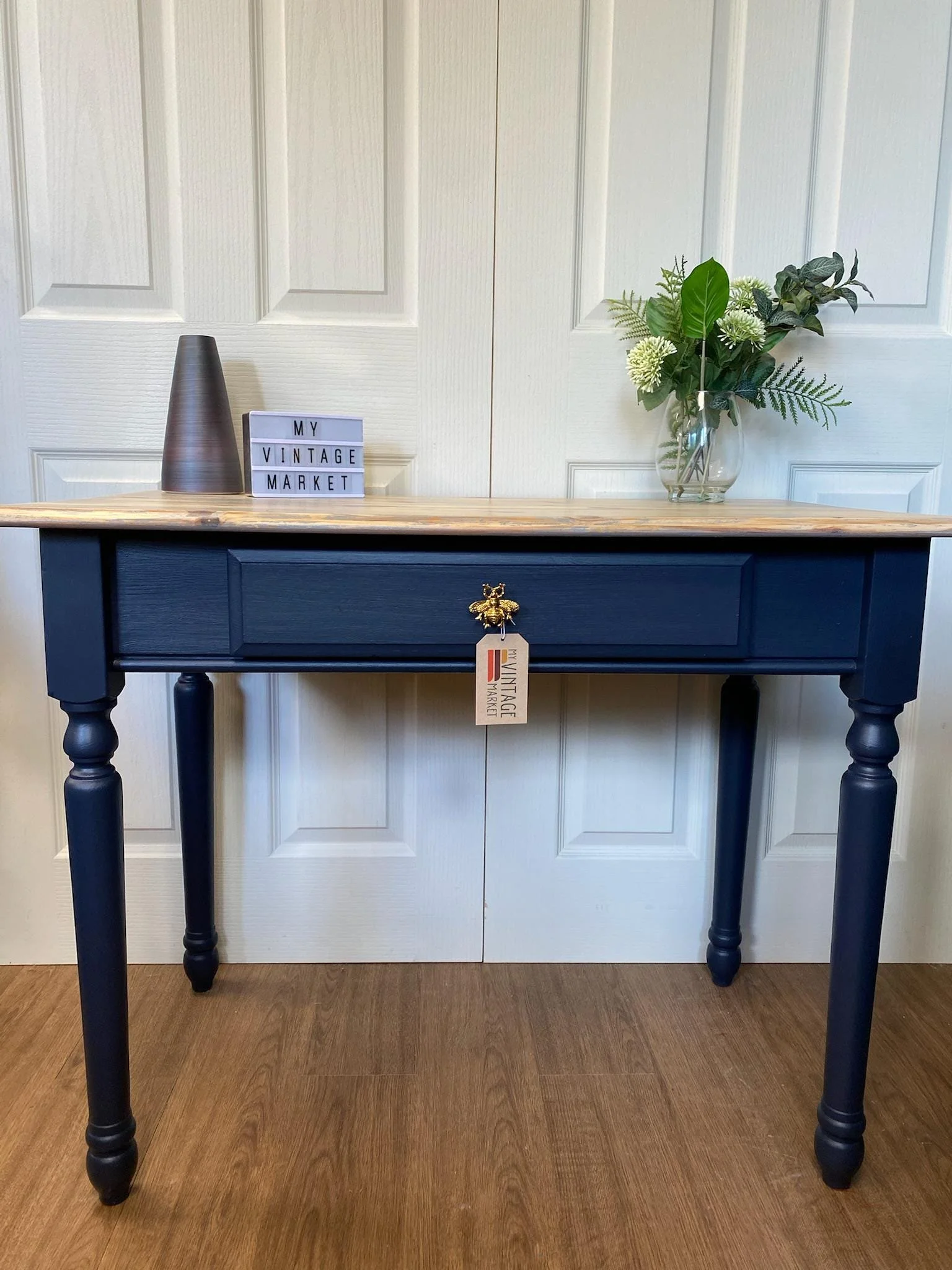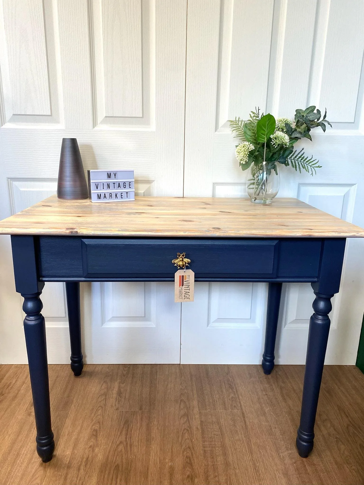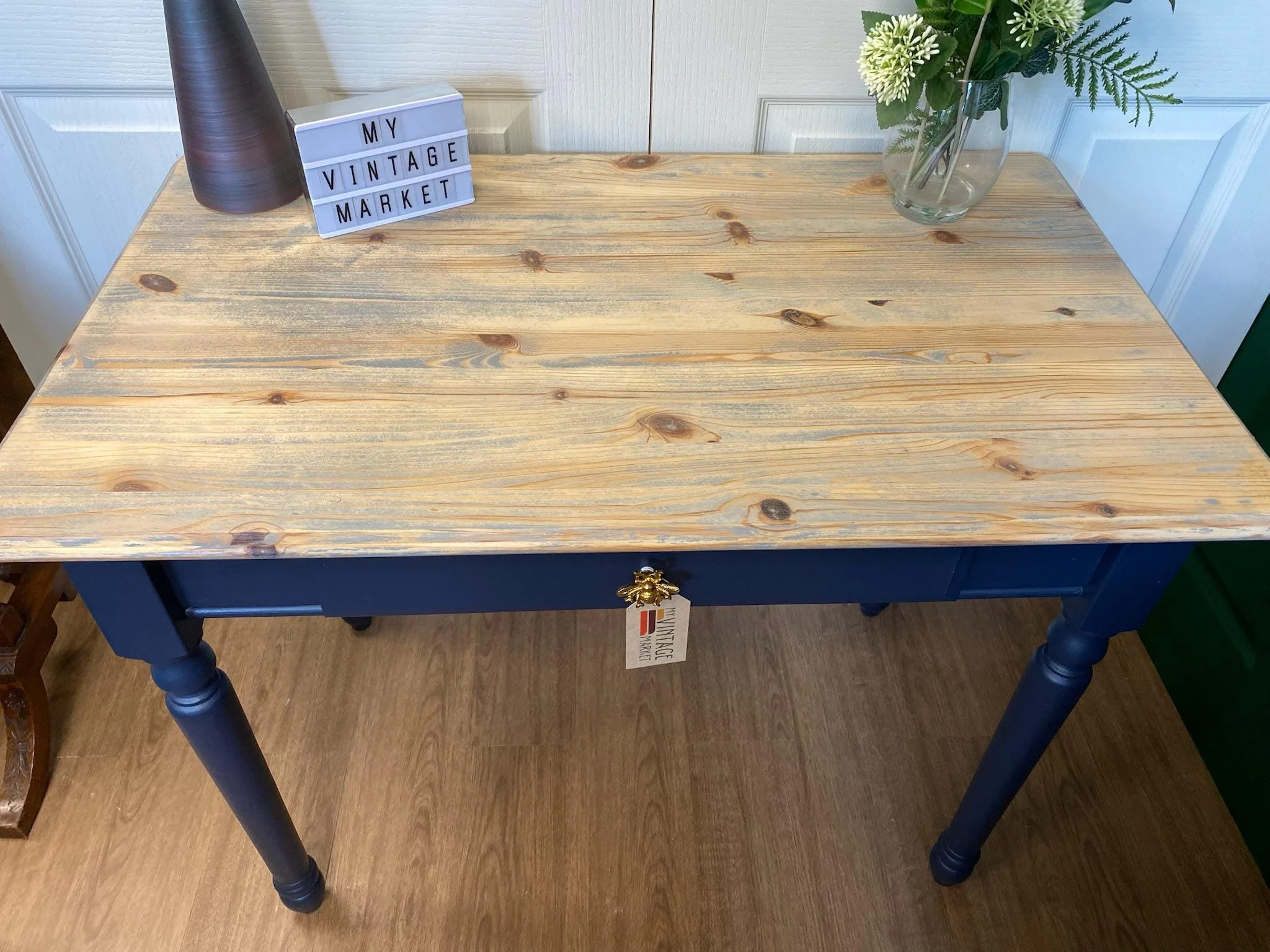 Pine console table refurbished and painted in a gorgeous petrol blue with grey washed top. There is a single drawer at the front extending about half the width of the table with a fabulous bumble bee handle. The table has 4 turned baluster legs.