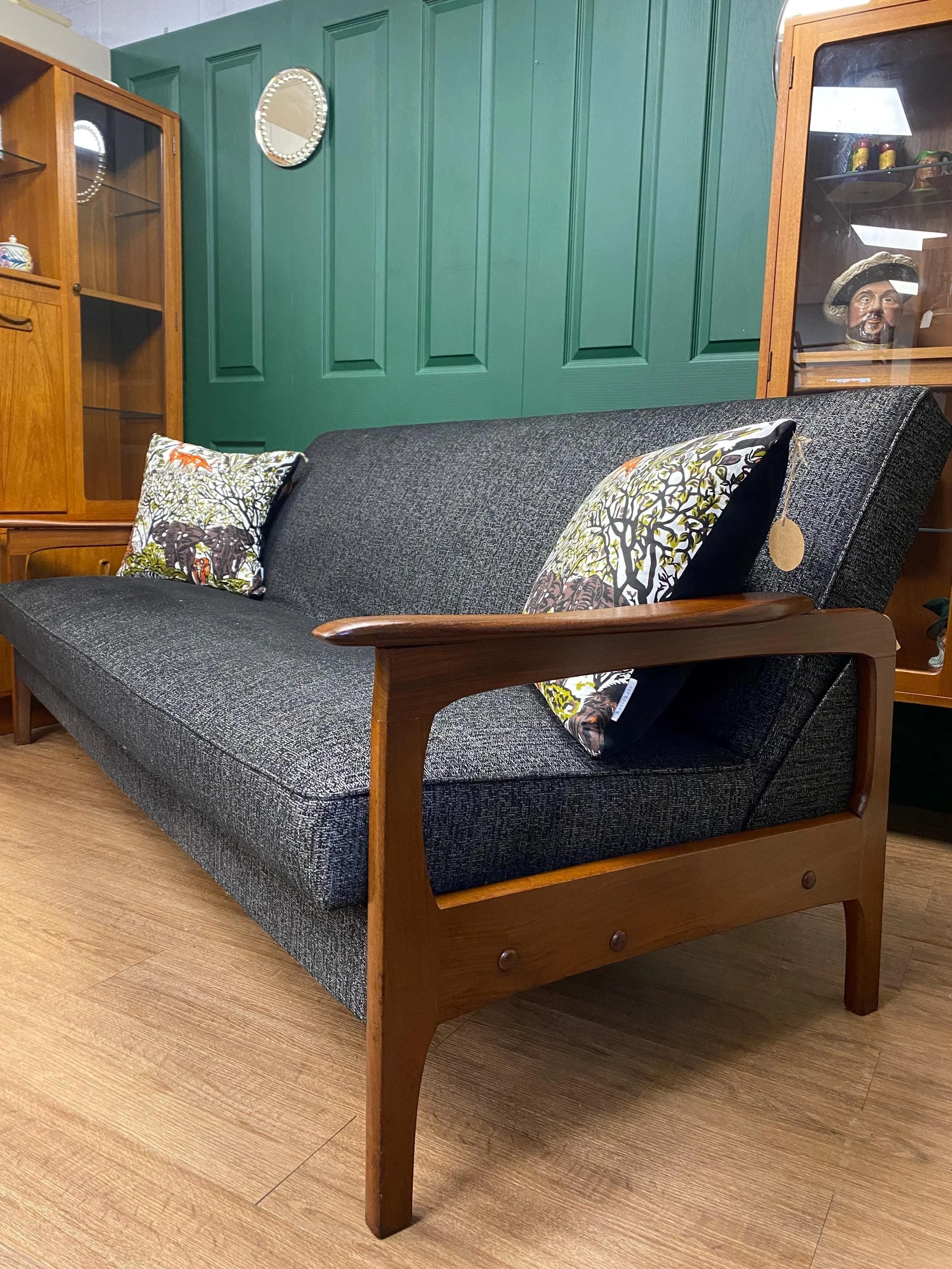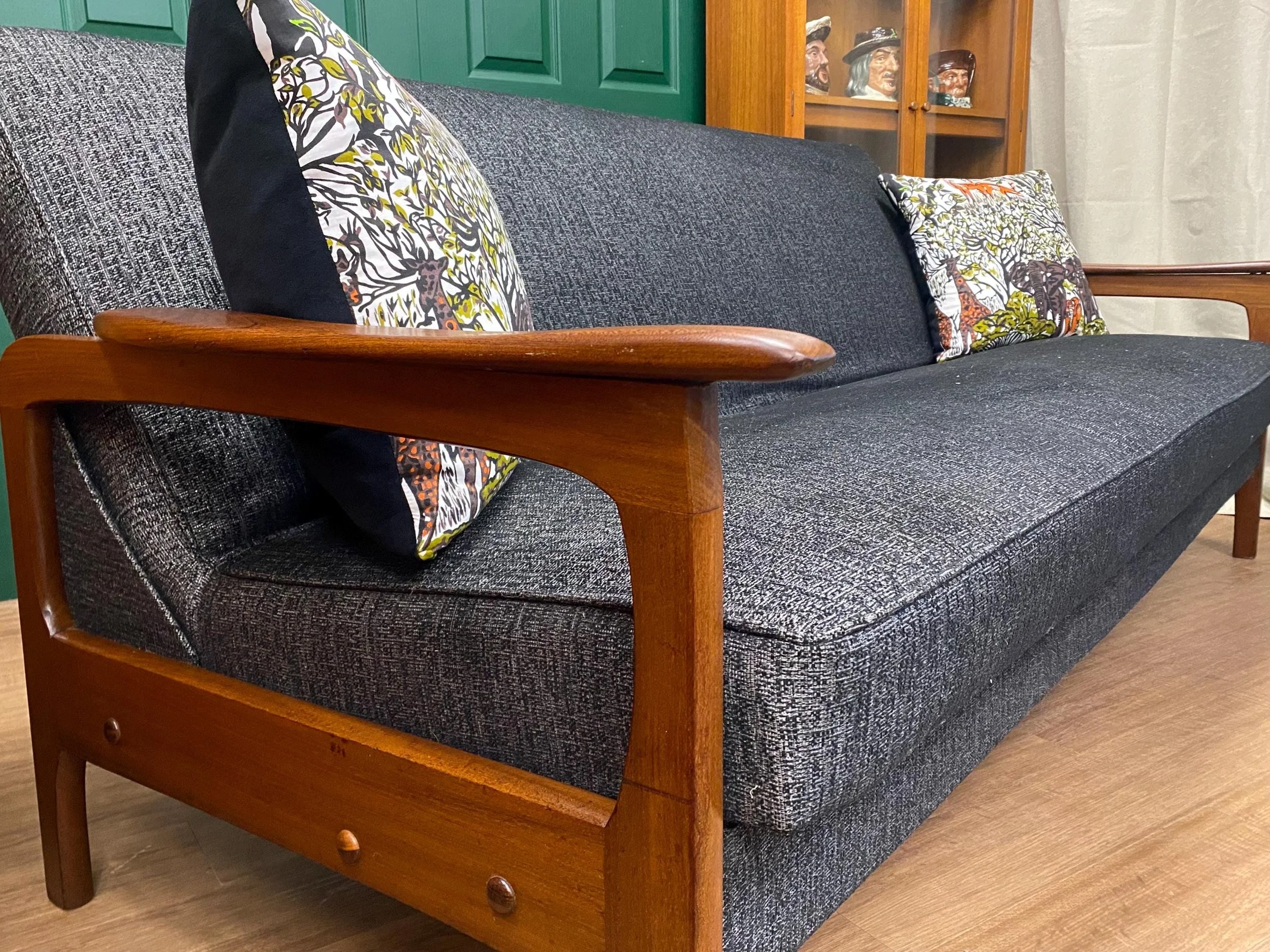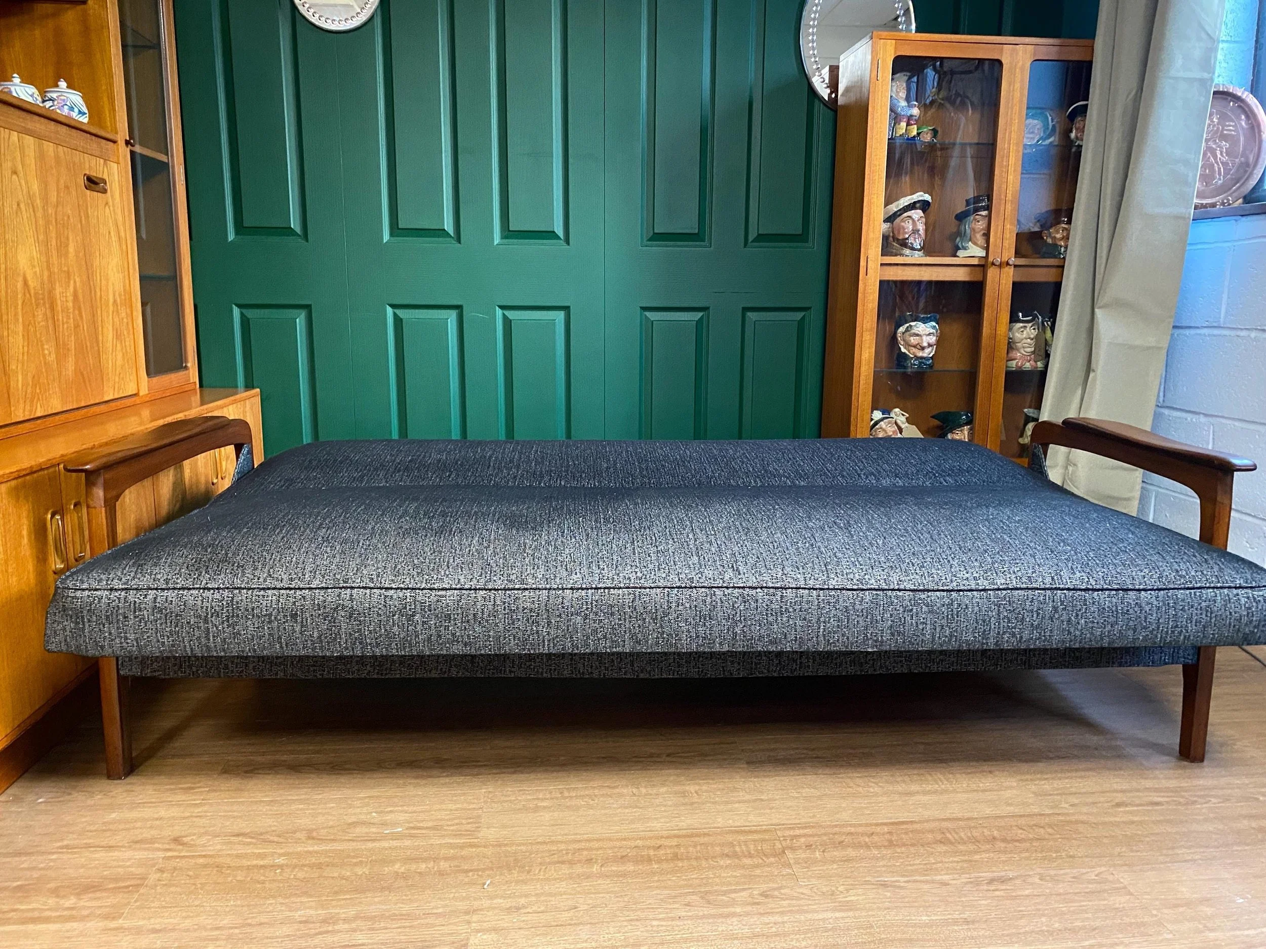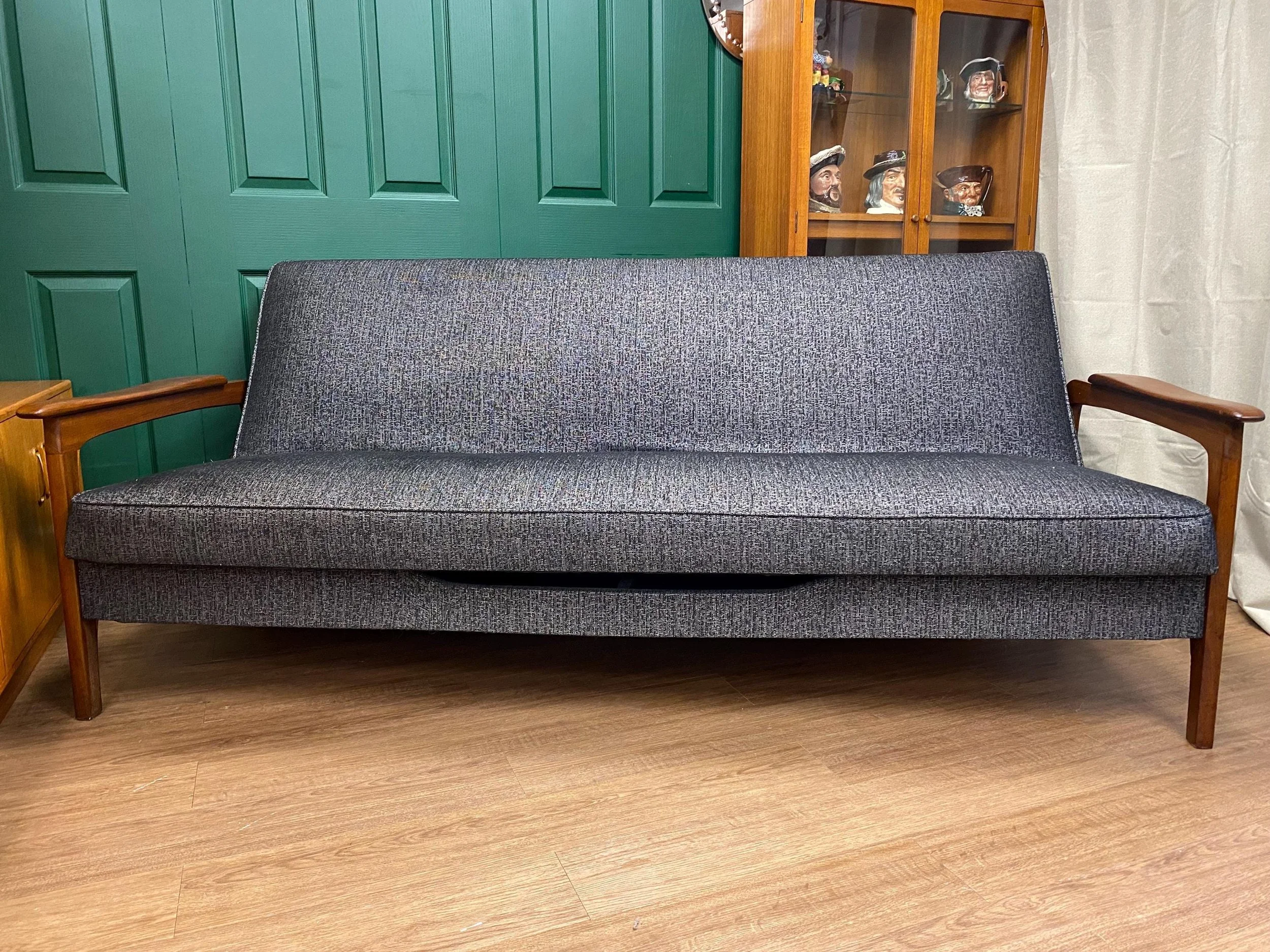 Refurbished Vintage 1960s Scandinavian Solid Teak Framed Fold Out Sofa Bed In Grey
