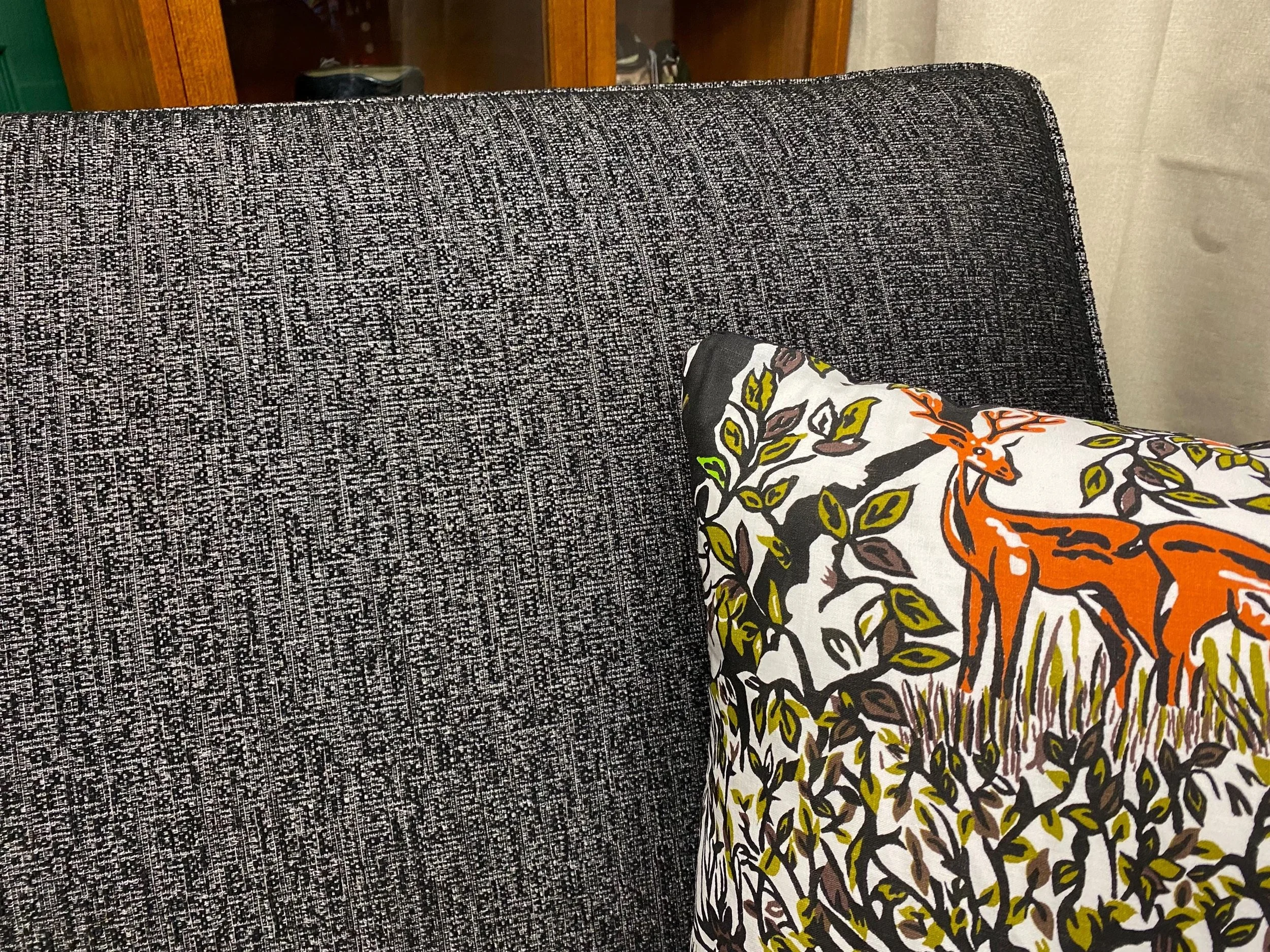 The sleigh style arms ooze mid century charm. It has been reupholstered in a dark grey fabric woven with subtle silver flecks that catch and reflect the light, adding a touch of contemporary sophistication while remaining true to its vintage character. Folds flat into a bed with storage underneath. Marked ‘Made in Sweden’