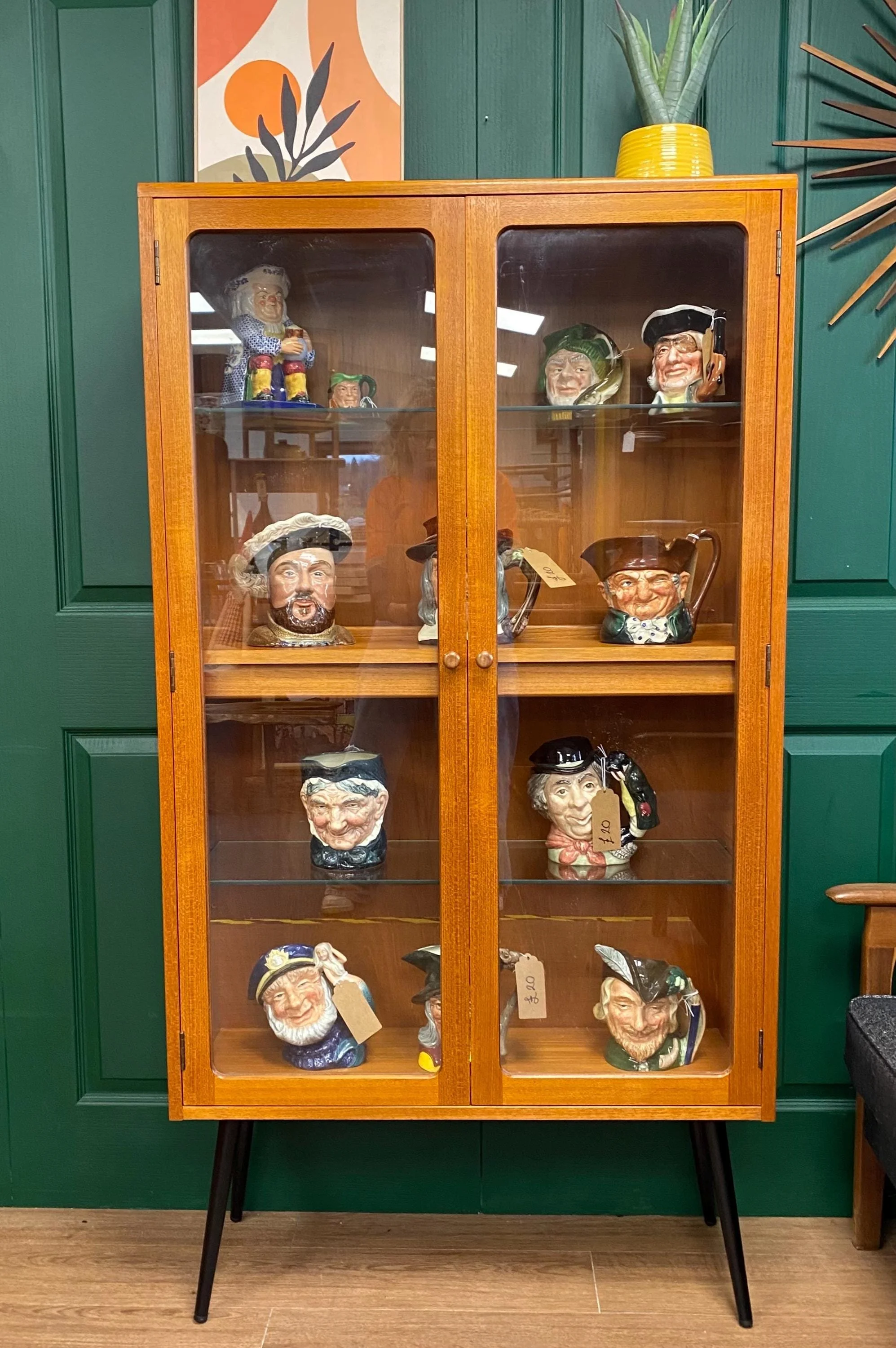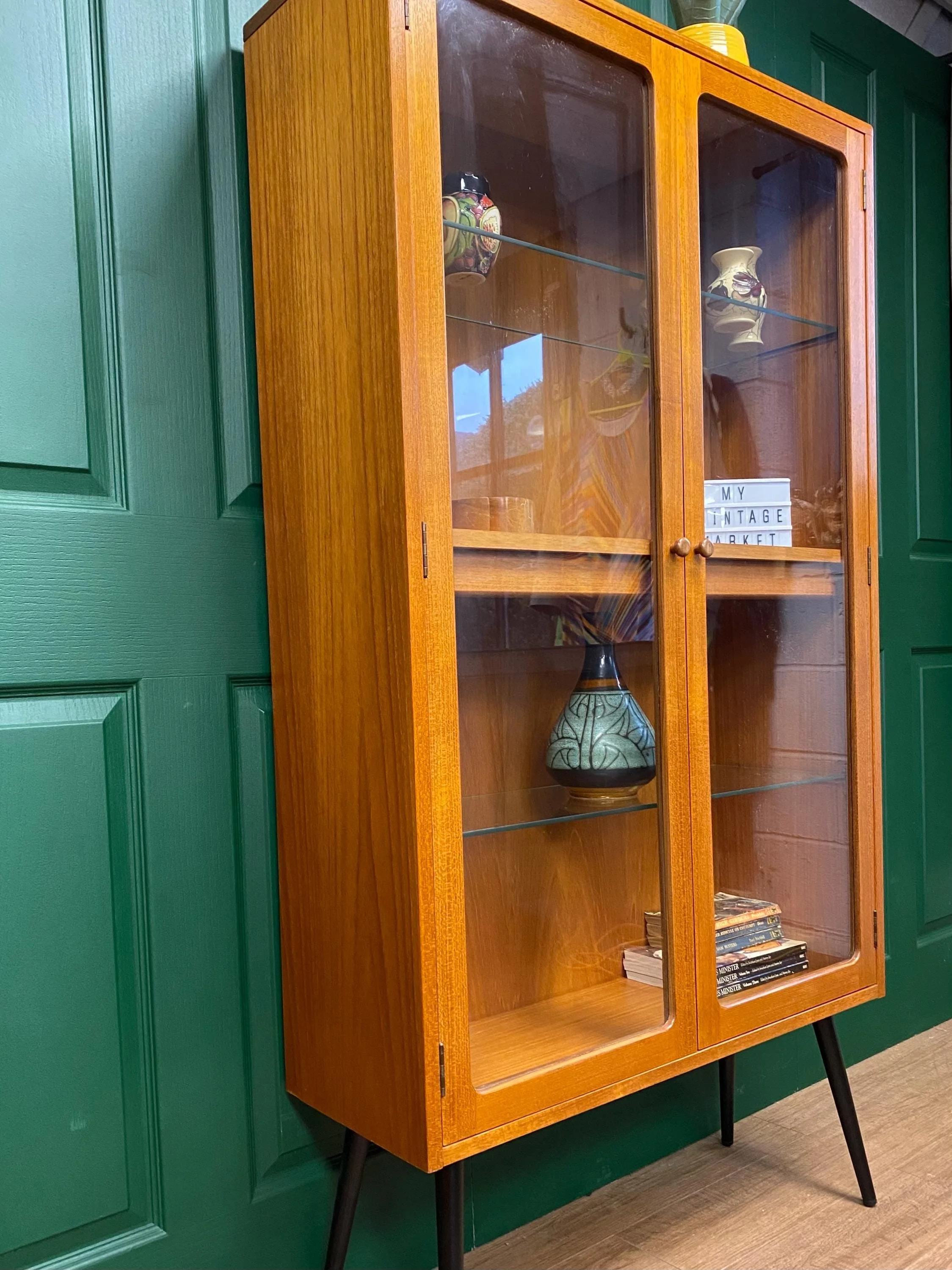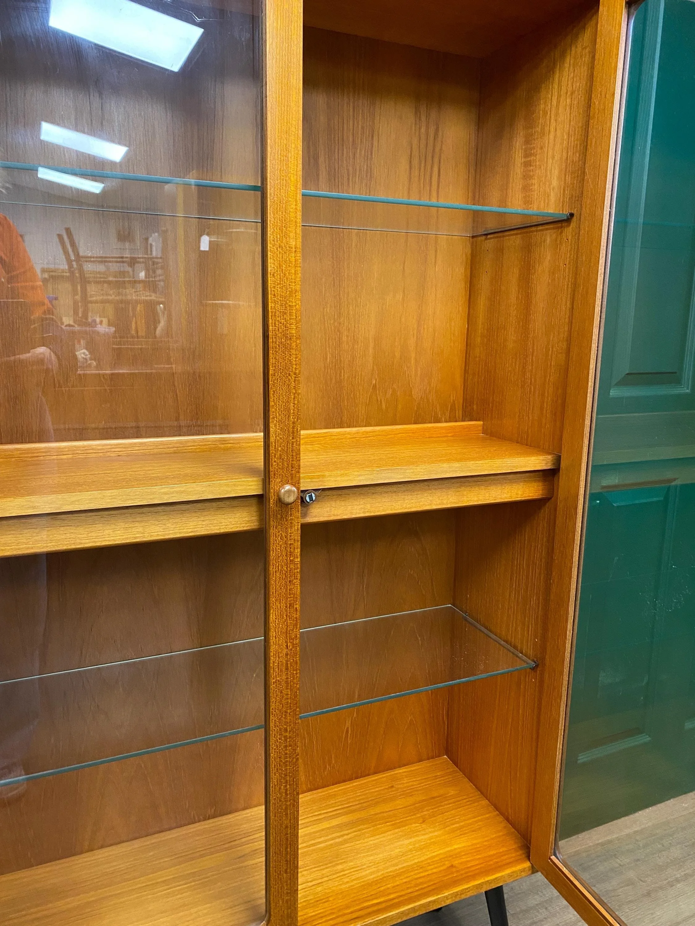 Double door glazed unit with single solid teak shelf and two adjustable glass shelves. Supported by black metal tapered legs. The wiring is present for the back light, this can be made available by adding a modern plug if desired.
