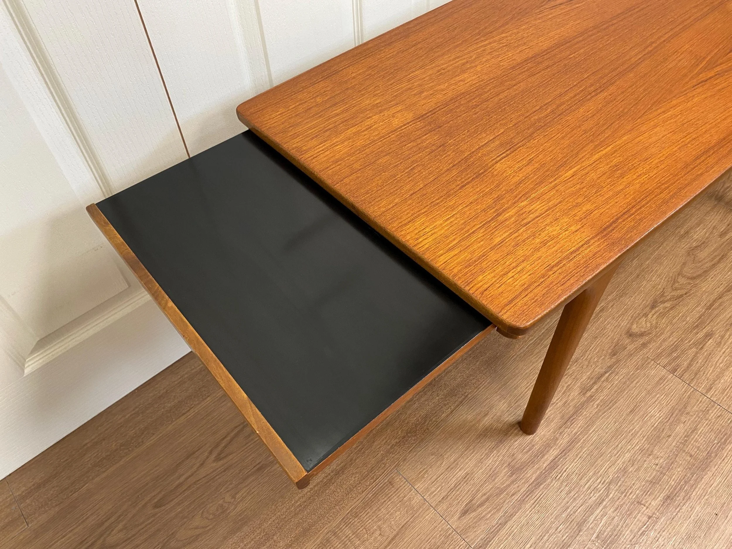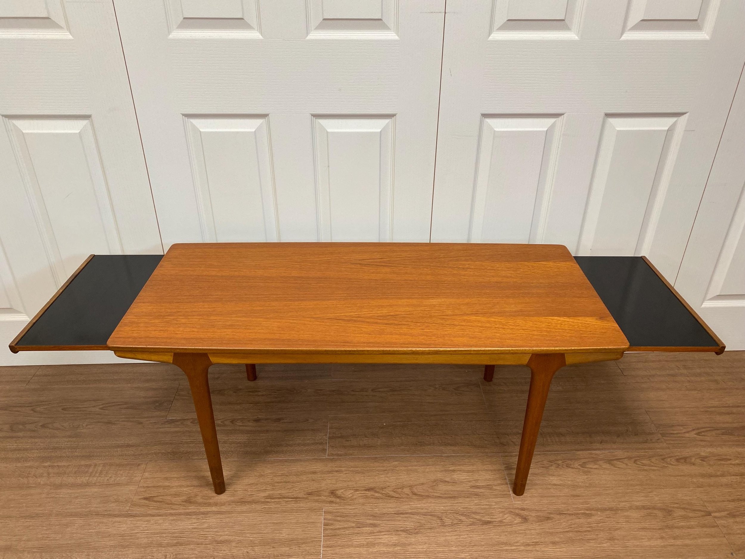 Stunning sleak mid century extending coffee table by McIntosh in an attractive Danish style design Solid teak rectangular table top with two black Formica pull out leaves Tapered legs It has been fully restored; the top has been refinished and the frame has been cleaned, oiled and polished