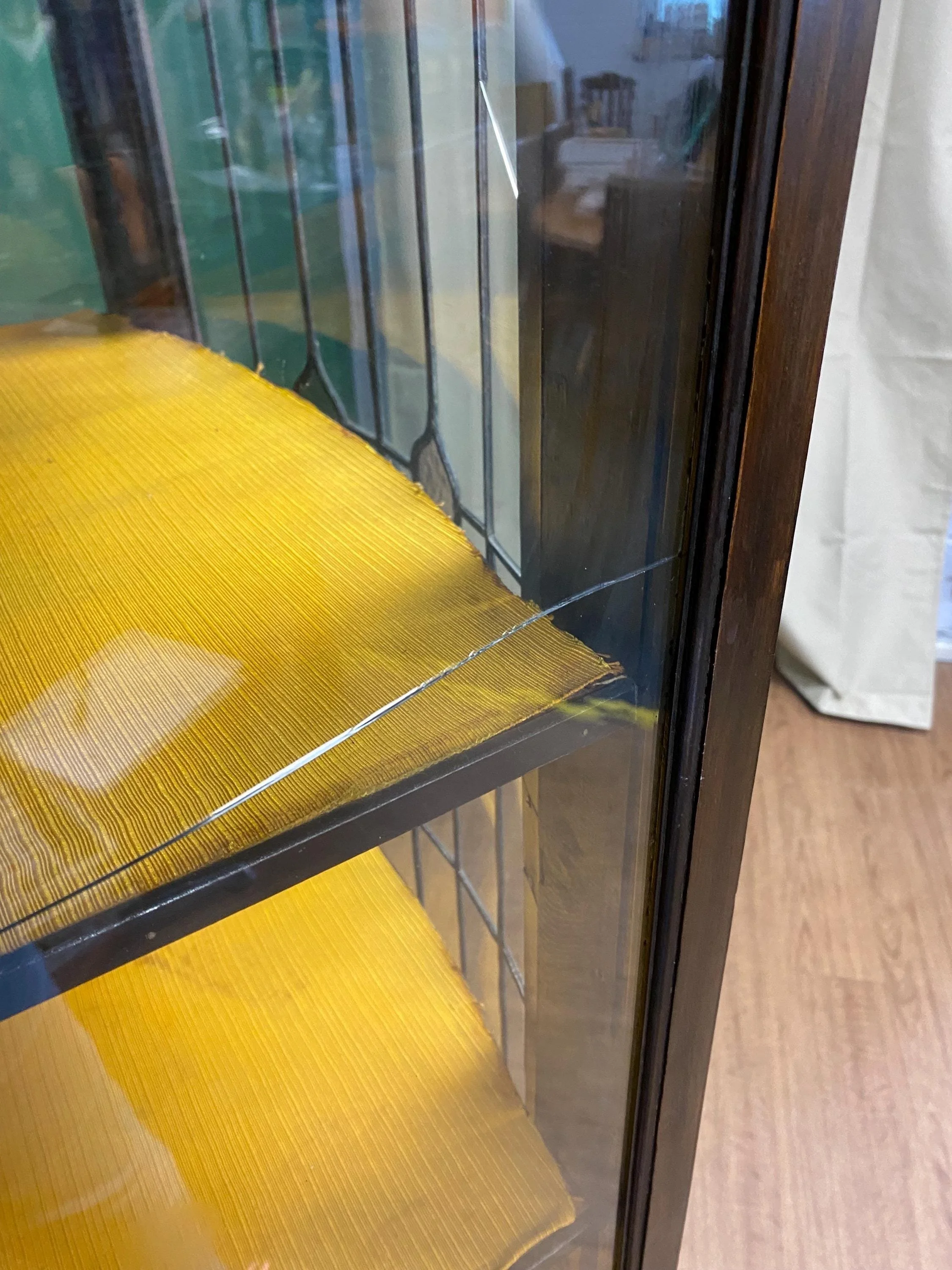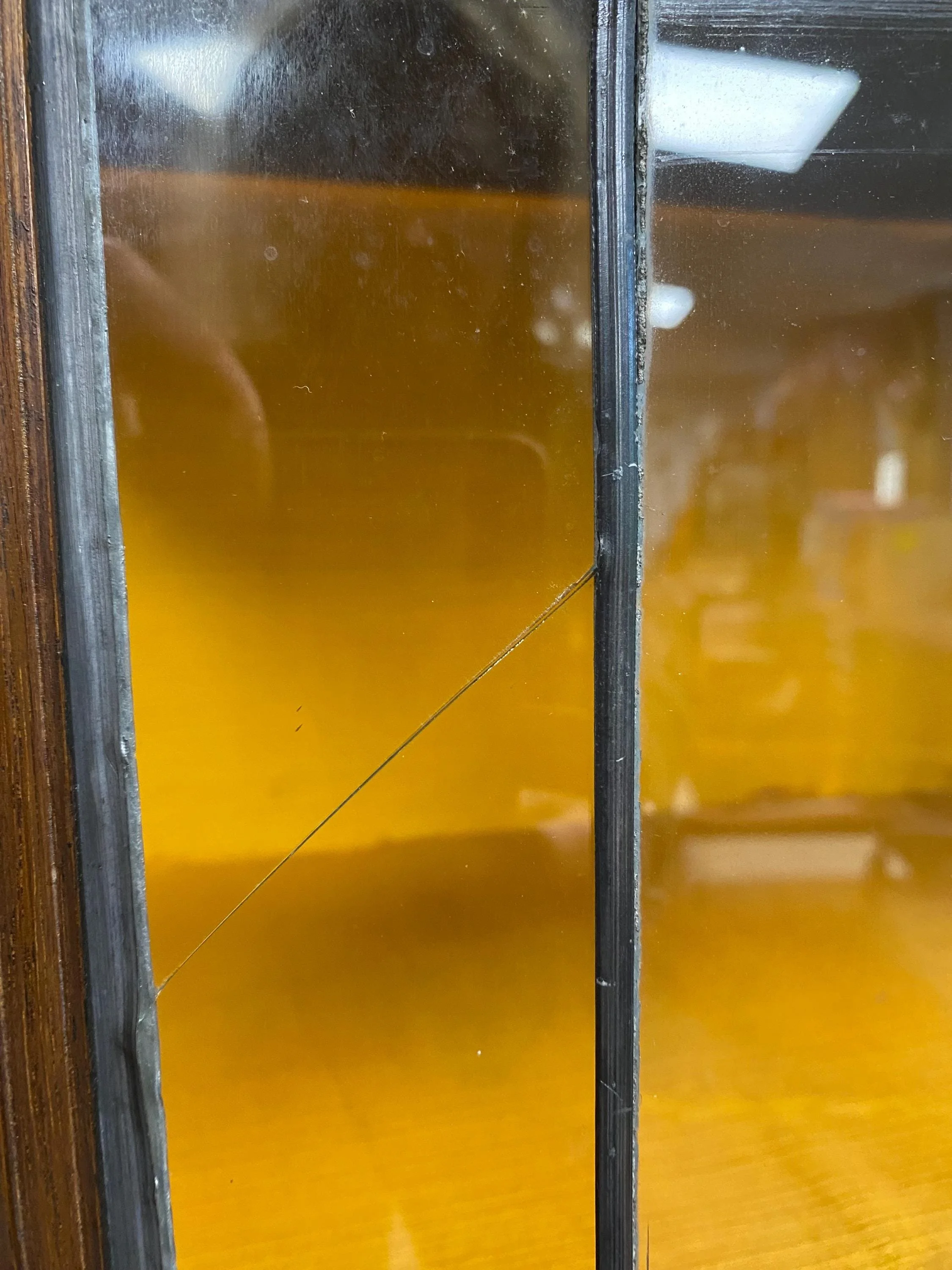 Has been cleaned, oiled and polished. The wood is in beautiful condition. One glazed panel on the side and one on the front has cracked. This item has been priced accordingly.