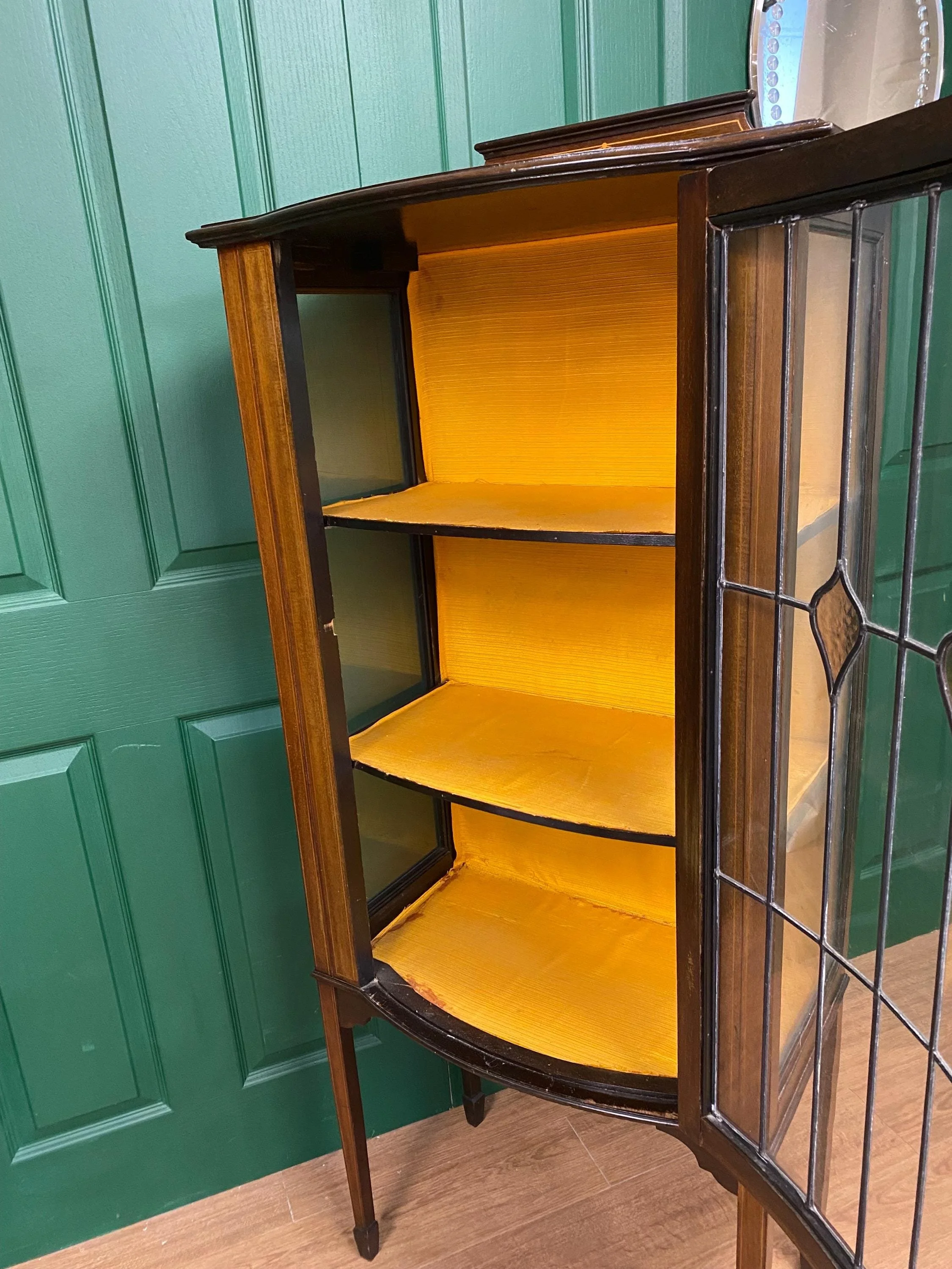 Antique Edwardian Mahogany Inlaid Marquetry Bow Fronted Glazed Display Cabinet with Amber Stained Glass Leaded Glazed Door