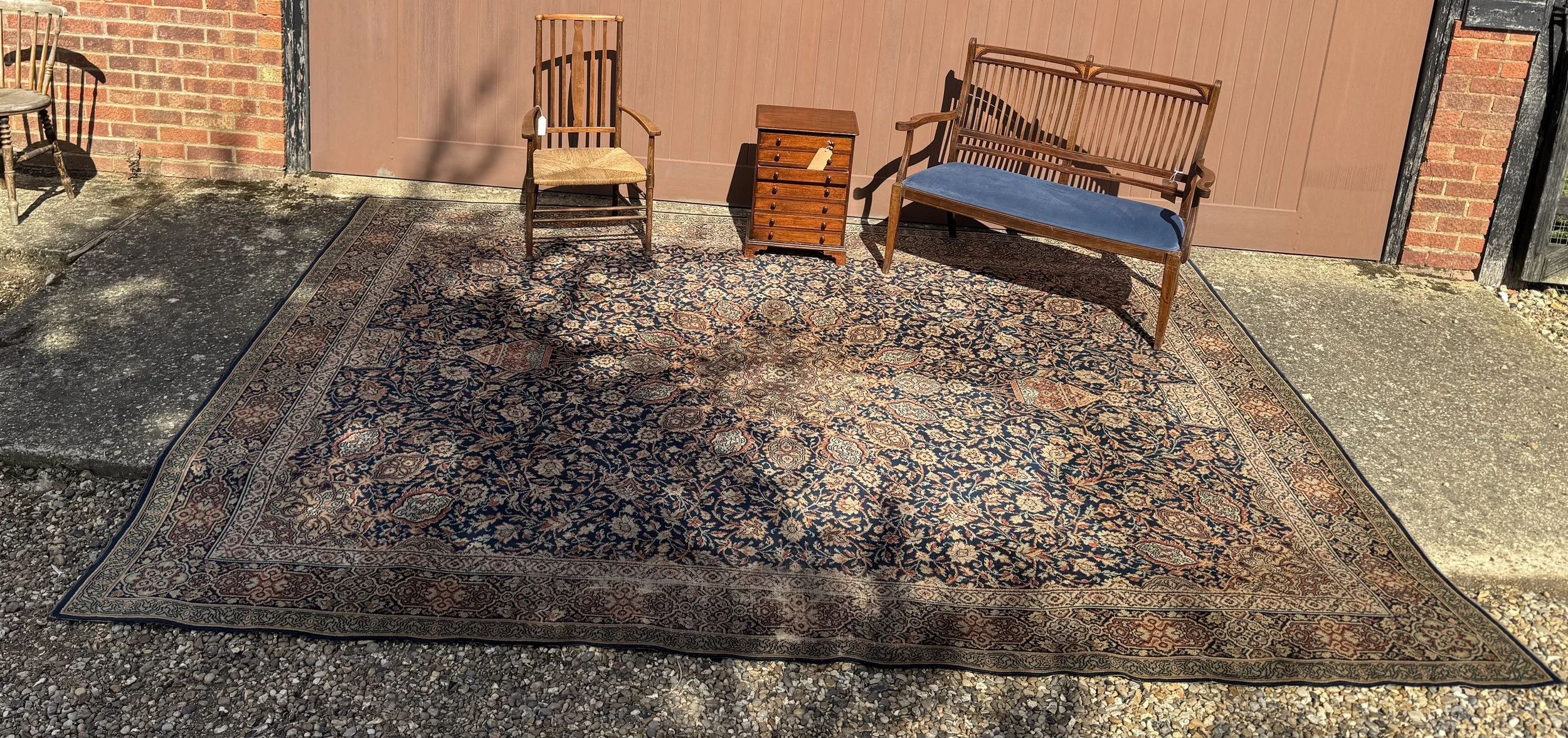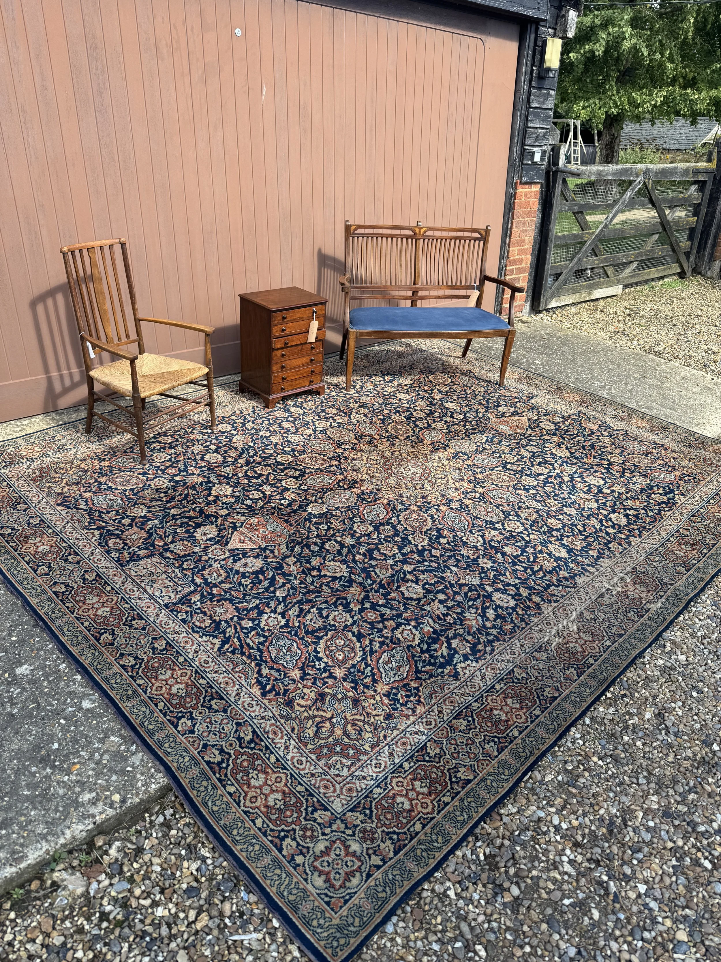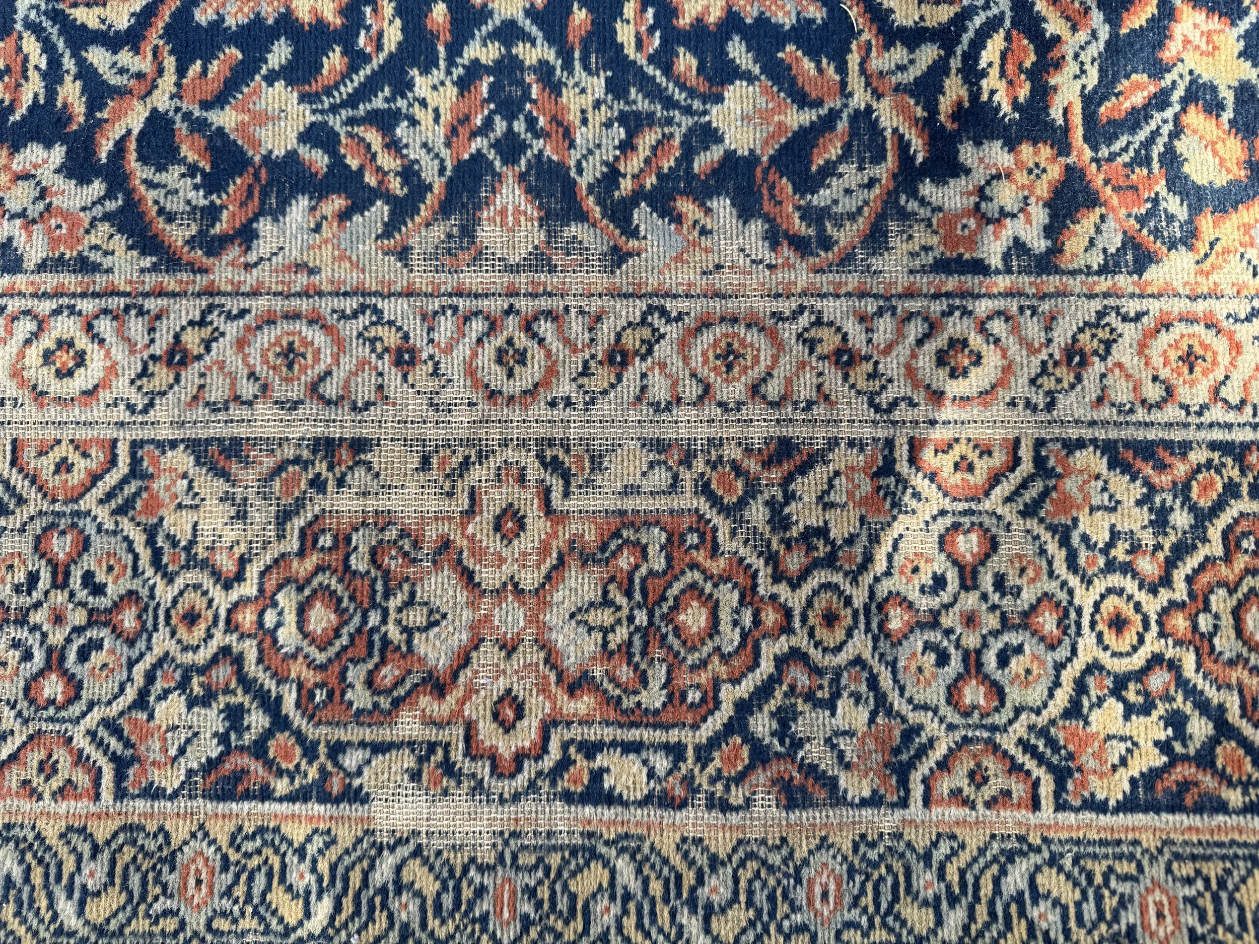 This is an antique knotted wool carpet with a short worn pile, probably very early 20th century or possibly late 19th century. It is a pre-loved rug 2.06m by 1.54m to the edge of the fringing with one visible patch and visible signs of wear but given its age it is in good condition.