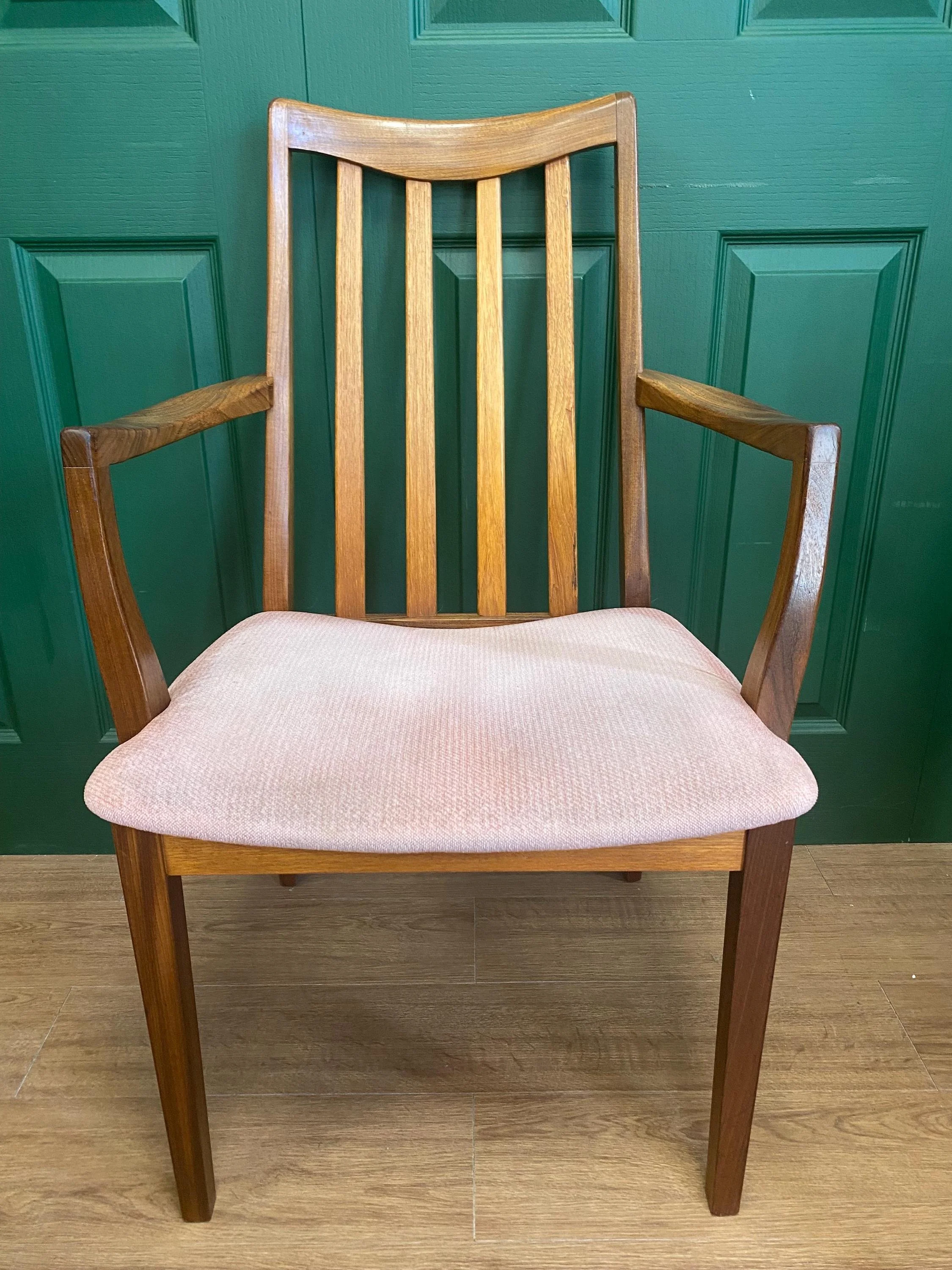 Mid century vintage 1960s G Plan Fresco V Wilkins teak oval extending dining table and six chairs, two carvers