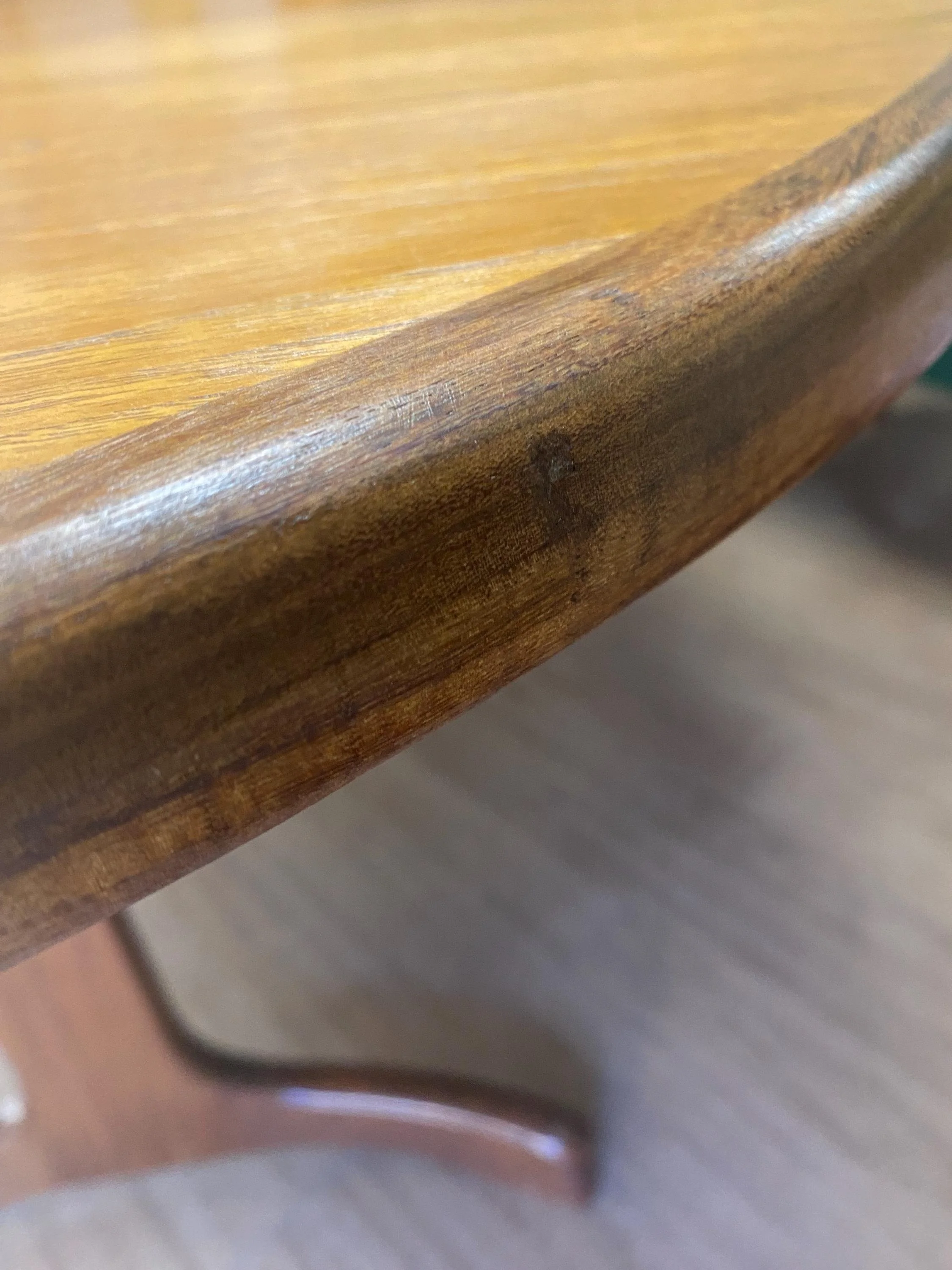 Beautiful wood grain on top of a trestle style base with elegantly curved pedestal legs and cross stretcher