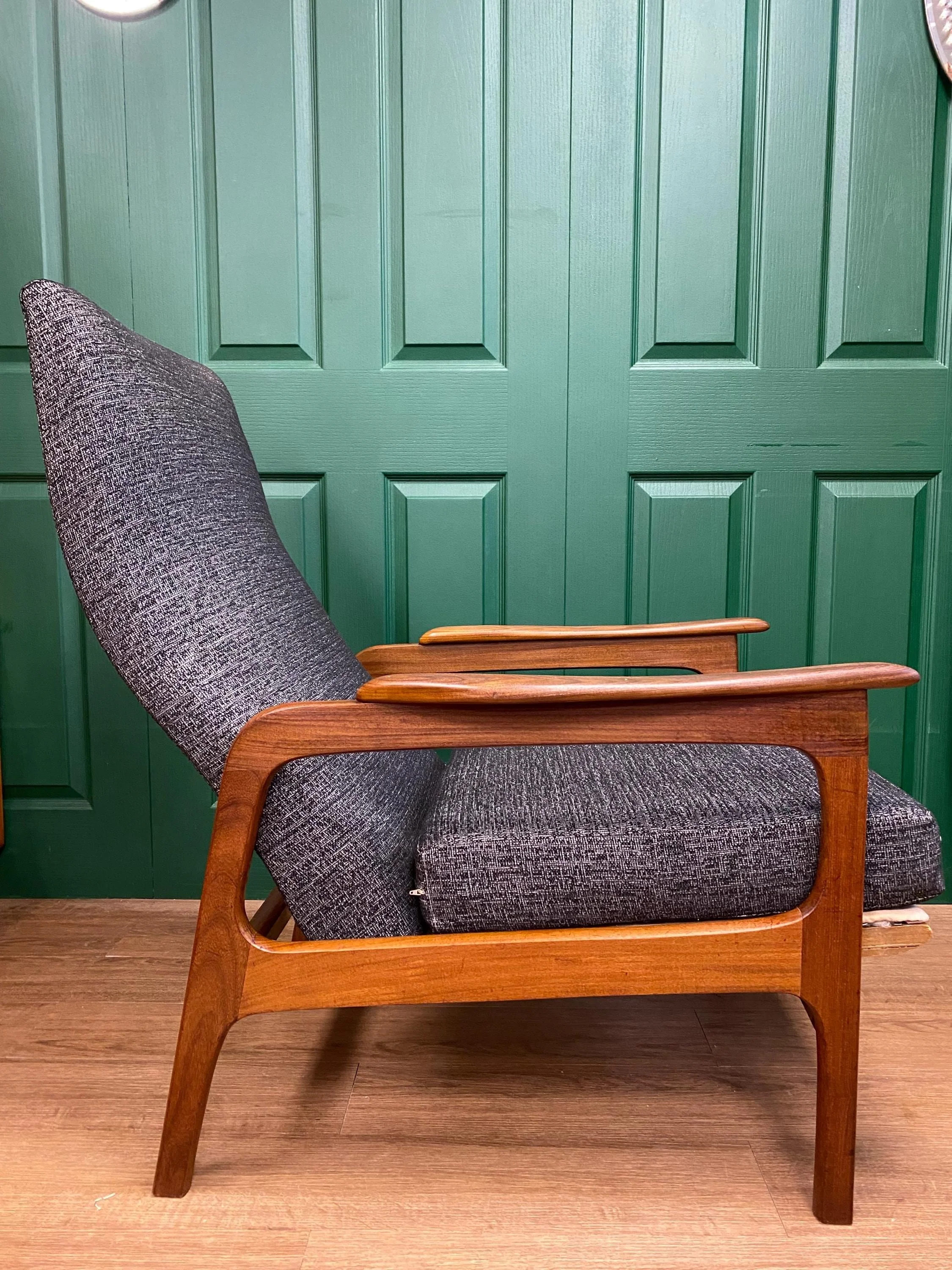 The sleigh style arms ooze mid century charm whilst the high back adds comfort. It has been reupholstered in a dark grey fabric woven with subtle silver flecks that catch and reflect the light, adding a touch of contemporary sophistication while remaining true to its vintage character.