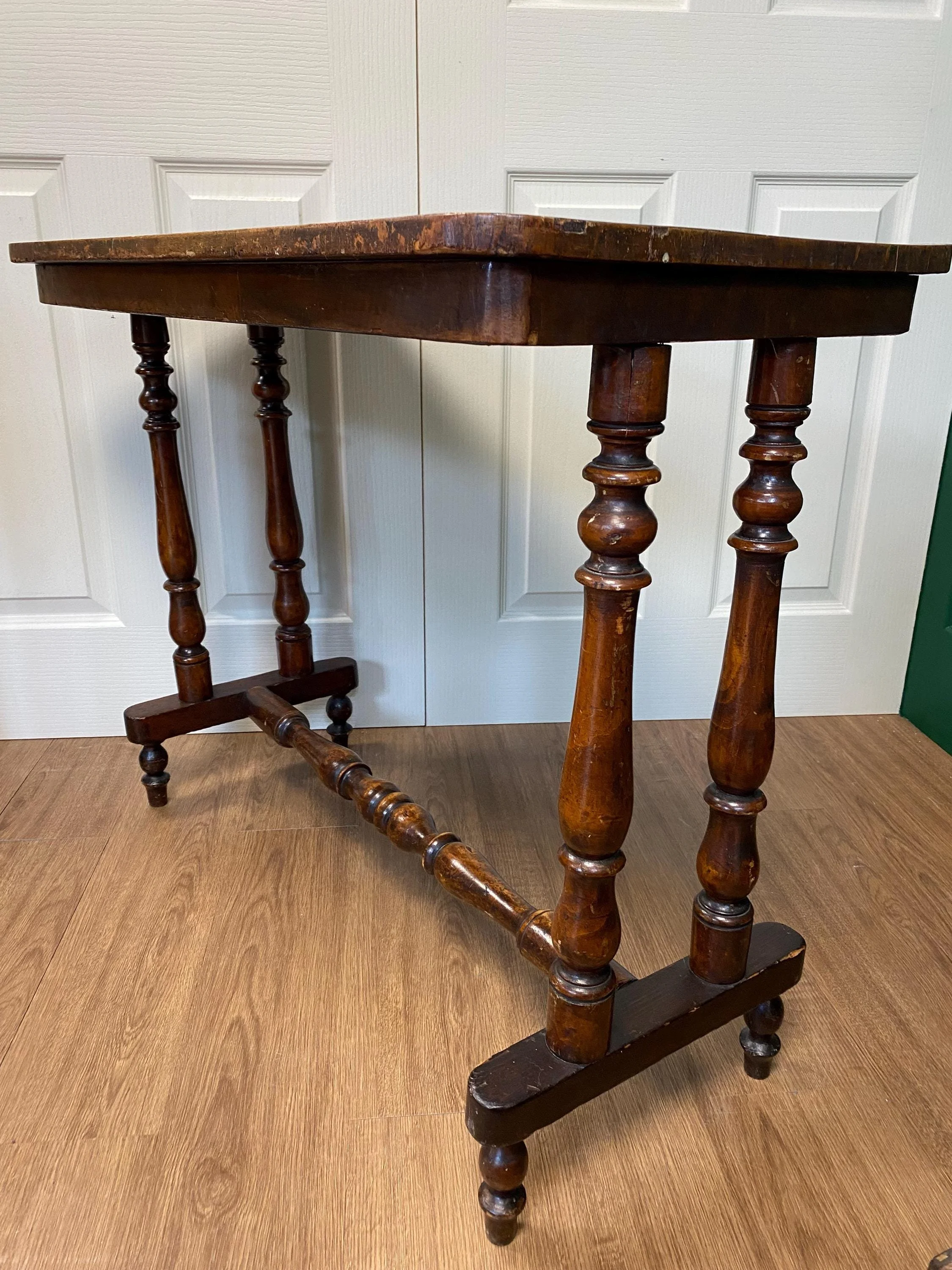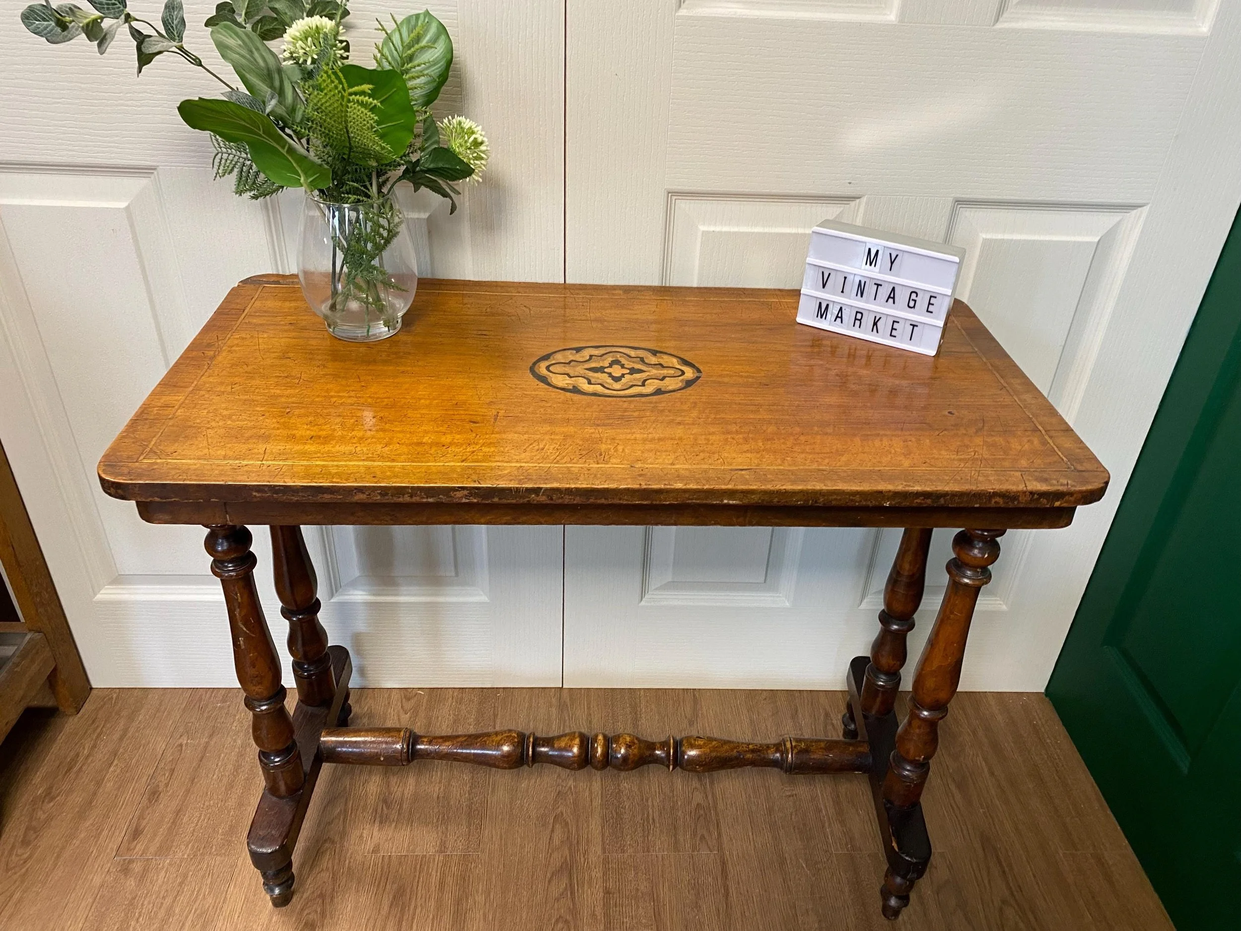 Antique Victorian inlaid mahogany console table with central oval marquetry design Rectangular table on double turned legs with turned stretcher