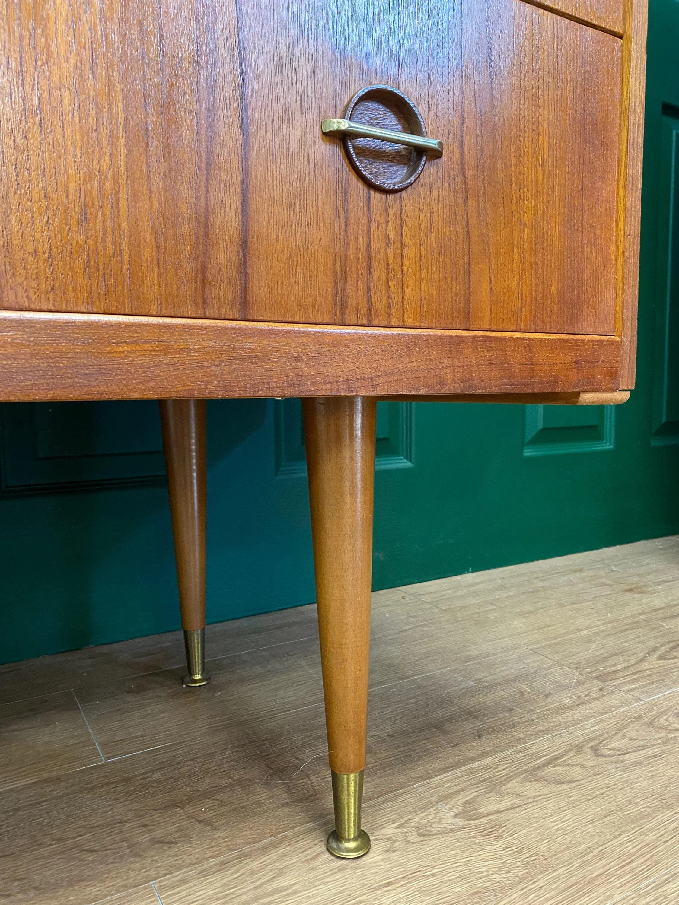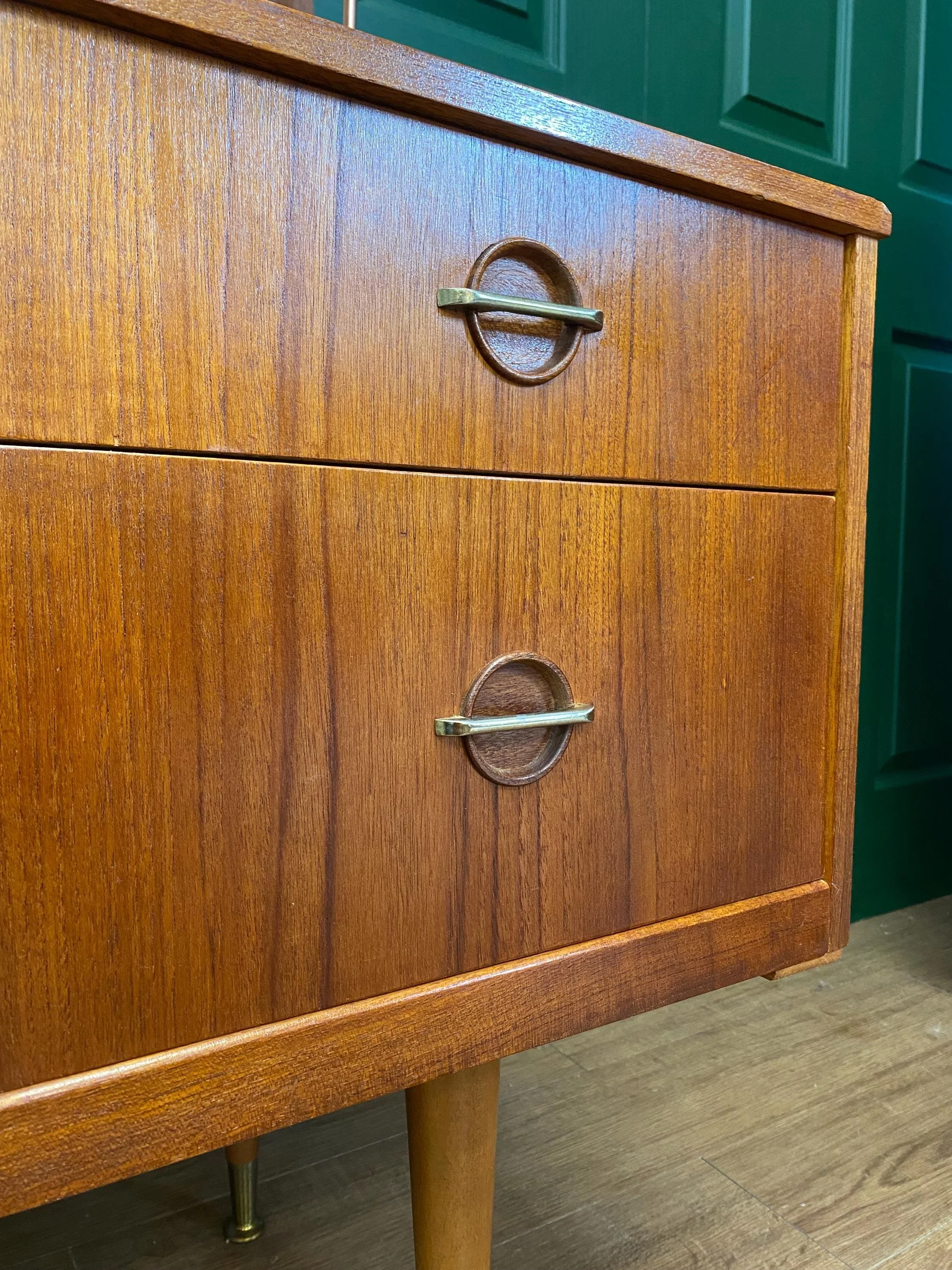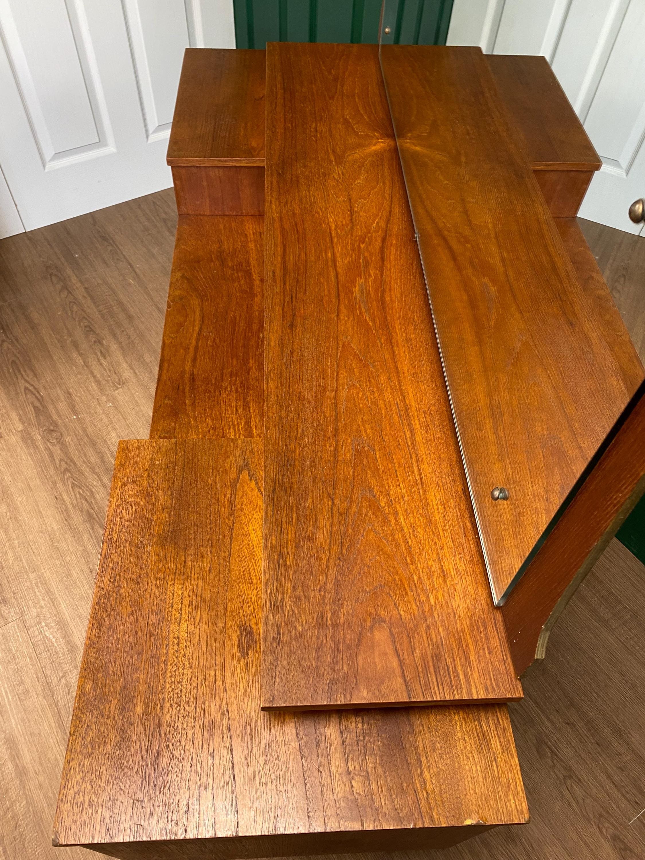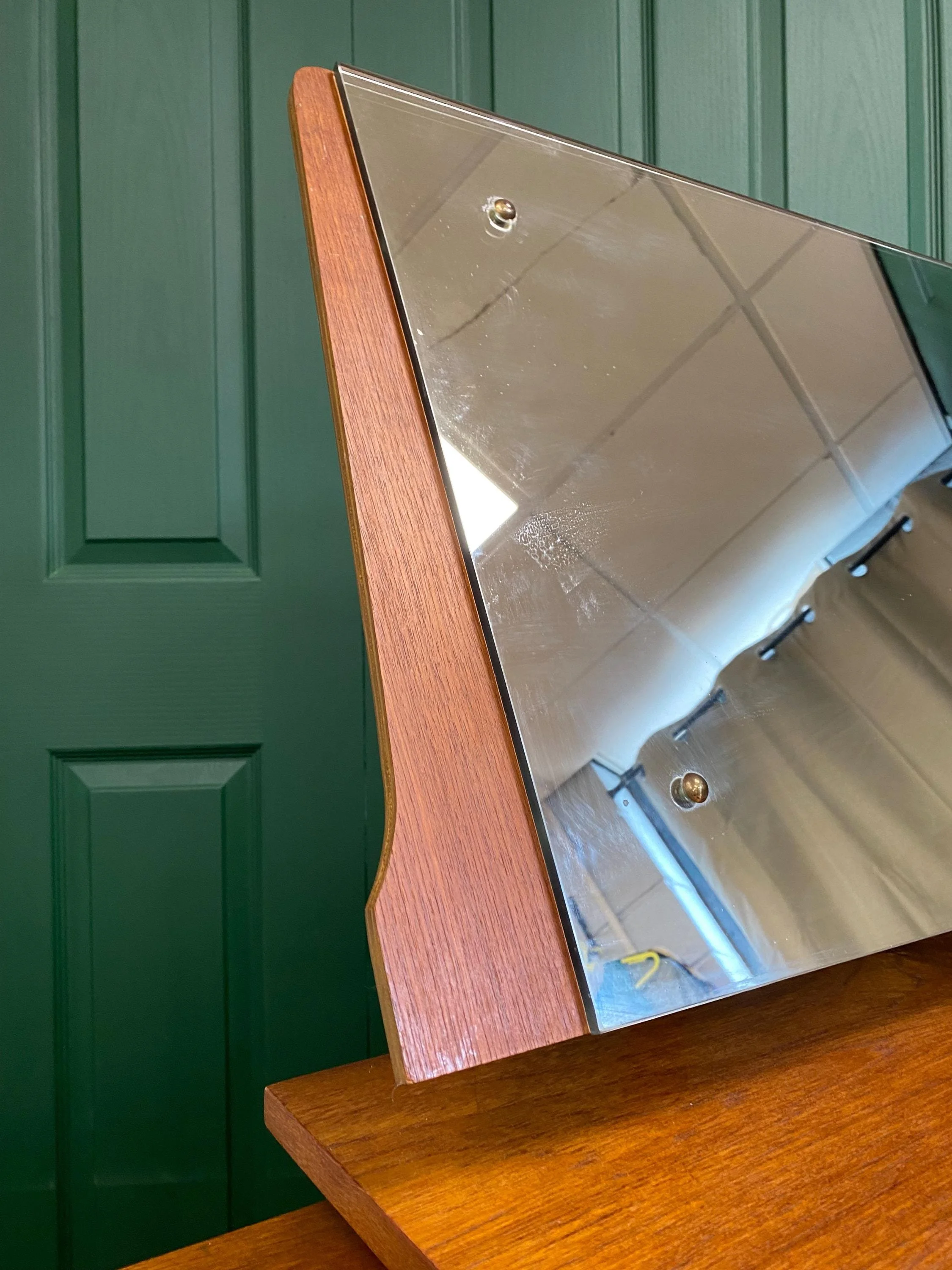 Mid century 1960s teak veneer dressing table with tilting mirror by Austinsuite Six drawers, including one hidden Supported by four tapered legs with brass feet