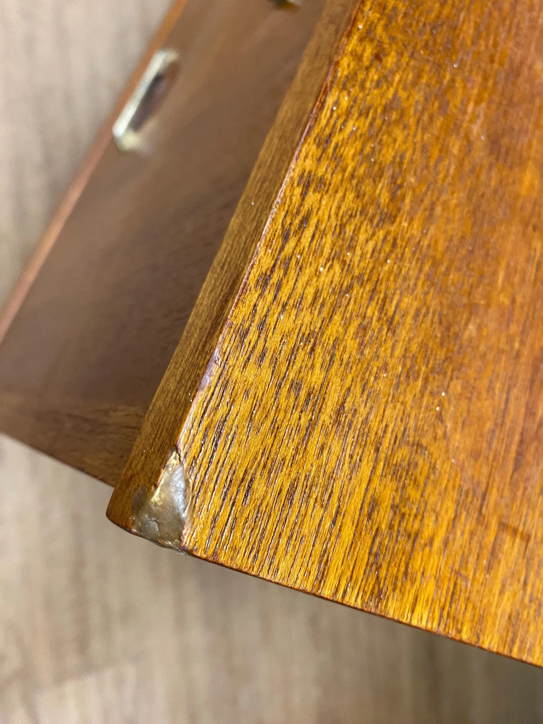Has been refurbished by rubbing down, cleaning, oiling and polishing. The drawers have been oiled using a handmade naturally scented wood balm.