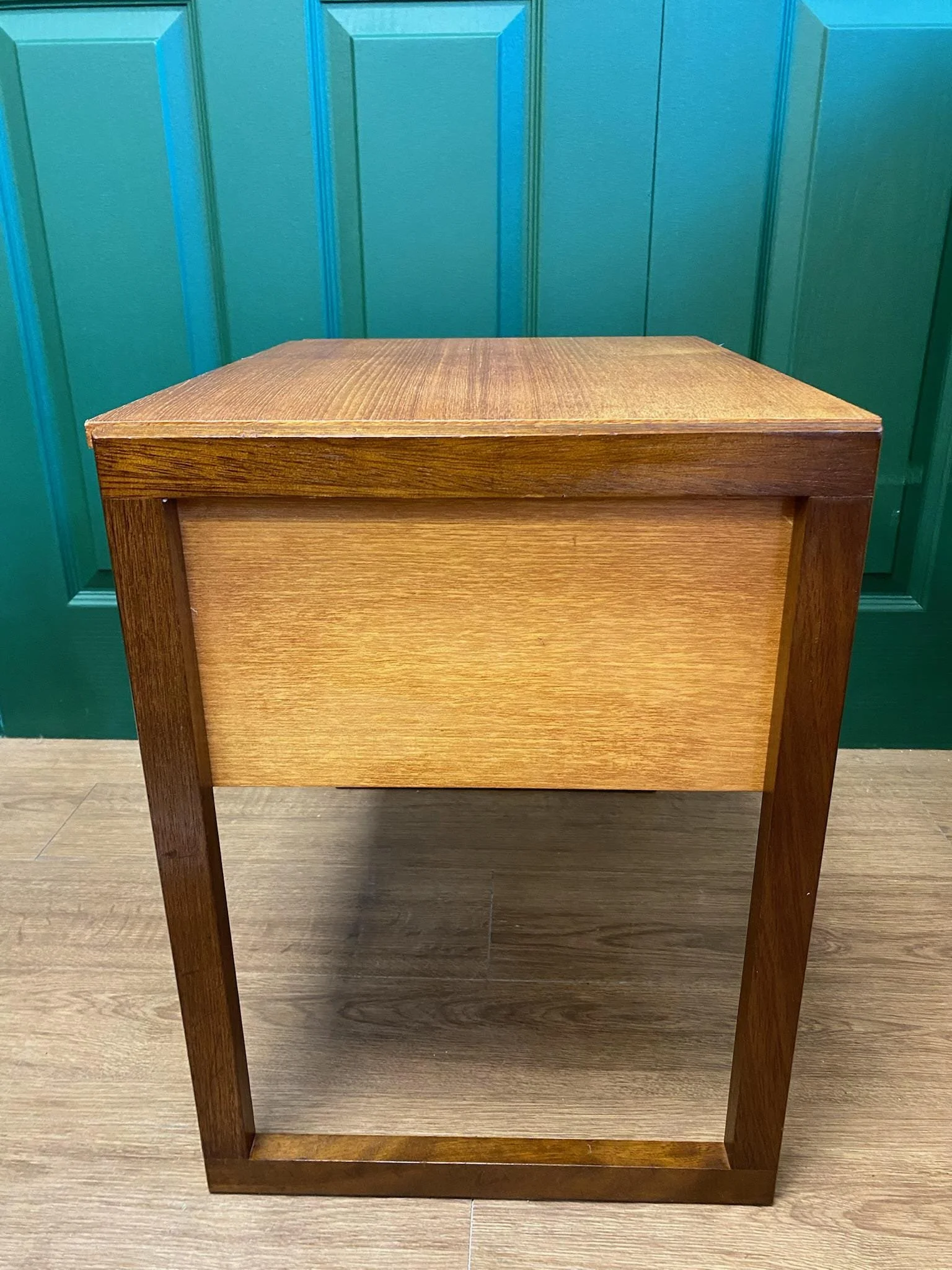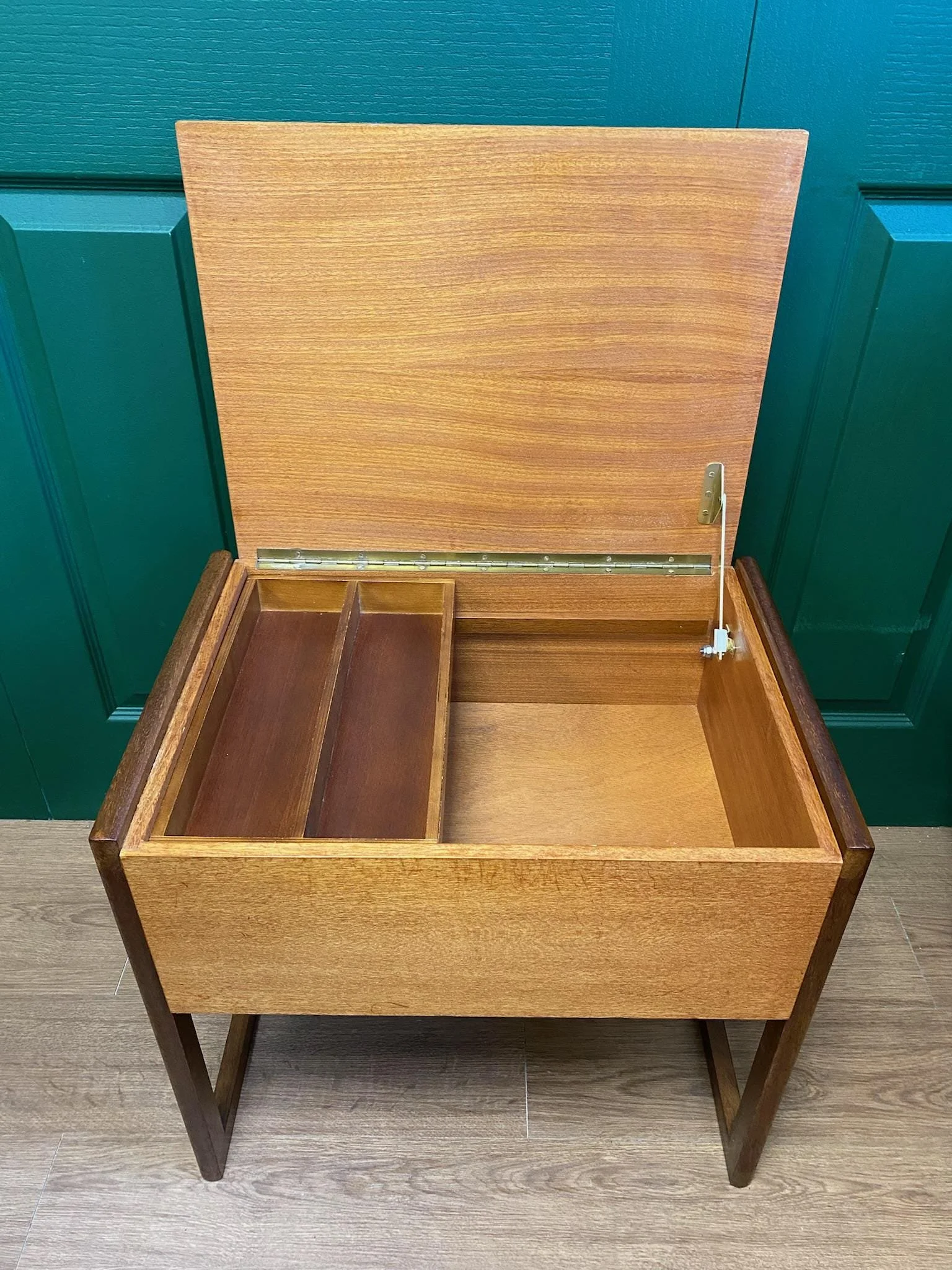 Mid century 1960s teak sewing box Teak veneer on solid teak quadrille legs Lift up lid with removable storage tray