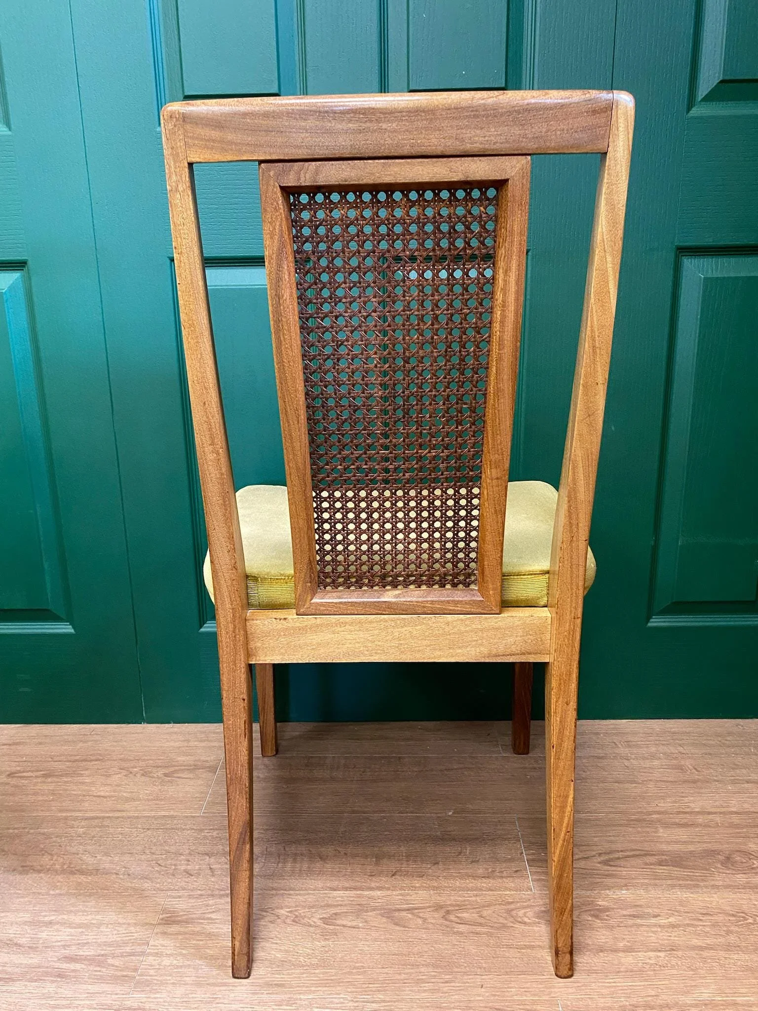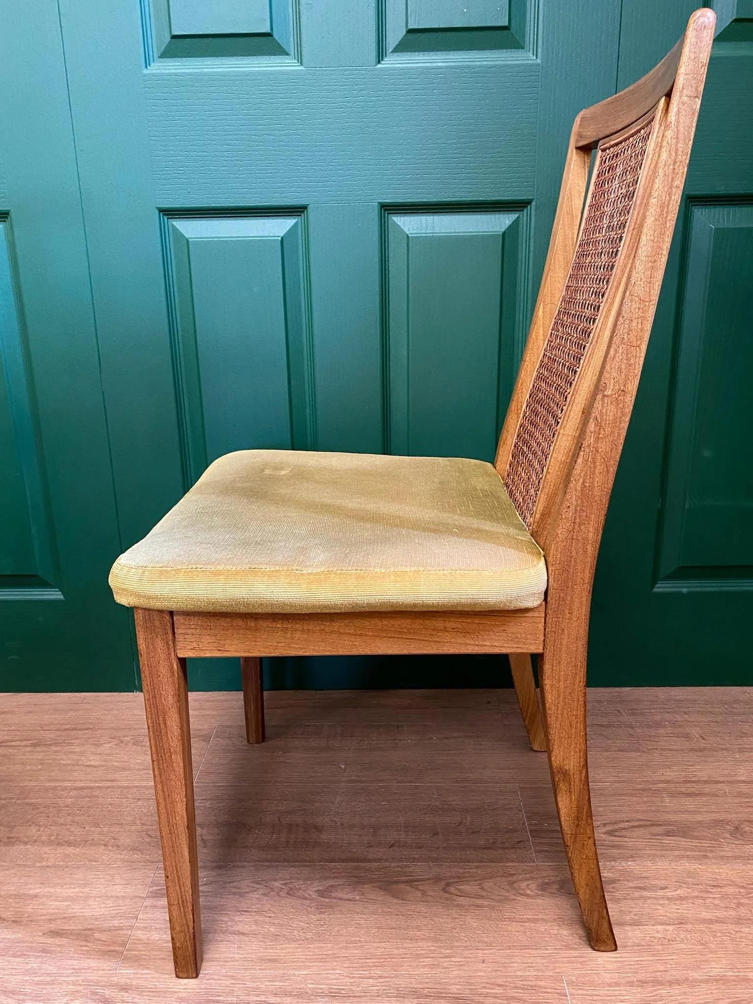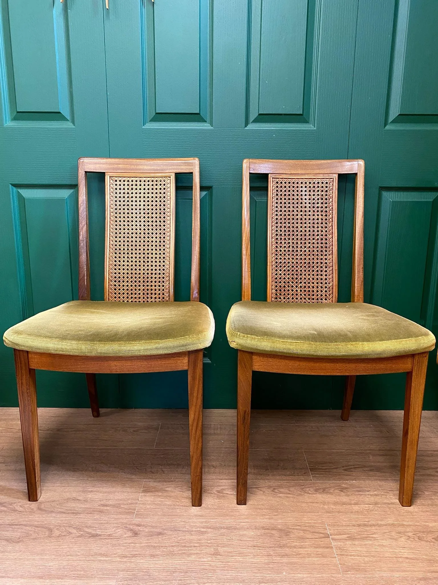Pair of mid century teak G Plan Fresco dining chairs with basket weave cane backs Solid teak frame with basket weave cane back Original green seat cushions
