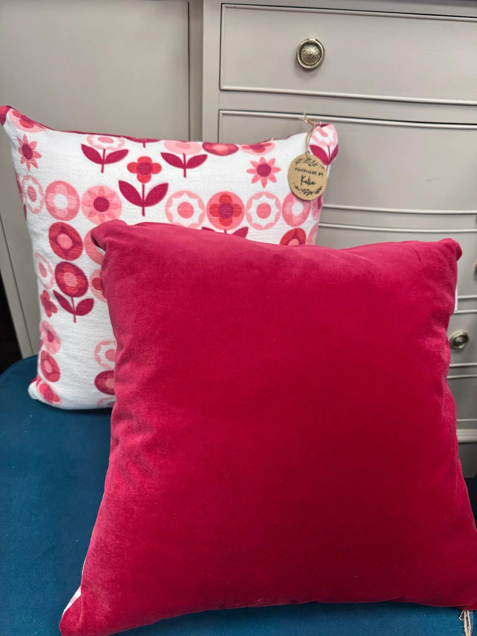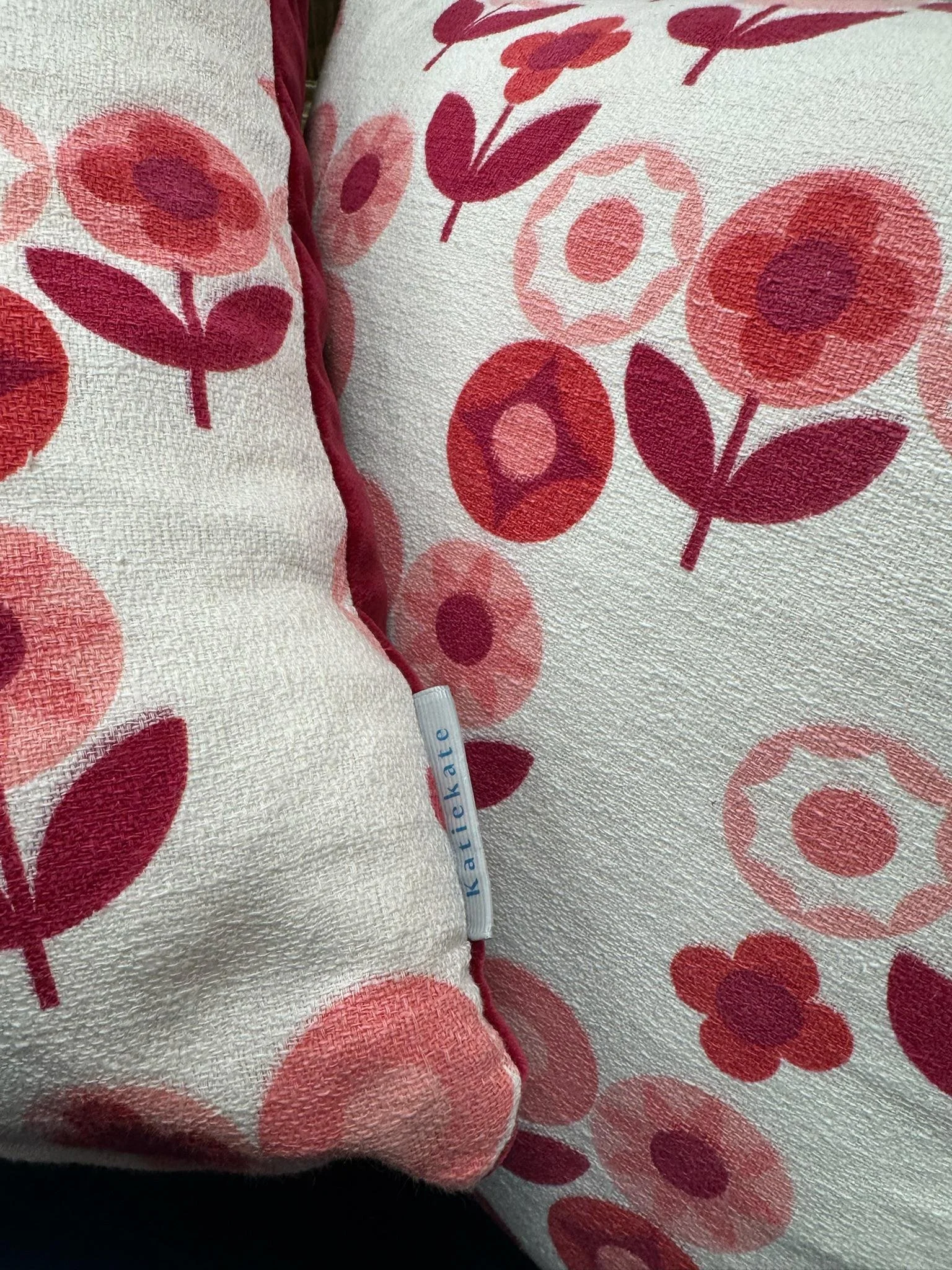 Pink floral midcentury vintage fabric repurposed into a cushion with a new pink fabric reverse side.