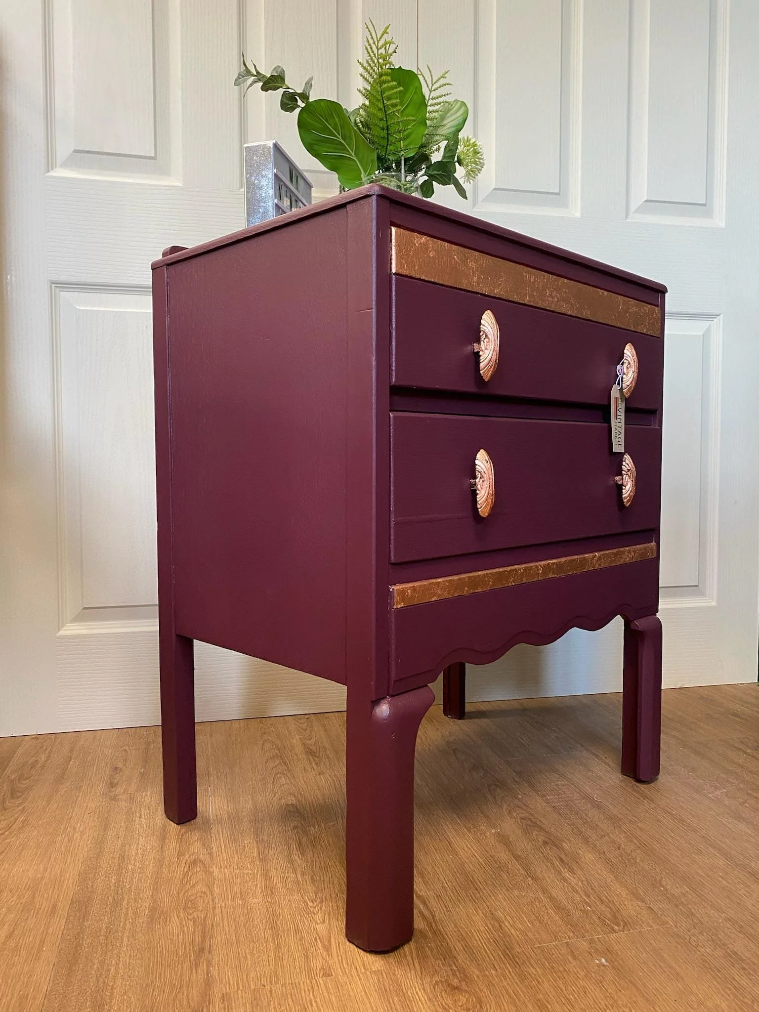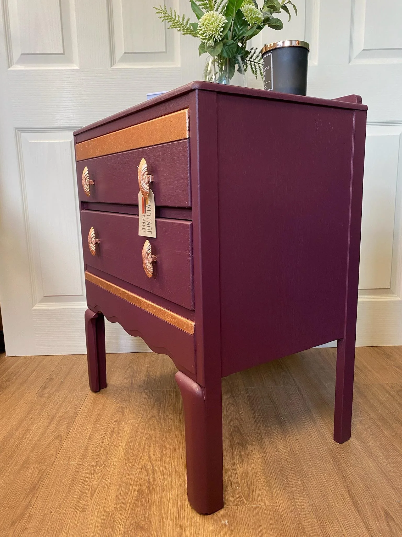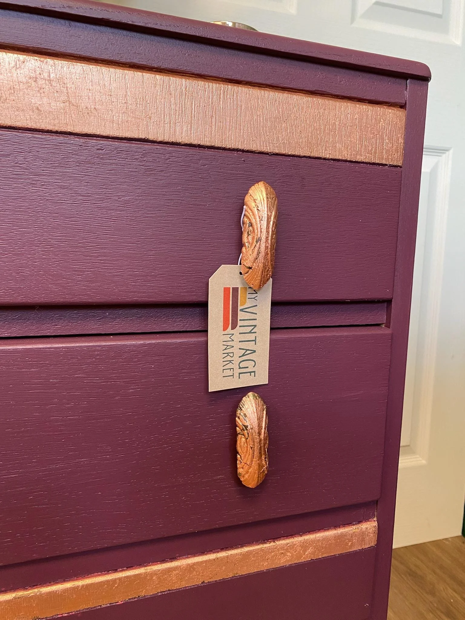 Refurbished 1940s chest of drawers in aubergine with copper highlights