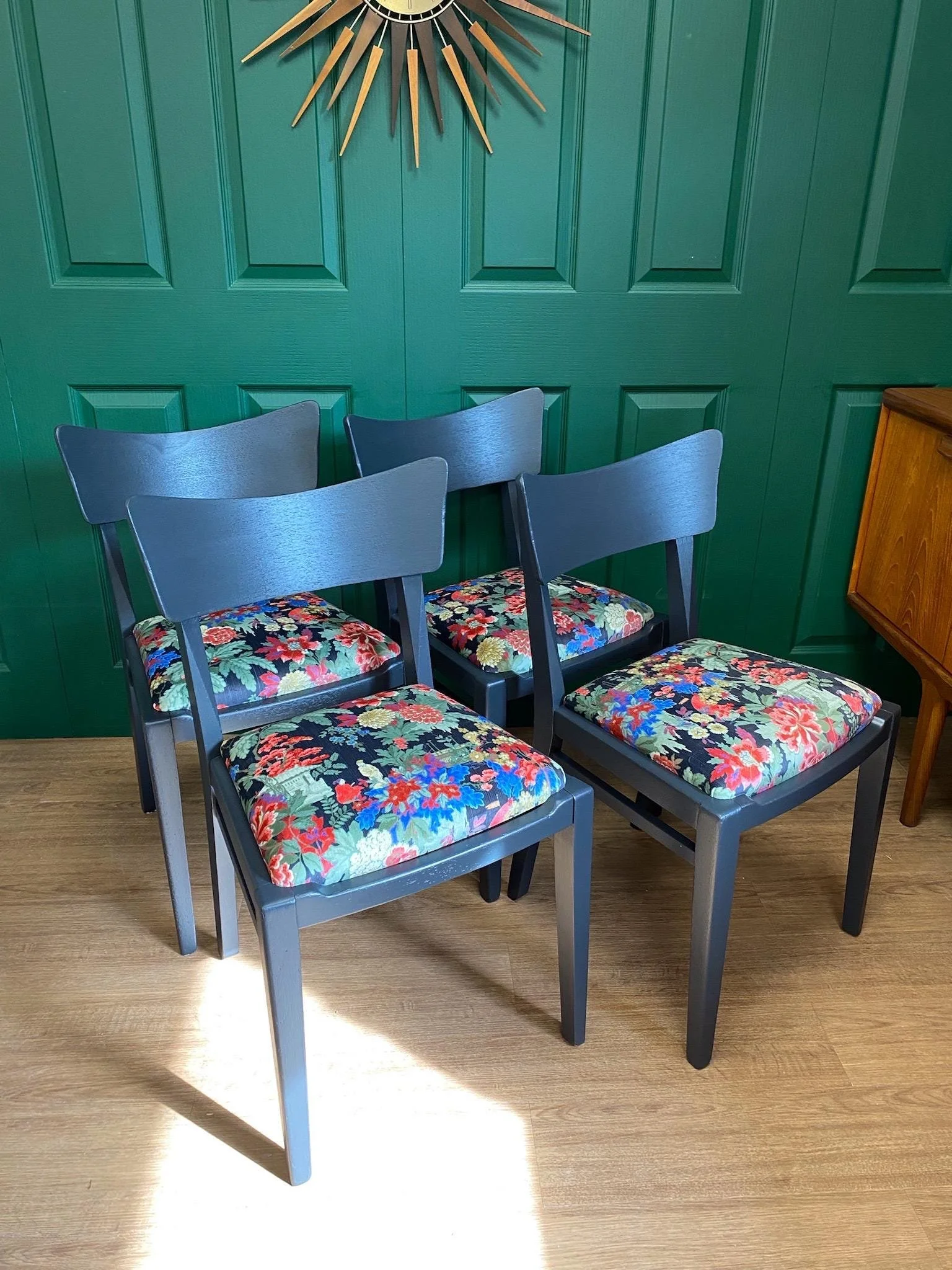 The four butterfly style chairs have been painted and sealed in the same ash grey. The seat cushions have been upholstered in a bright plush oriental patterned fabric, compliant with fire regulations.