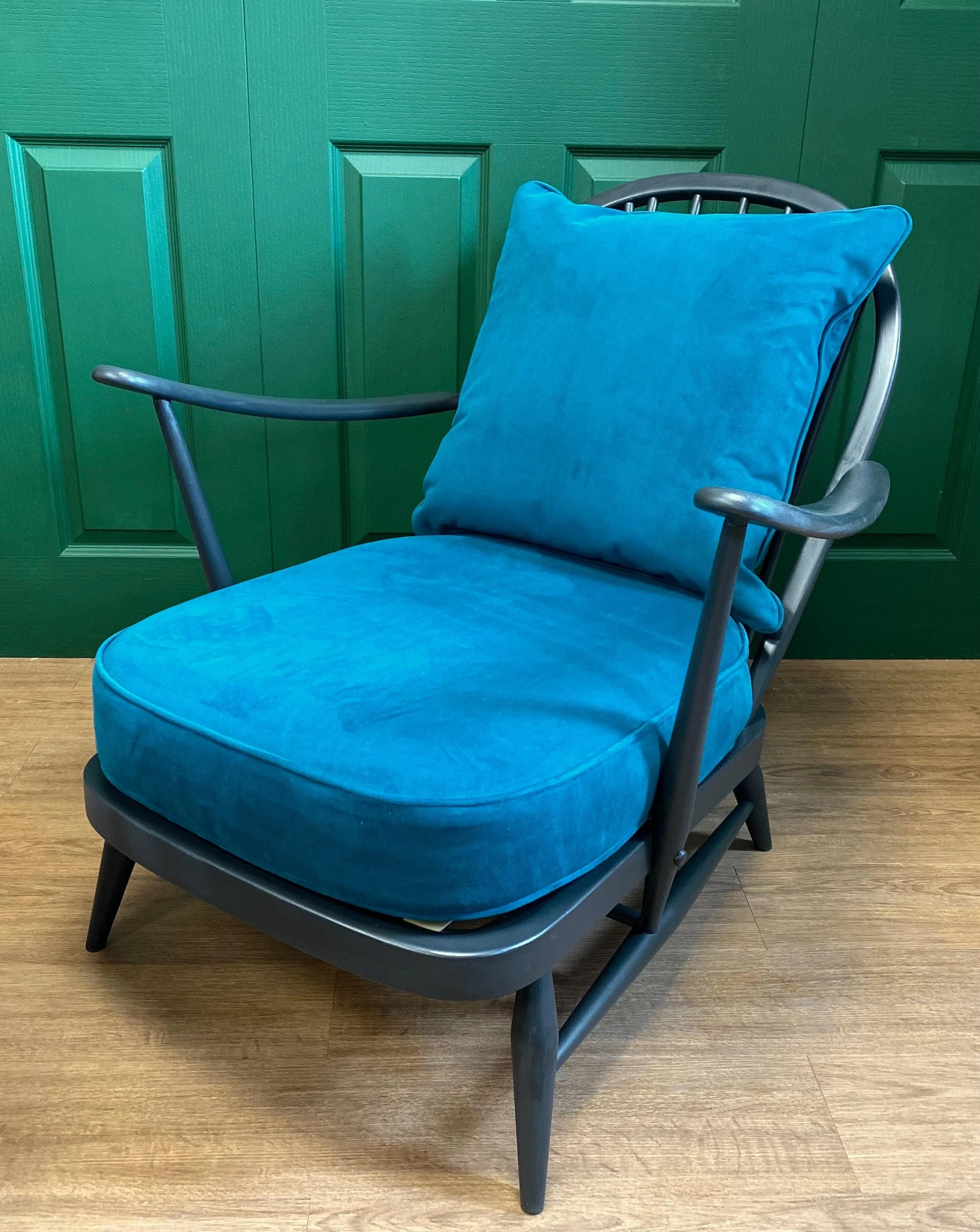 Mid century Ercol Windsor armchair Timeless elegant design Has been refurbished and reupholstered in a modern style The frame has been hand painted in a dark ash grey The foam and base straps have been replaced and it has been upholstered in a rich teal blue green velvet fabric. The original back cushions have been replaced with a scatter cushion for a more up to date look.