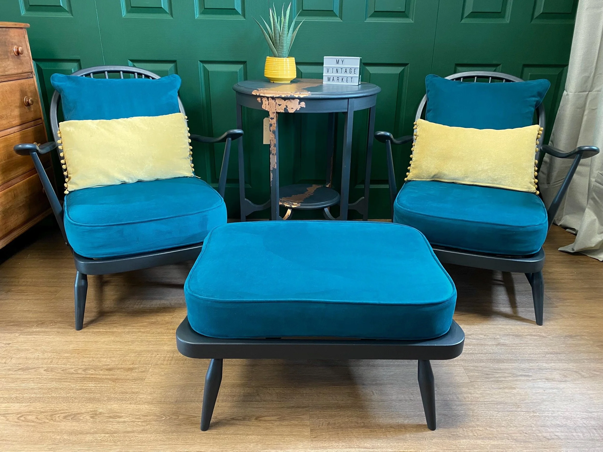 Refurbished mid century vintage Ercol Windsor armchair grey teal blue green velvet 1 of 2