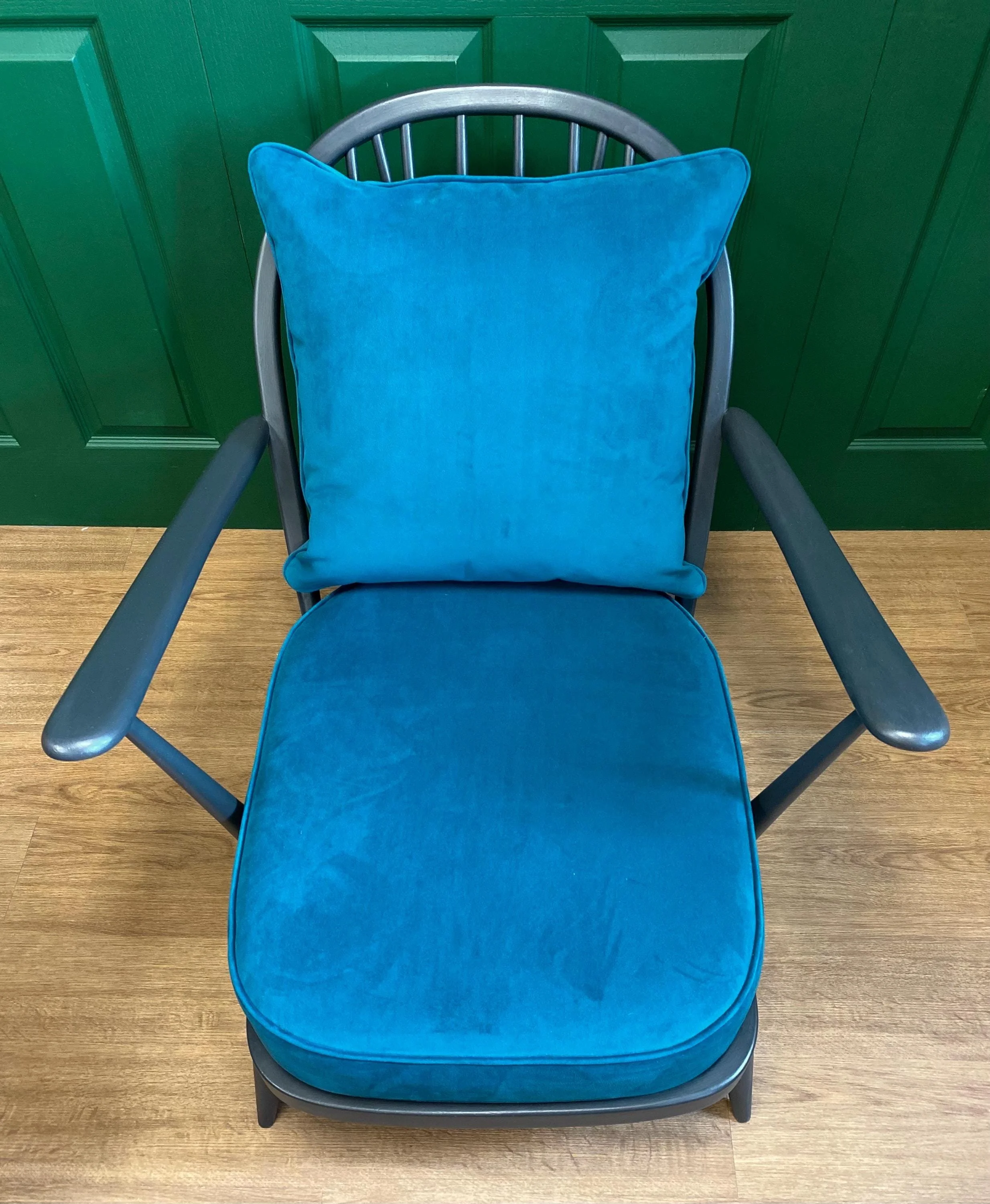 Mid century Ercol Windsor armchair Timeless elegant design Has been refurbished and reupholstered in a modern style The frame has been hand painted in a dark ash grey The foam and base straps have been replaced and it has been upholstered in a rich teal blue green velvet fabric. The original back cushions have been replaced with a scatter cushion for a more up to date look.