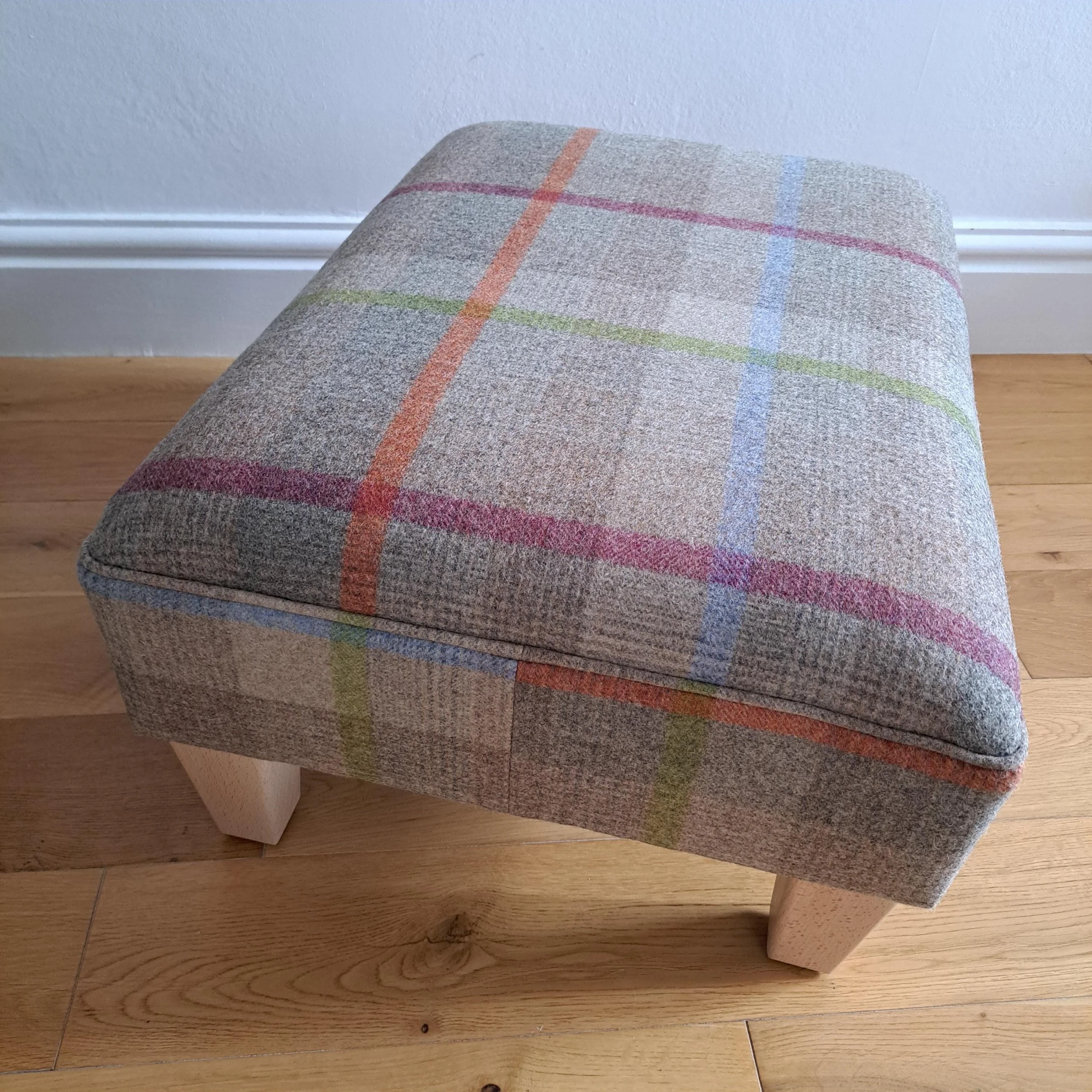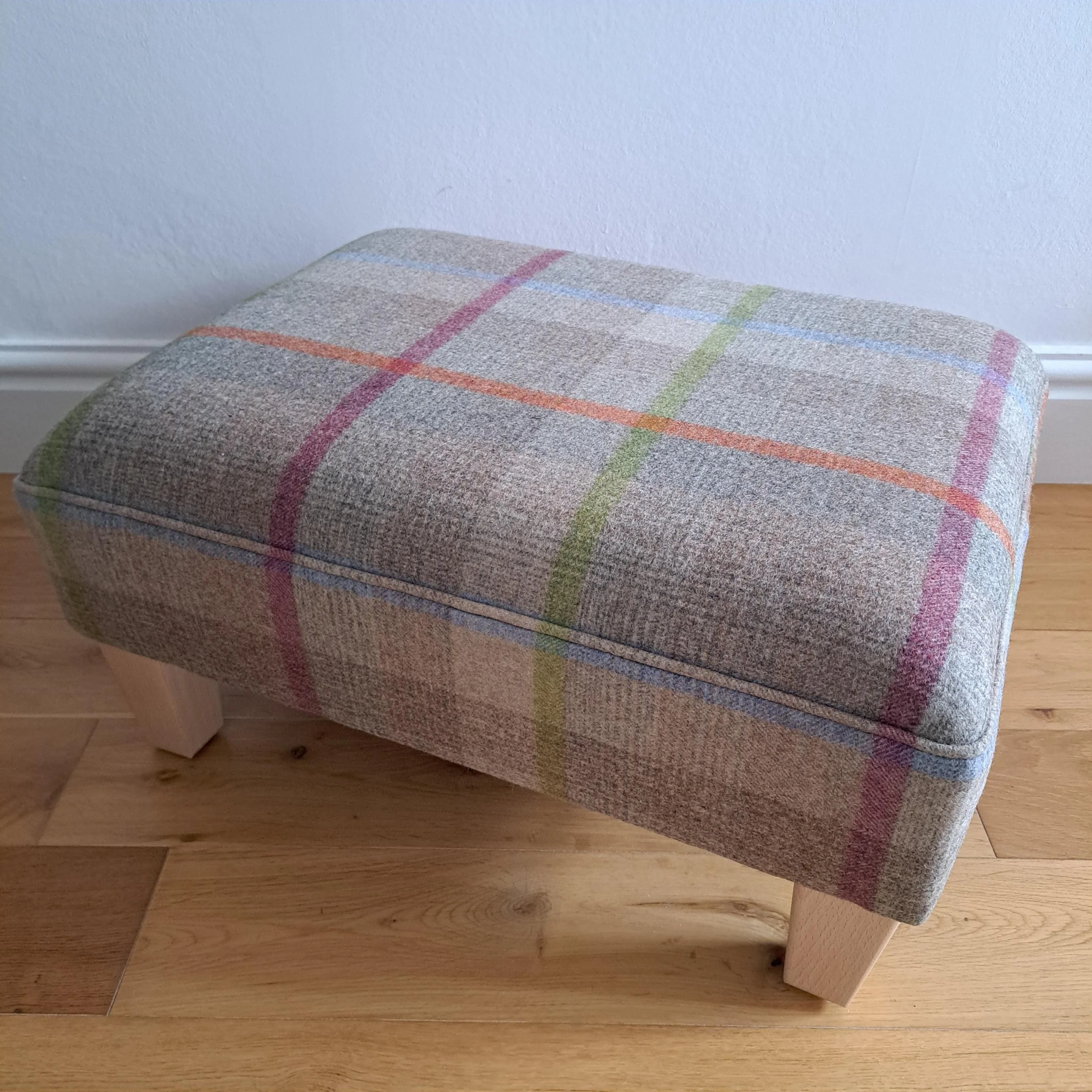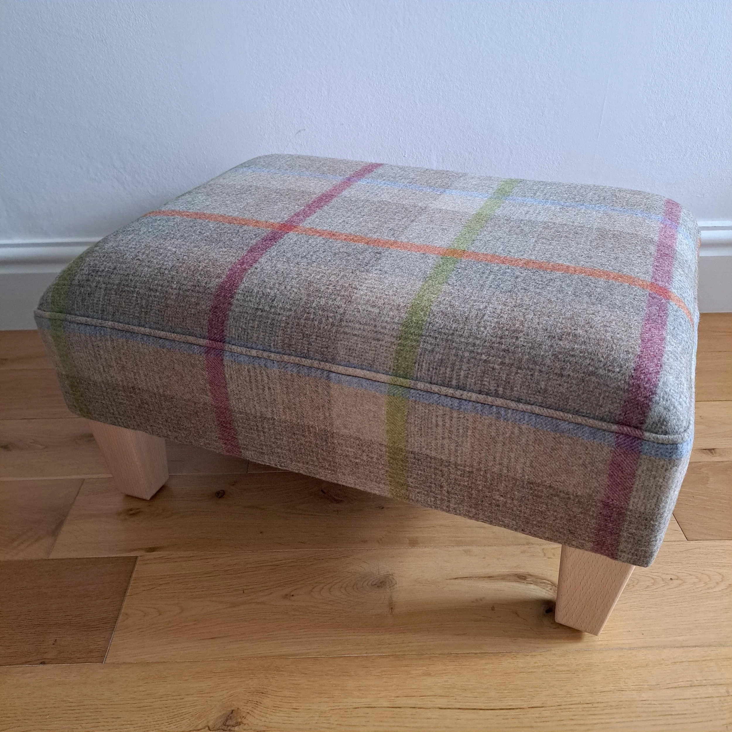 This gorgeous footstool has been reupholstered with a 100% wool check from Abraham Moon & Sons. Grey with purple, green, blue and burnt orange accents The perfect height for your feet or a tray with tea & scones! Dimensions: 62 x 46cm, 31cm high Fabric Information: Fully complies with UK Fire Regulations.