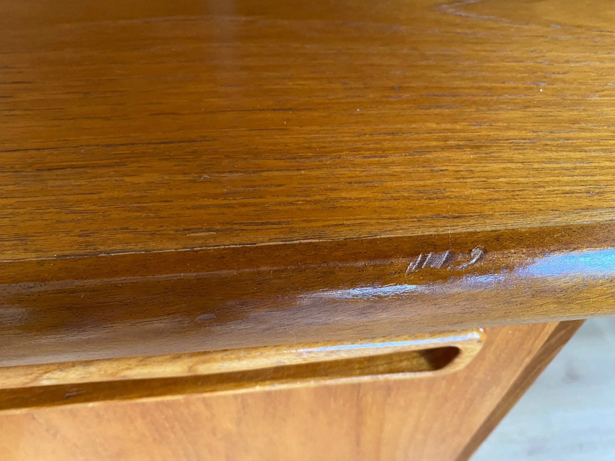A solid mid century piece in great condition. It has been restored by rubbing down, oiling and polishing. There are some small scuffs, as expected for its age, and a veneer repair on the right side of the base, see photos. Two small holes in the back for wires when it was previously used as a media unit. Otherwise in good condition.