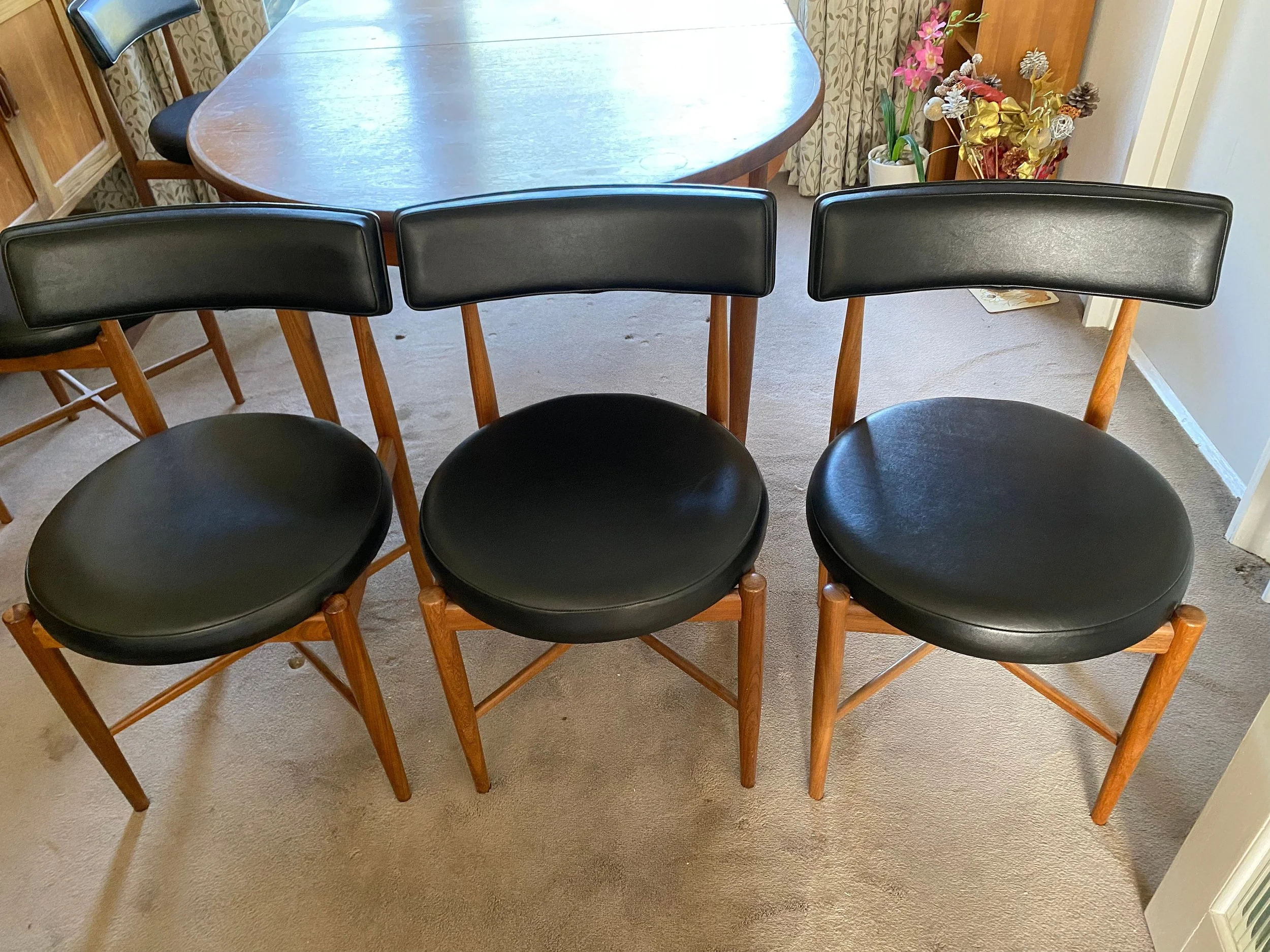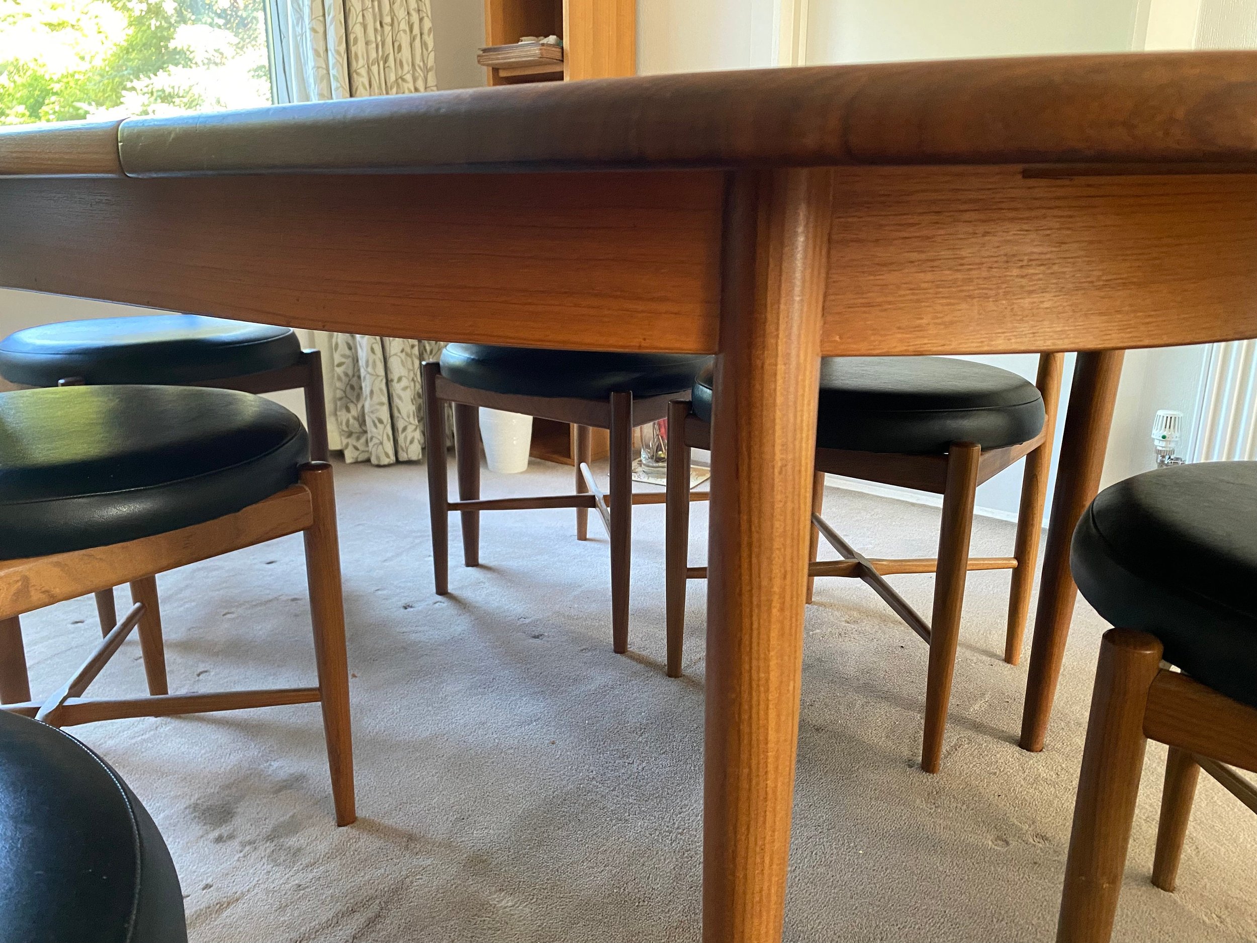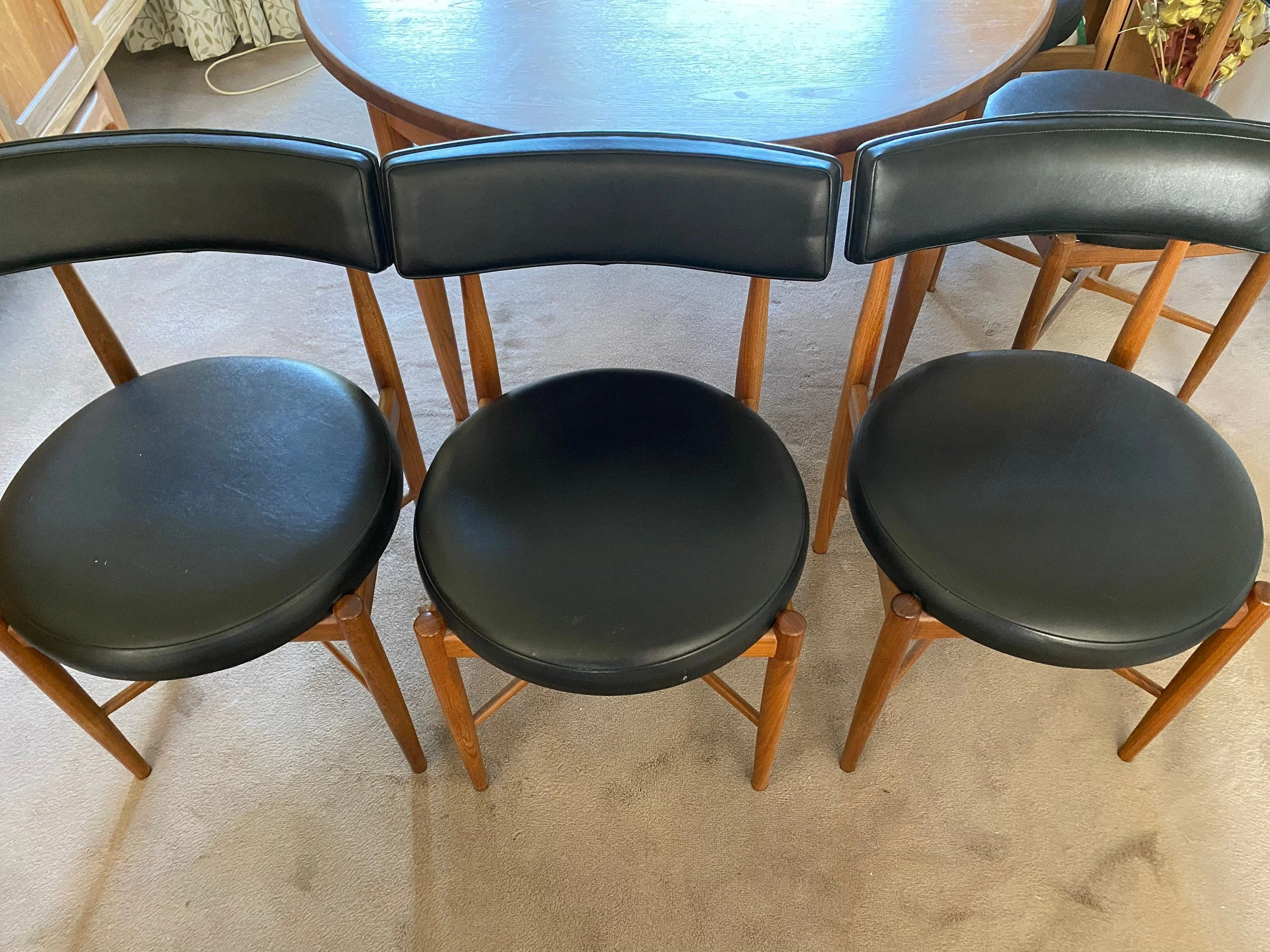 Teak and afromosia extending oval dining table and six chairs by G Plan From the Fresco range by Victor Wilkins Elegant tapered legs Comes with six original fresco G Plan dining chairs in solid teak with the original black faux leather upholstery. Sleek Danish style design, especially the chairs, with their circular seats, tilted back and cross stretcher legs.