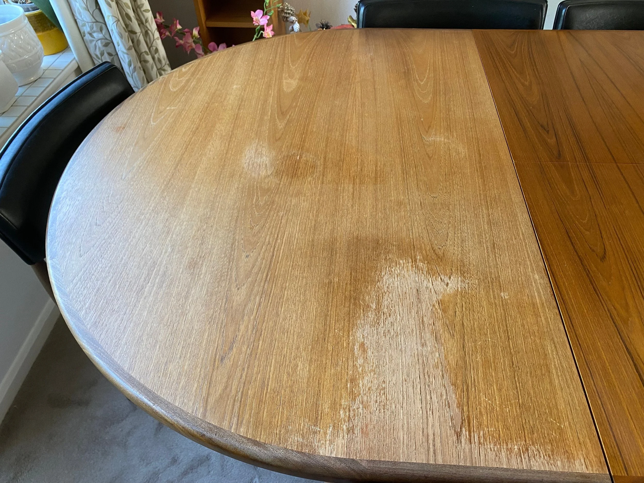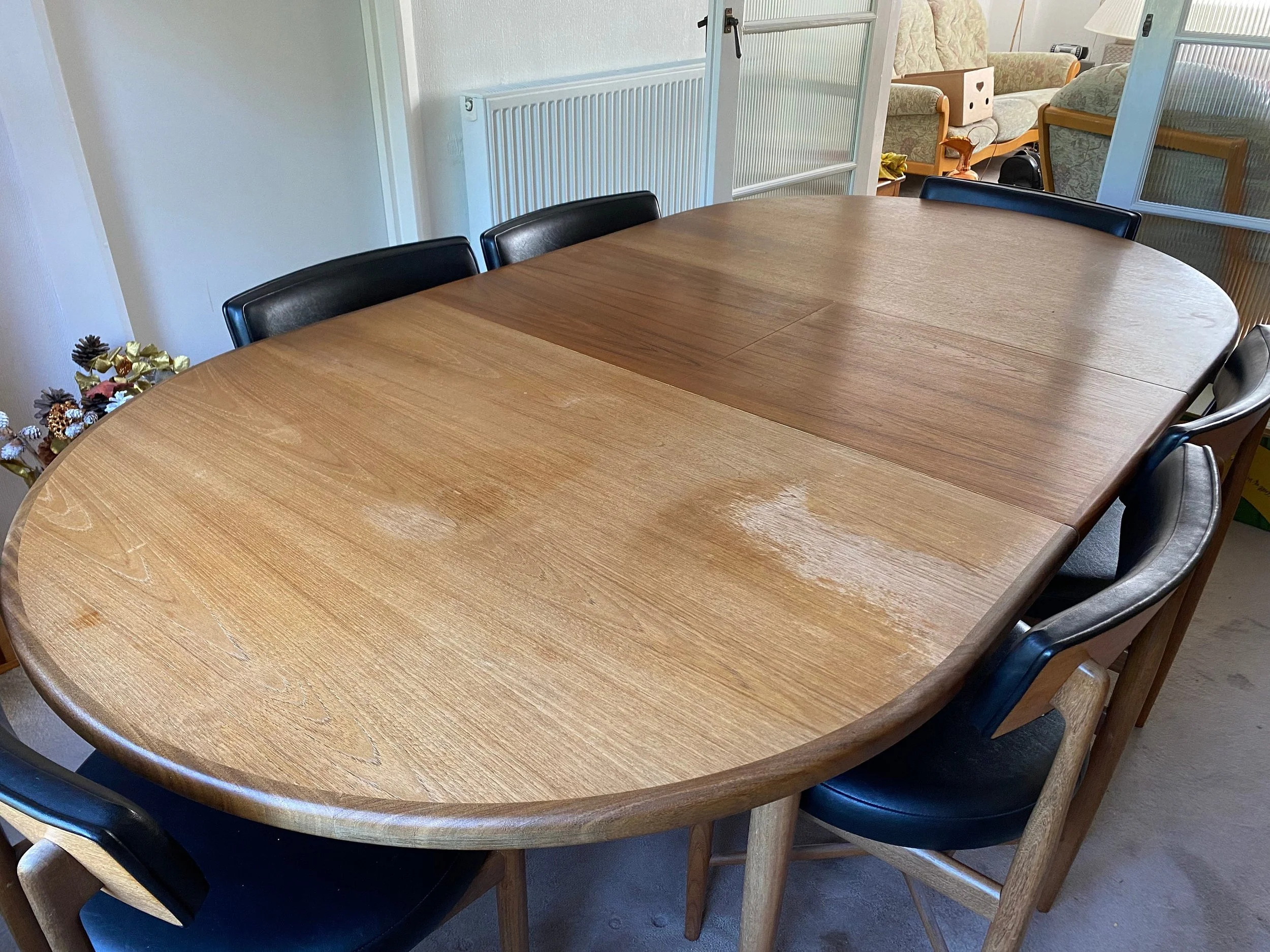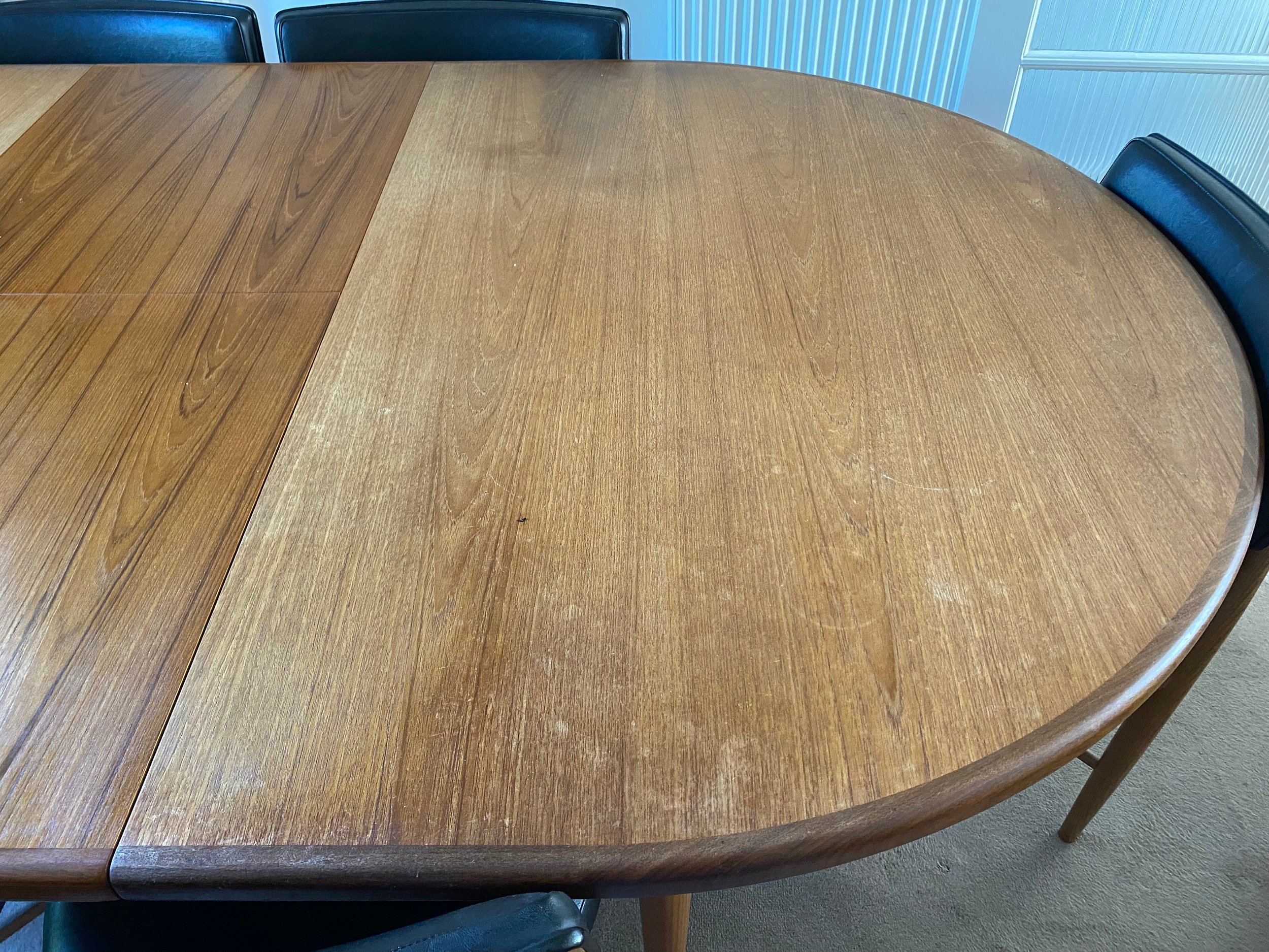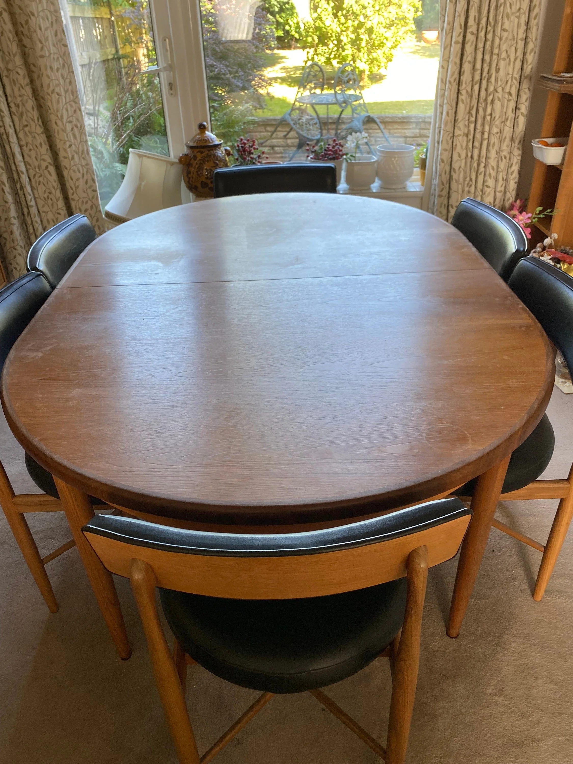 The table is quite marked and sun damaged would need rubbing down and refinishing. The central extension leaf is in very good condition. The chairs are in very good condition. Two are a bit wobbly and could do with tightening up. The upholstery barely has a mark on it.