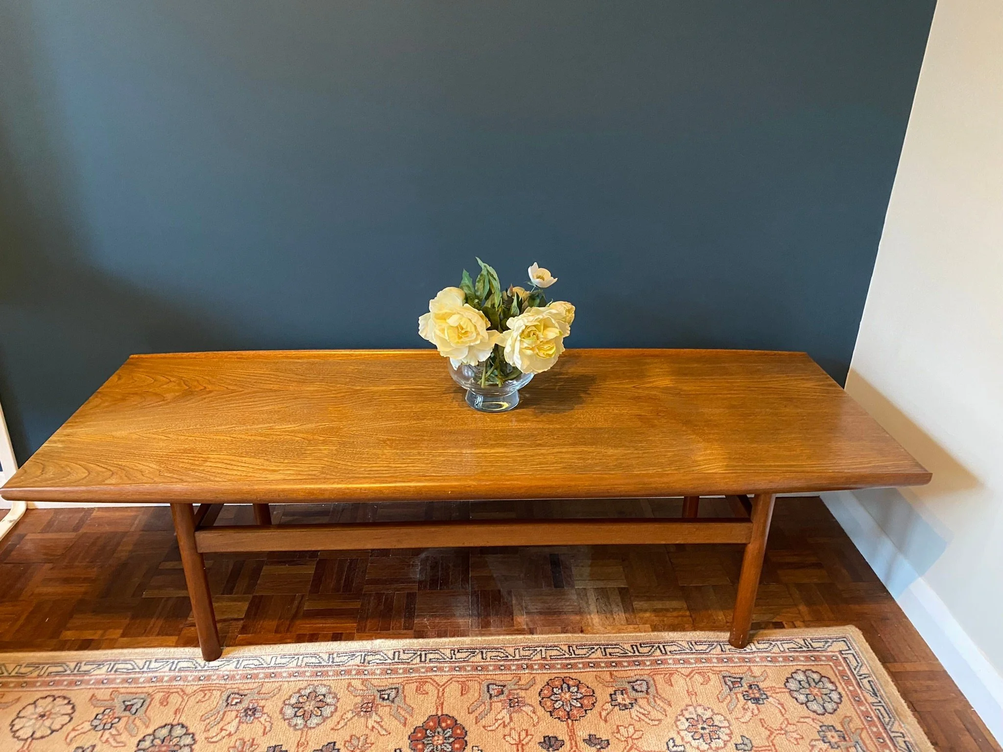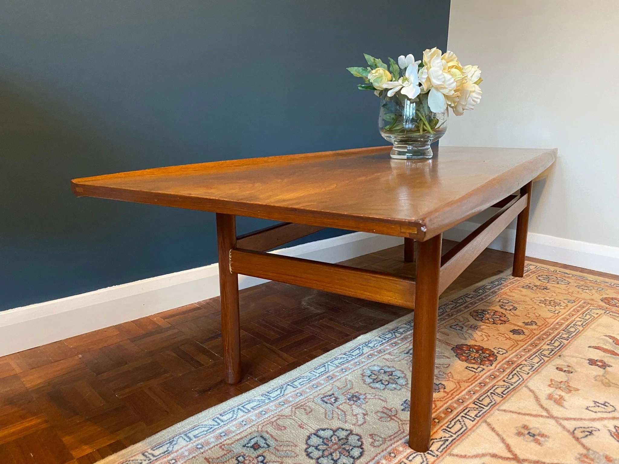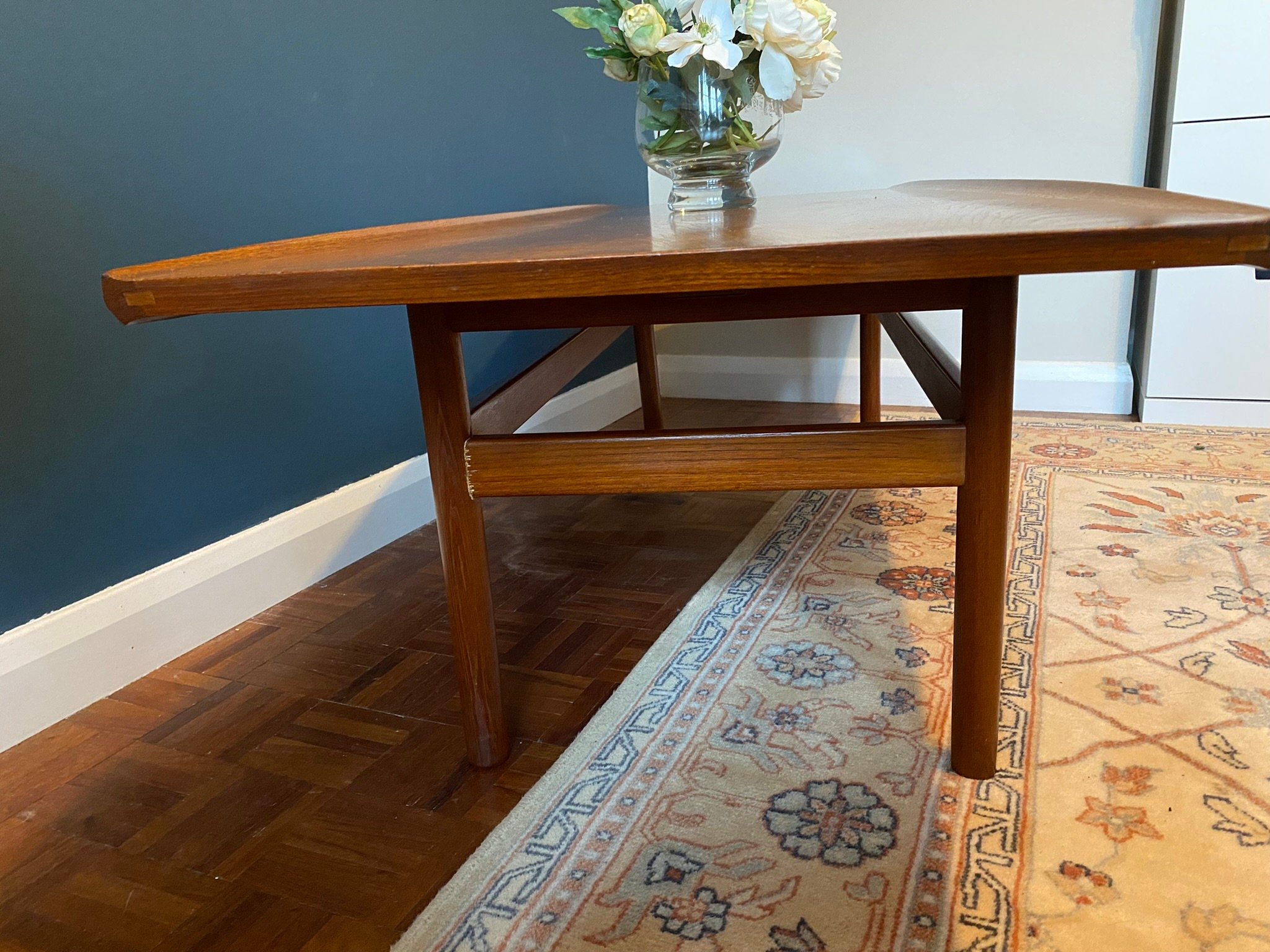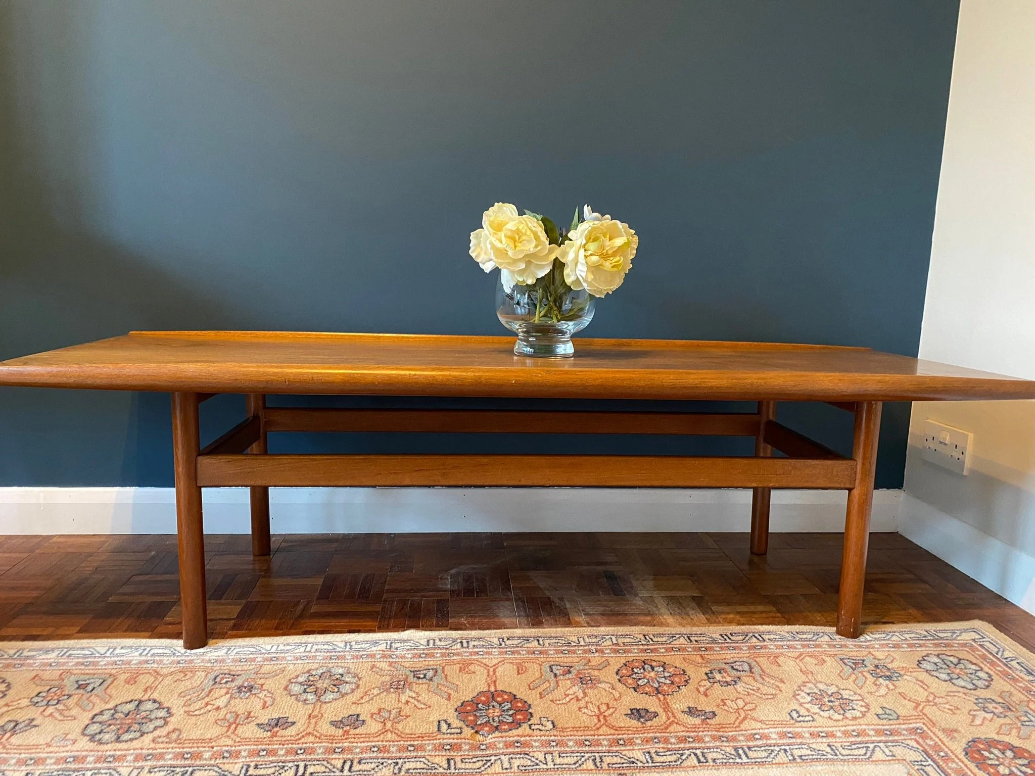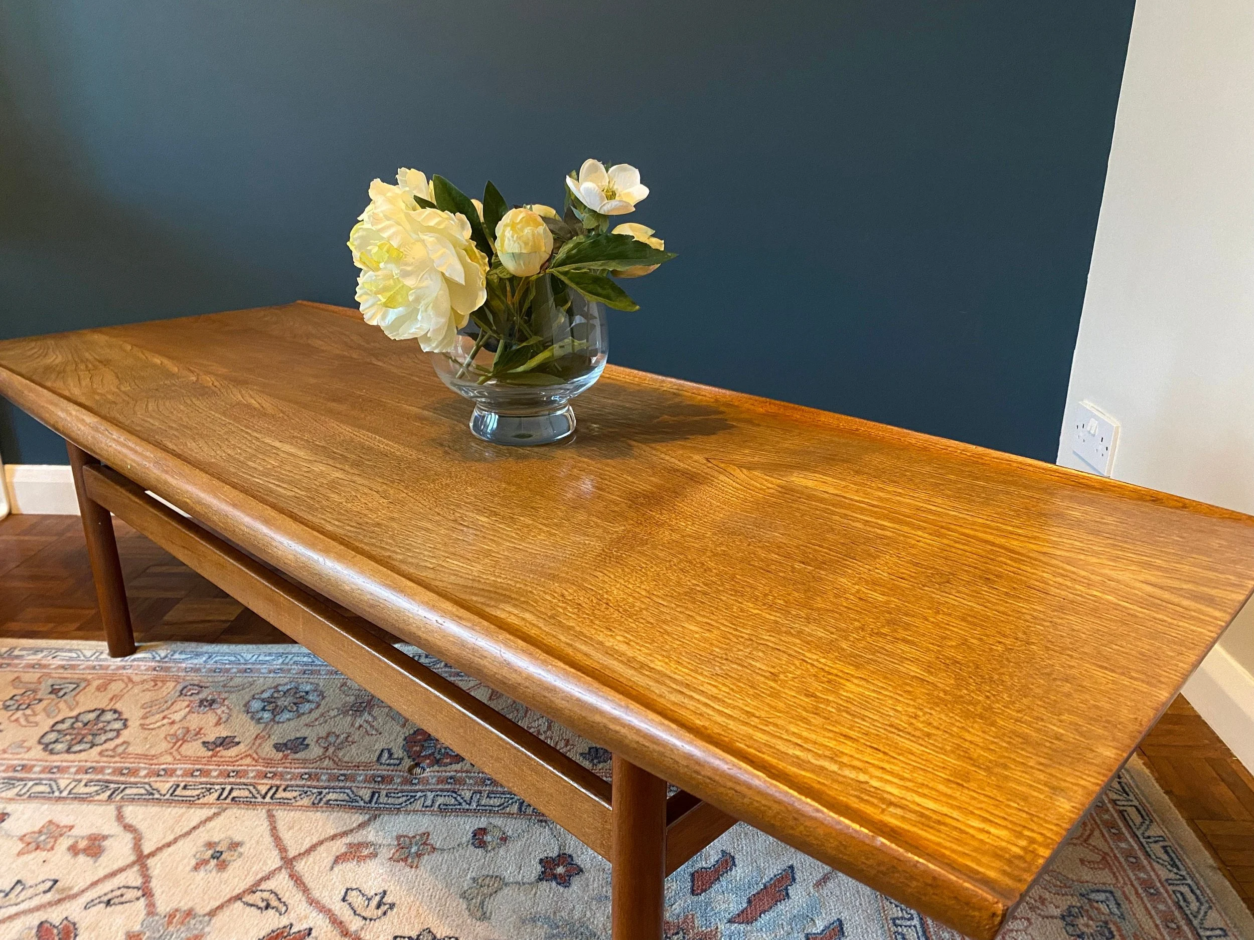 1960s mid century Danish style teak surfboard coffee table by Dalescraft Fine Furniture