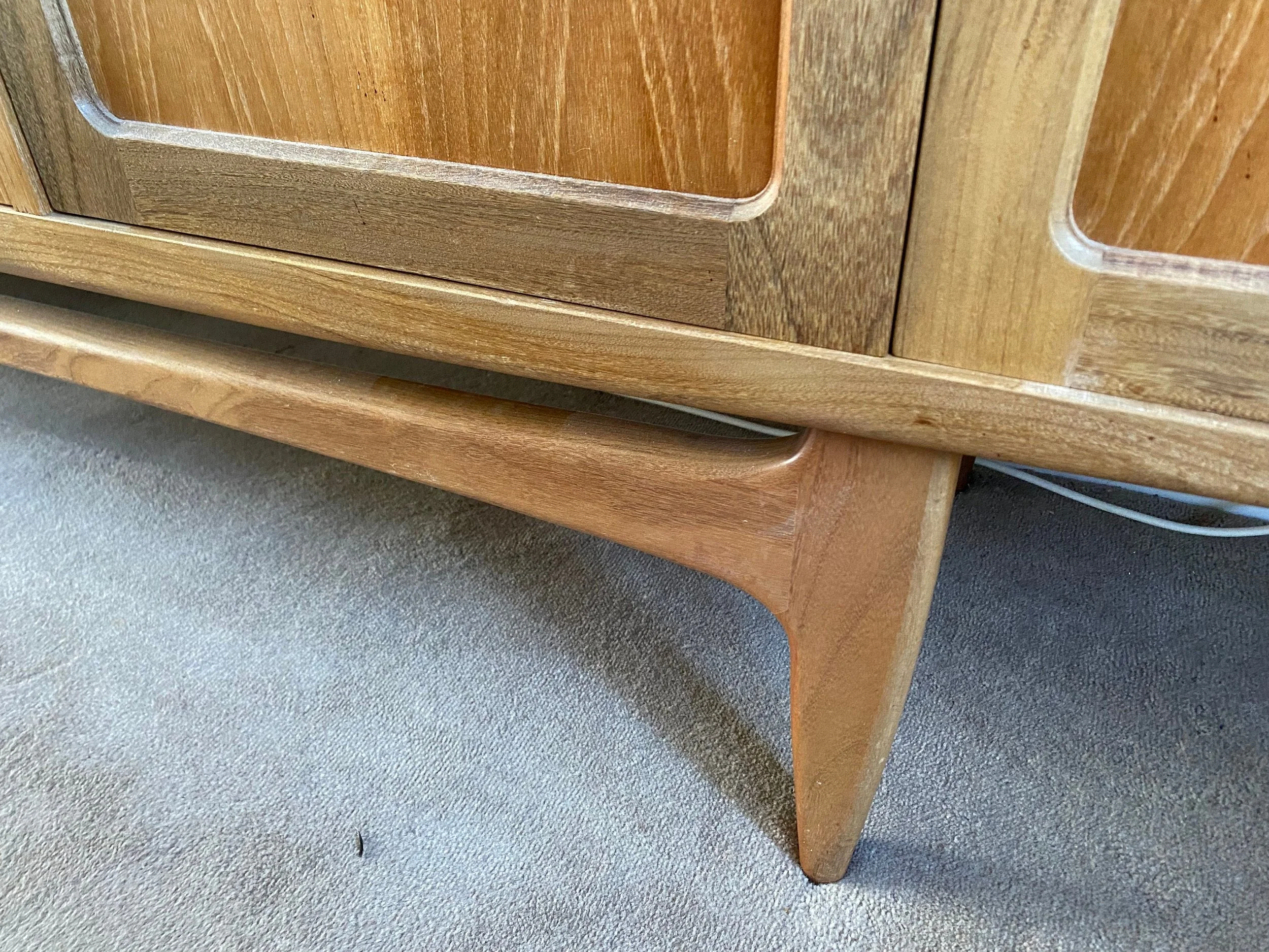 A high quality beautiful mid century piece. Minimal scuffs and the top is in good condition but there is fairly extensive sun fading on the right hand cupboards and the central drawers Please see photos. These may benefit from a refinish.