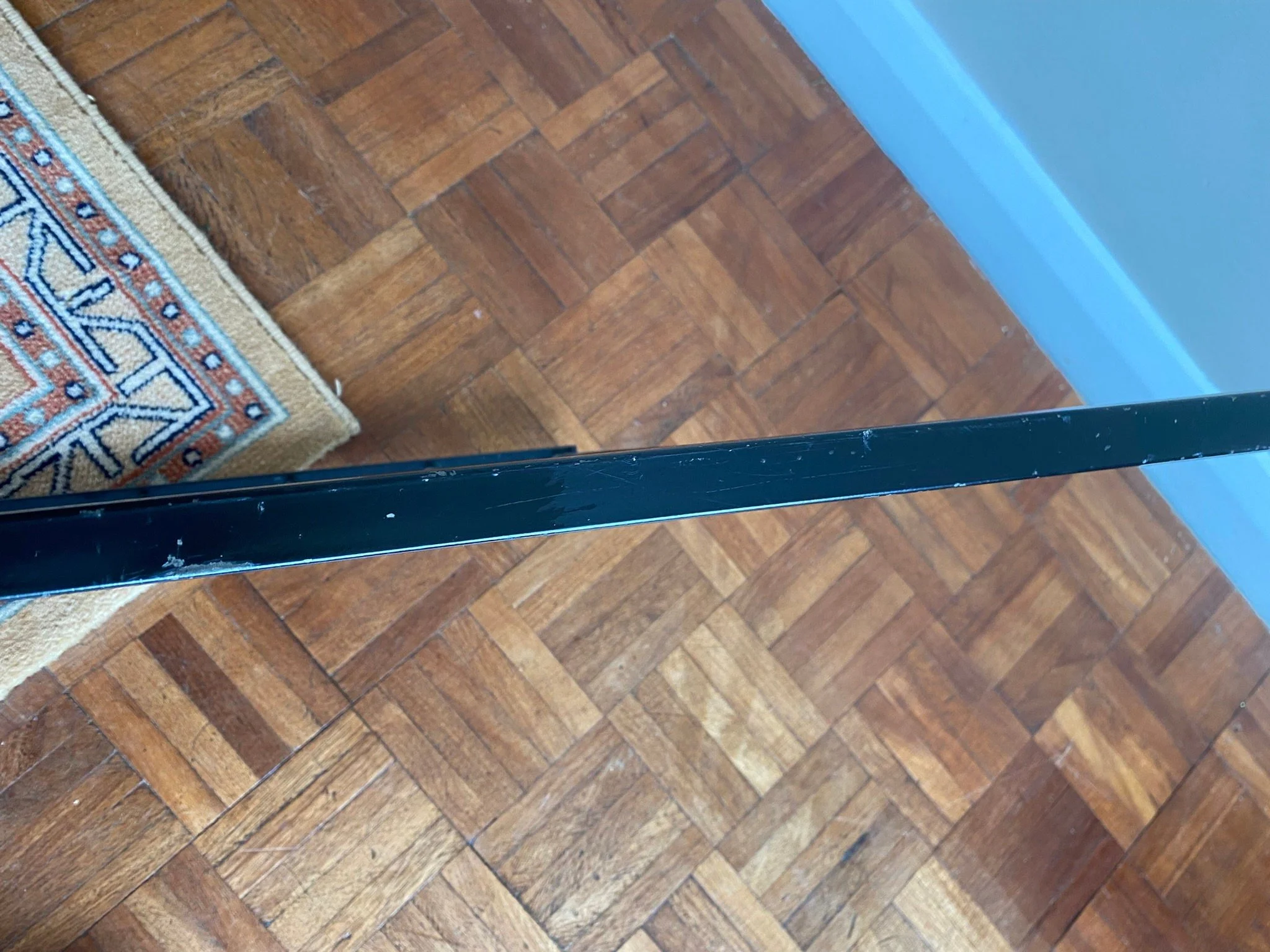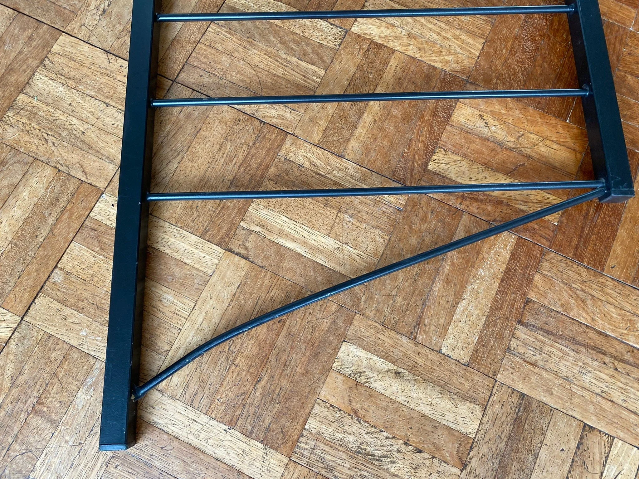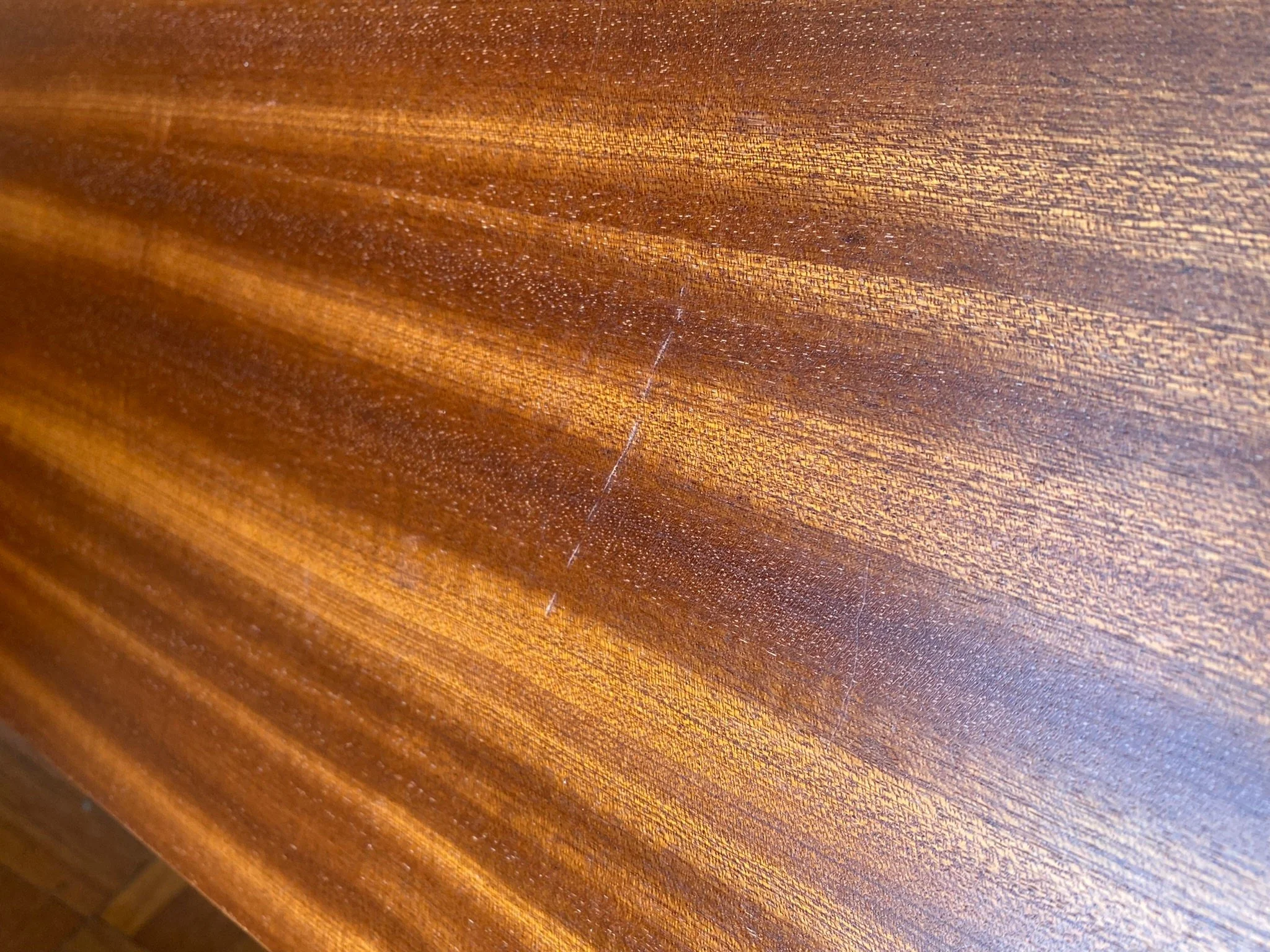 The teak has been oiled and polished but there are odd surface scuffs from age, see photos The odd mark on the metal and one of the rungs at base is slightly bent. All defects are commensurate with age and use, but the piece is still in very good condition.