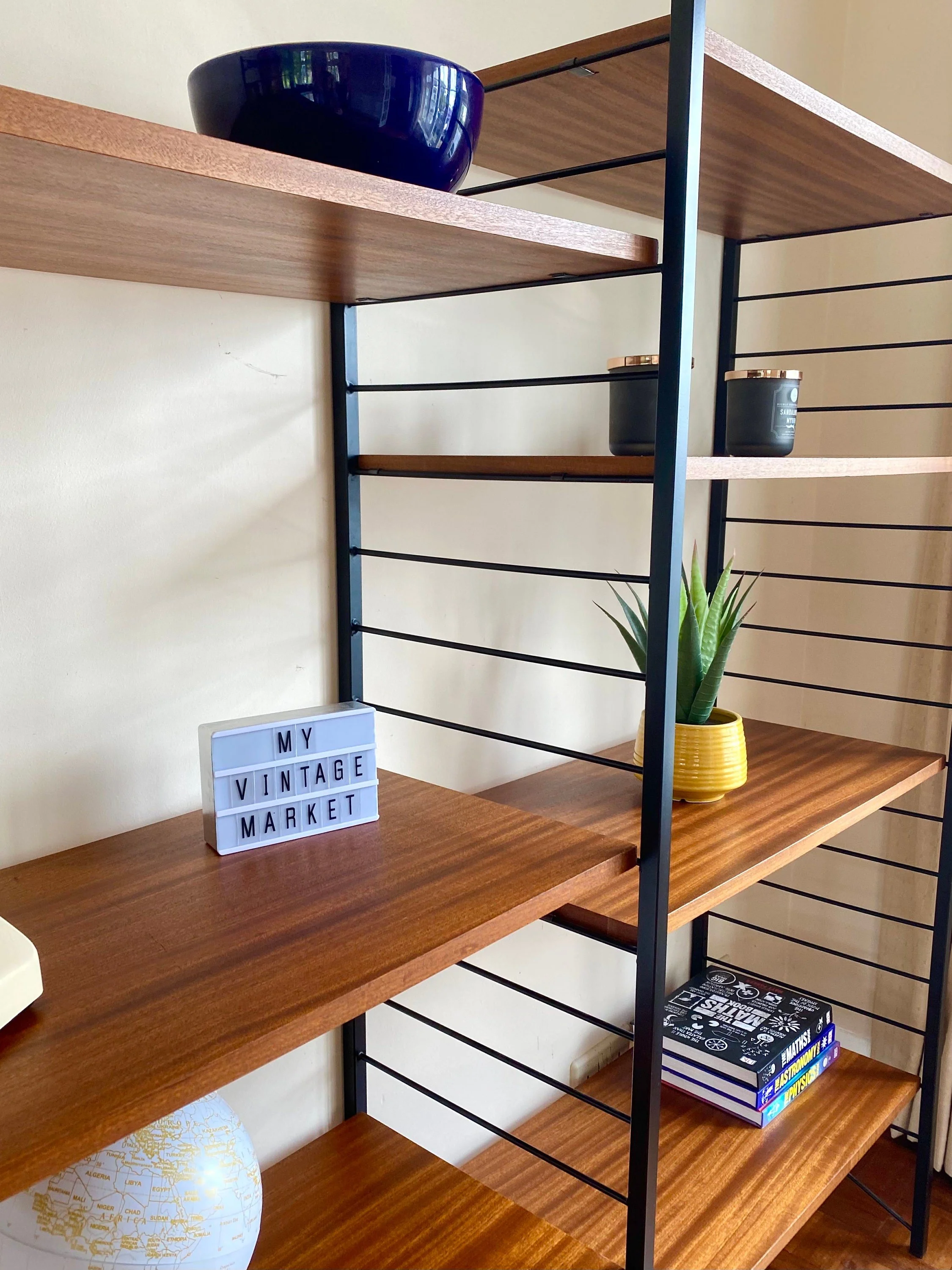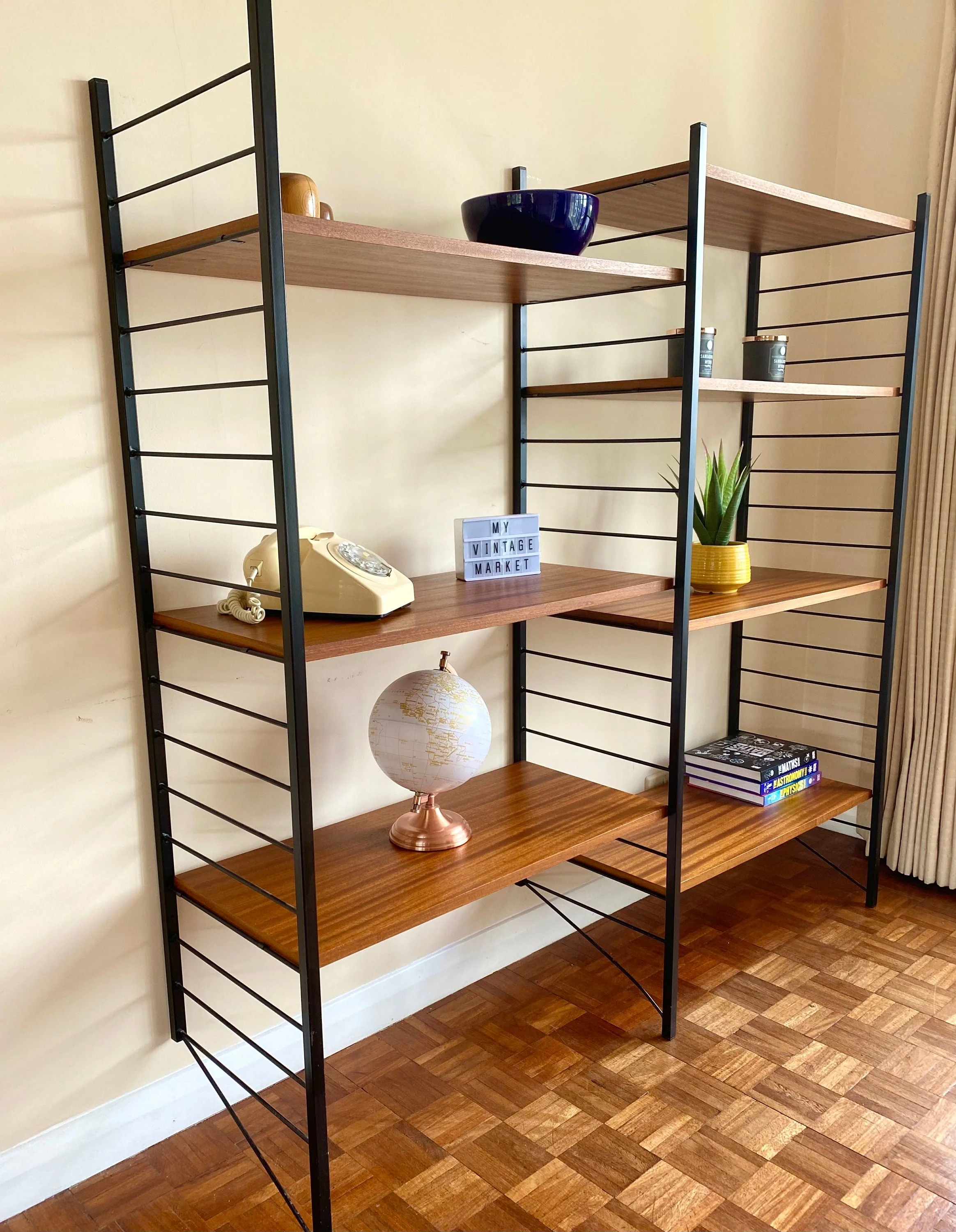 Retro Ladderax style shelving comprising three black enamel vertical supports and seven teak veneer shelves Can be arranged in any configuration Double bay