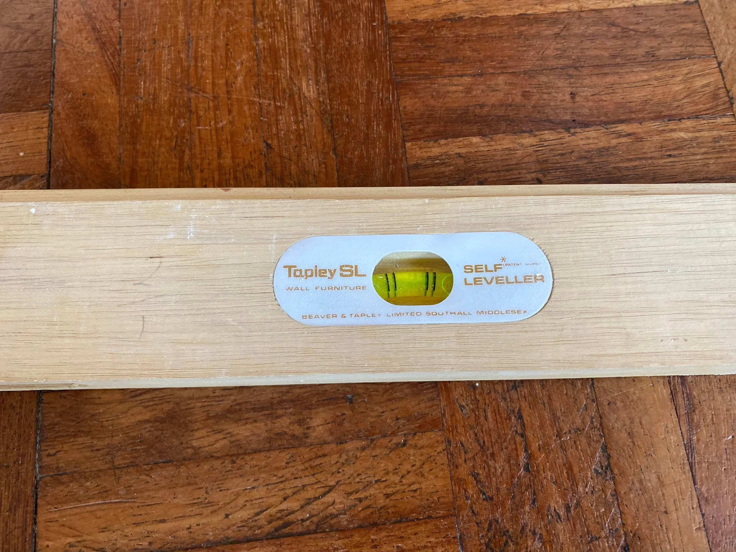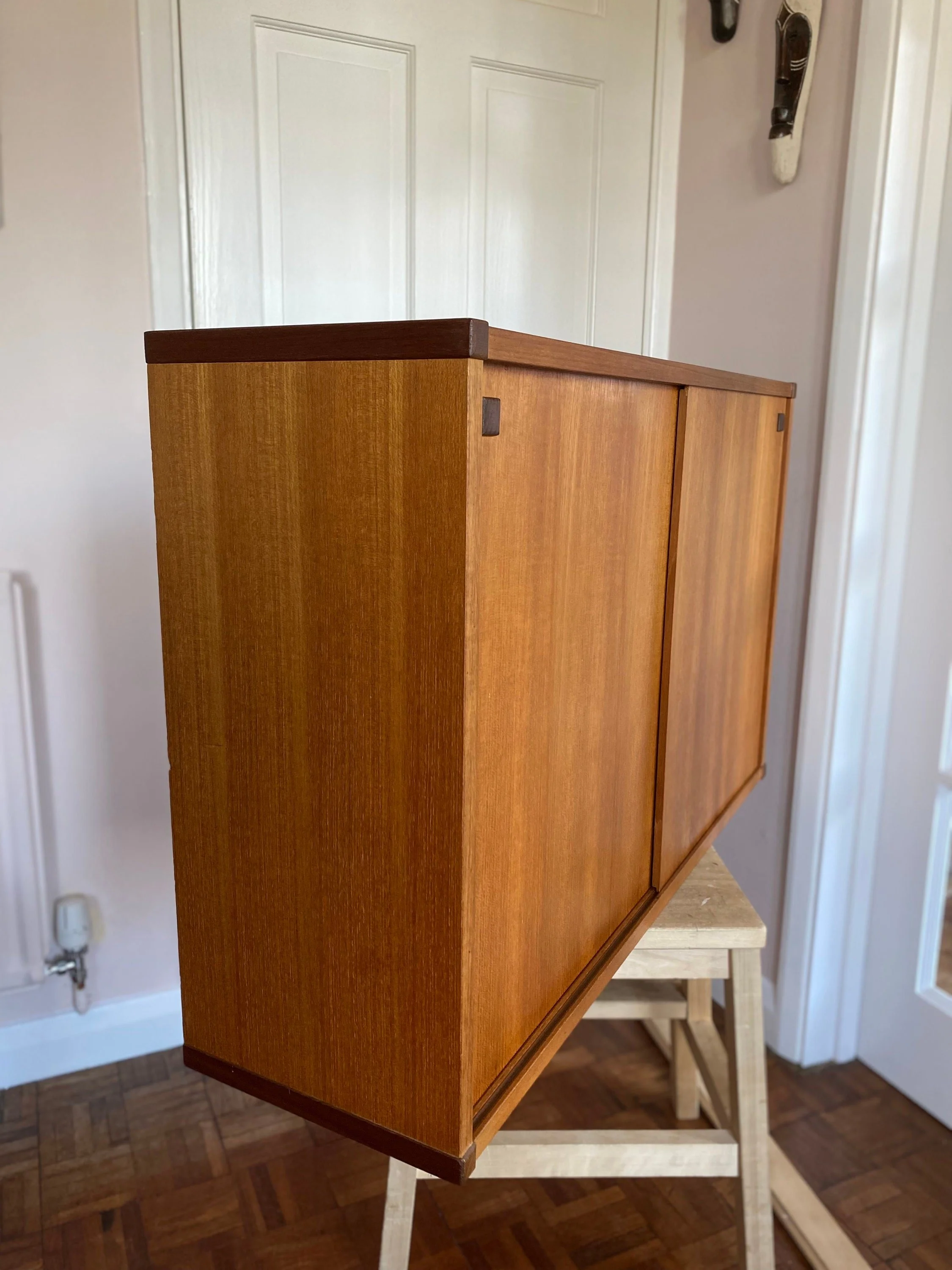 1960s mid century teak Tapley SL modular sliding door floating wall cabinet. From the Tapley SL wall furniture range Comes with Tapley self levelling wall bracket One adjustable shelf Two sliding teak veneer doors with teak handles