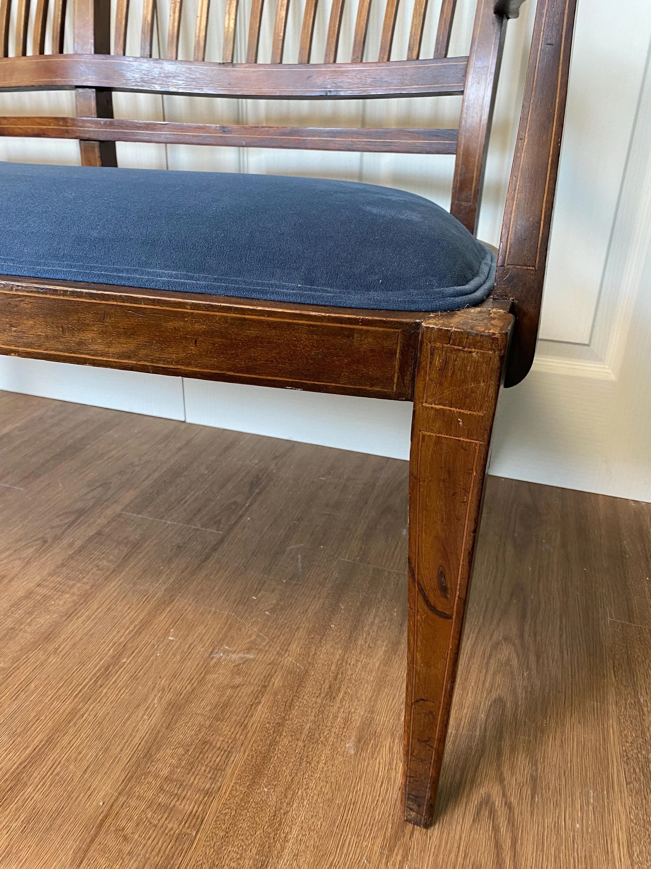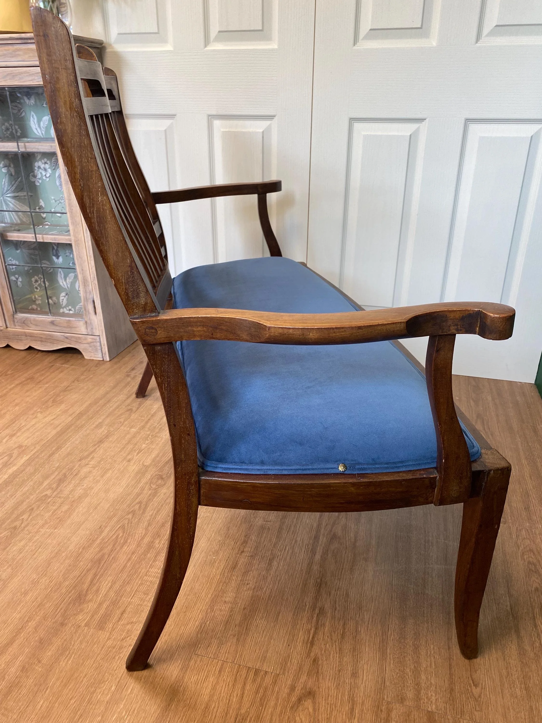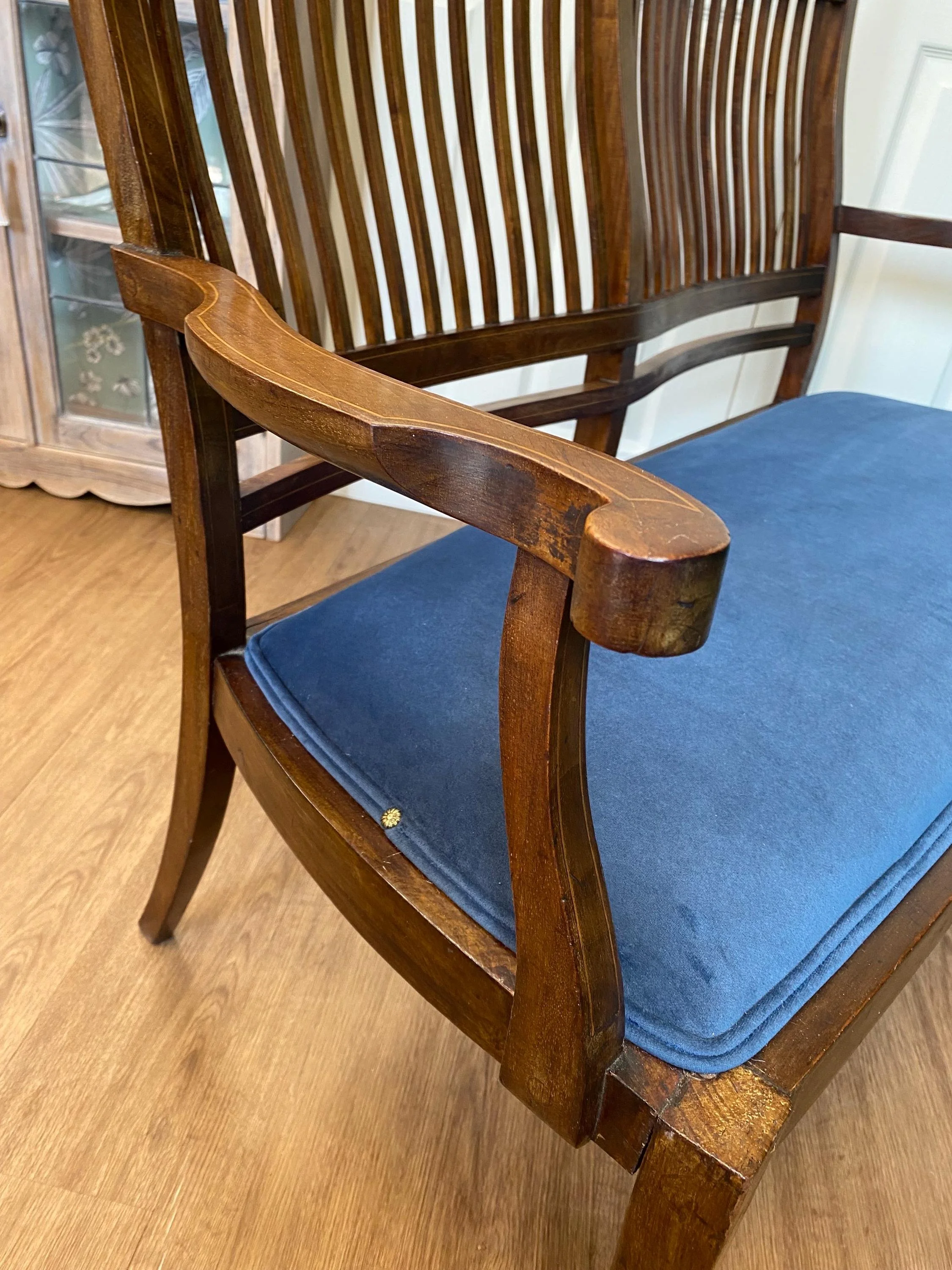 Antique Edwardian Refurbished mahogany inlaid marquetry love seat settee blue velvet