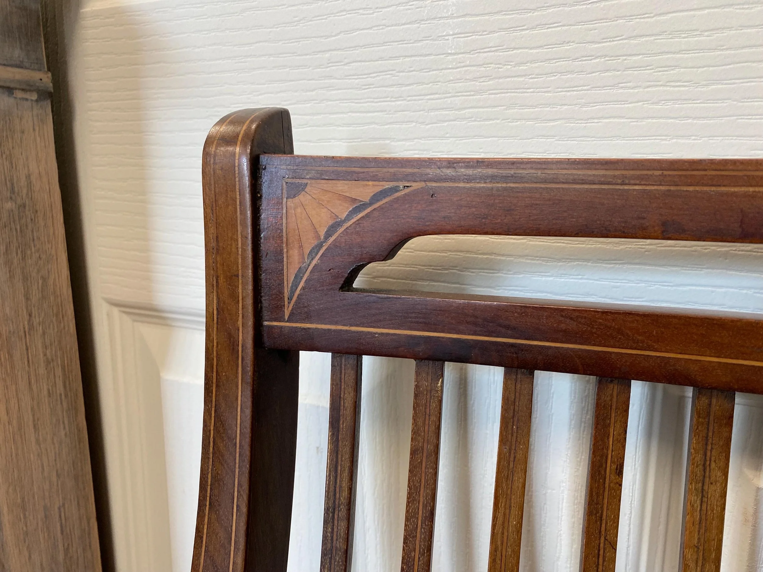 Mahogany inlaid slatted frame with marquetry on the corners, scrolled arms and elegant curved legs.