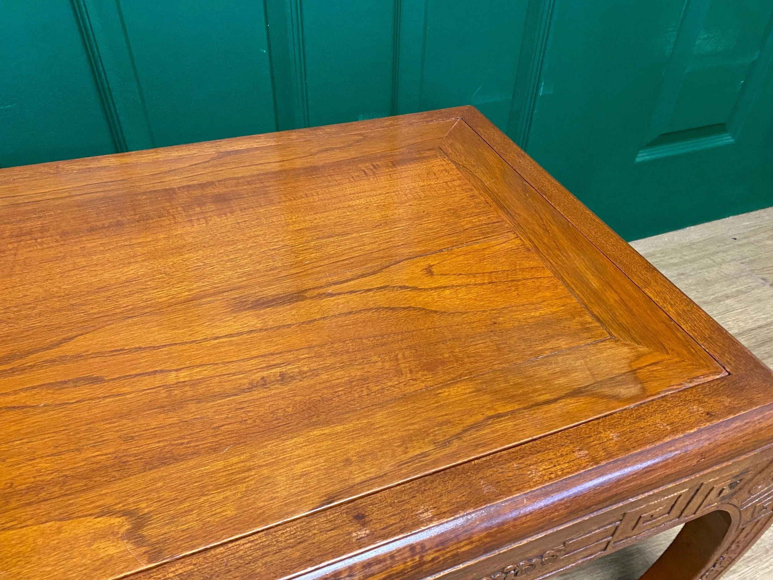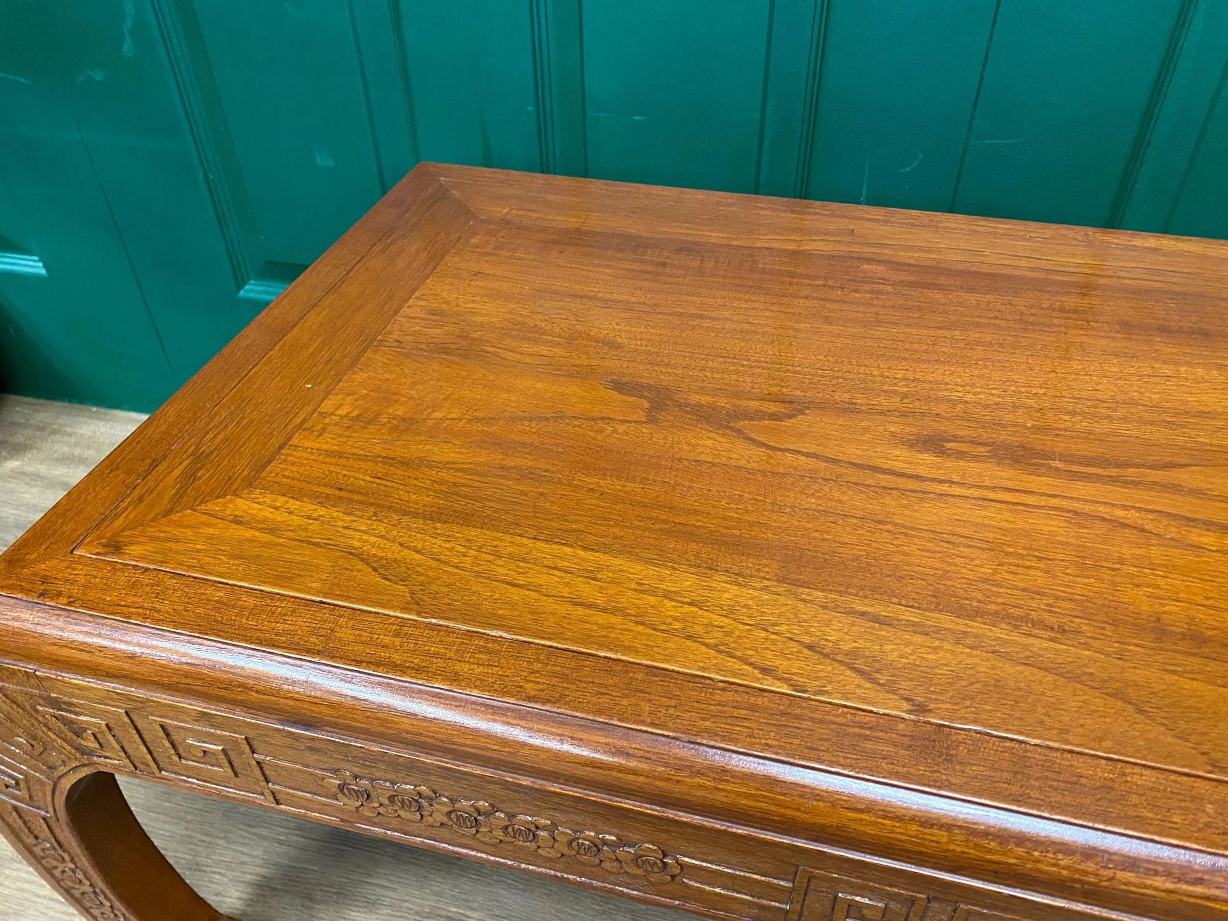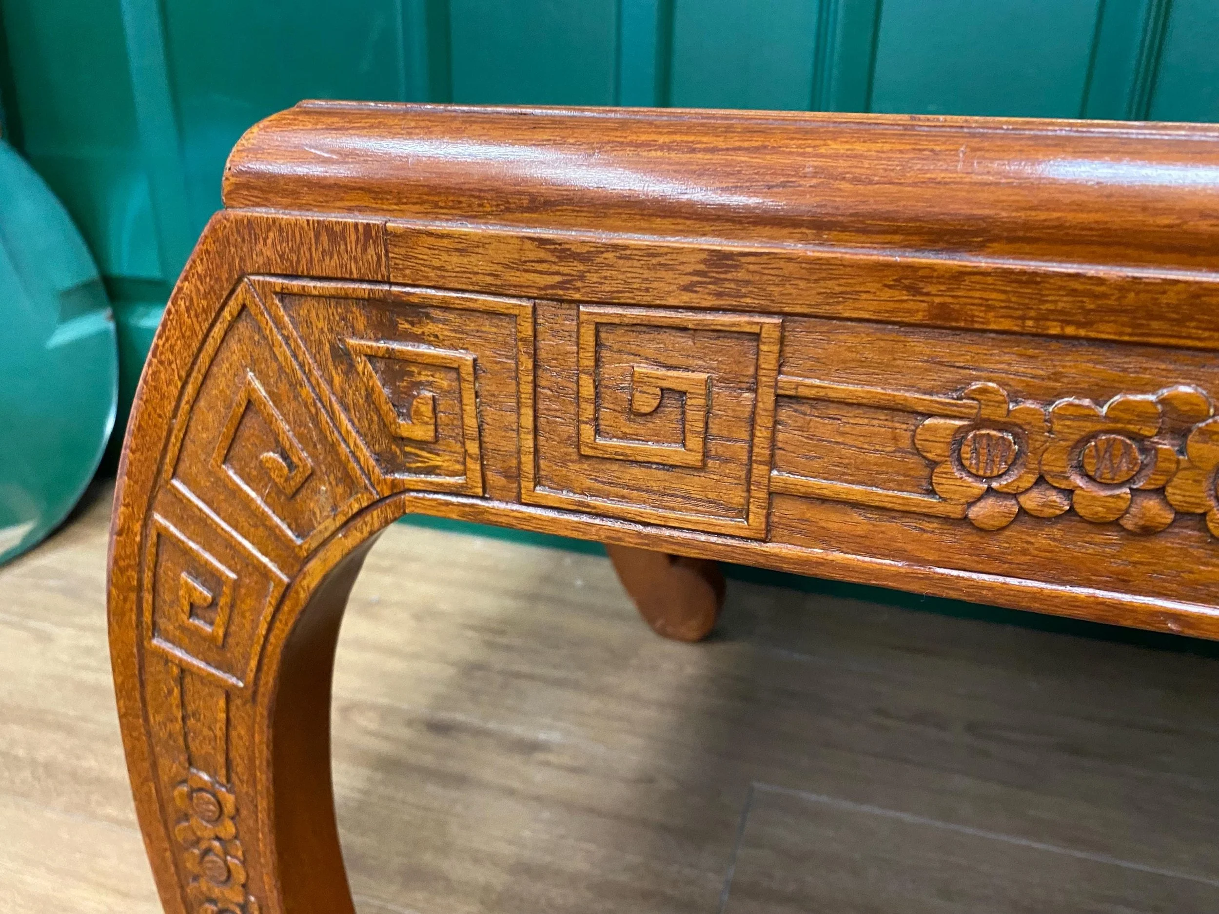Antique reversible coffee table stool bench Oriental style, crafted from camphor wood. An elegant curved base with carved detail The table top reverses to give a stool with tapestry style upholstery