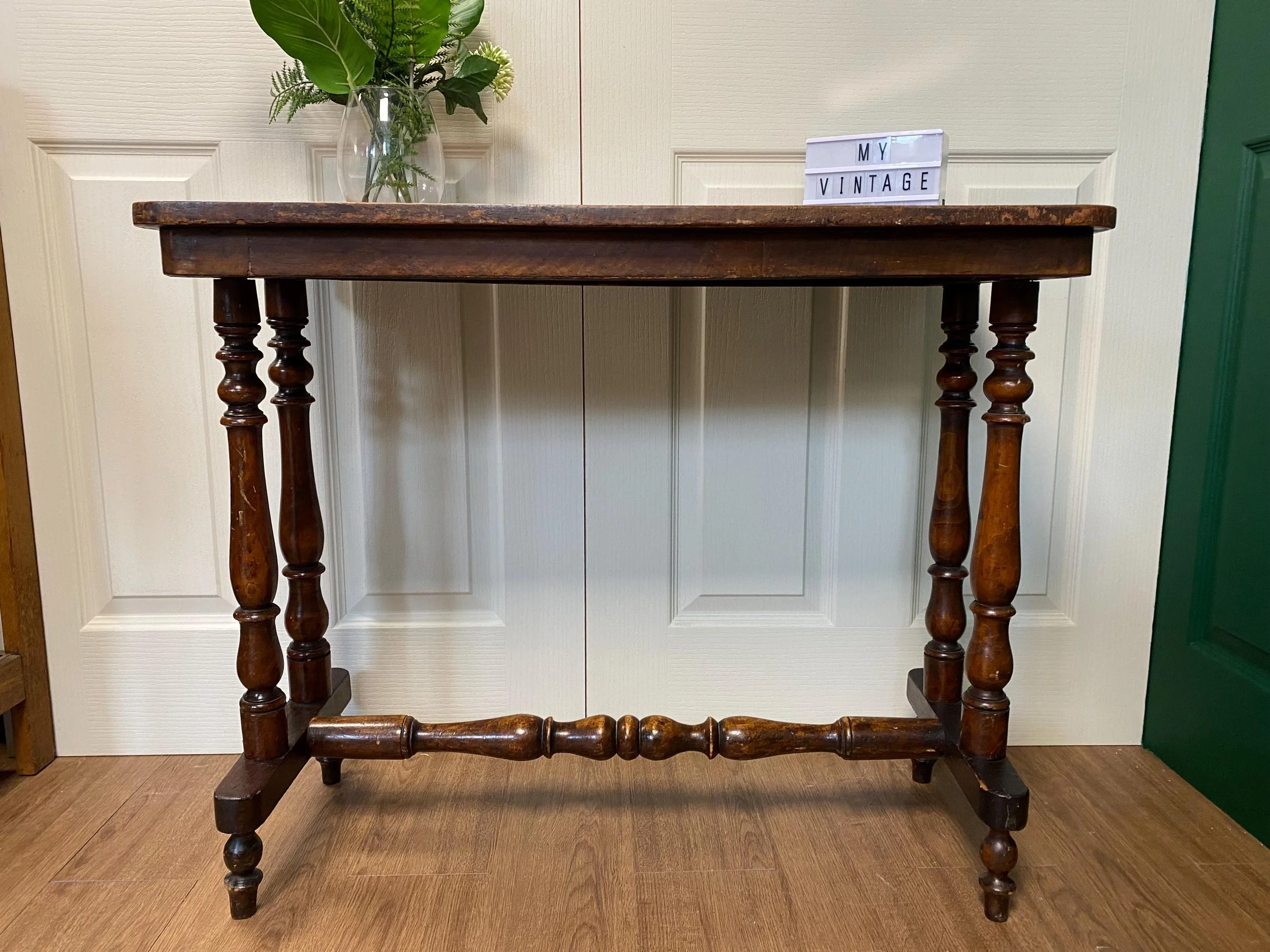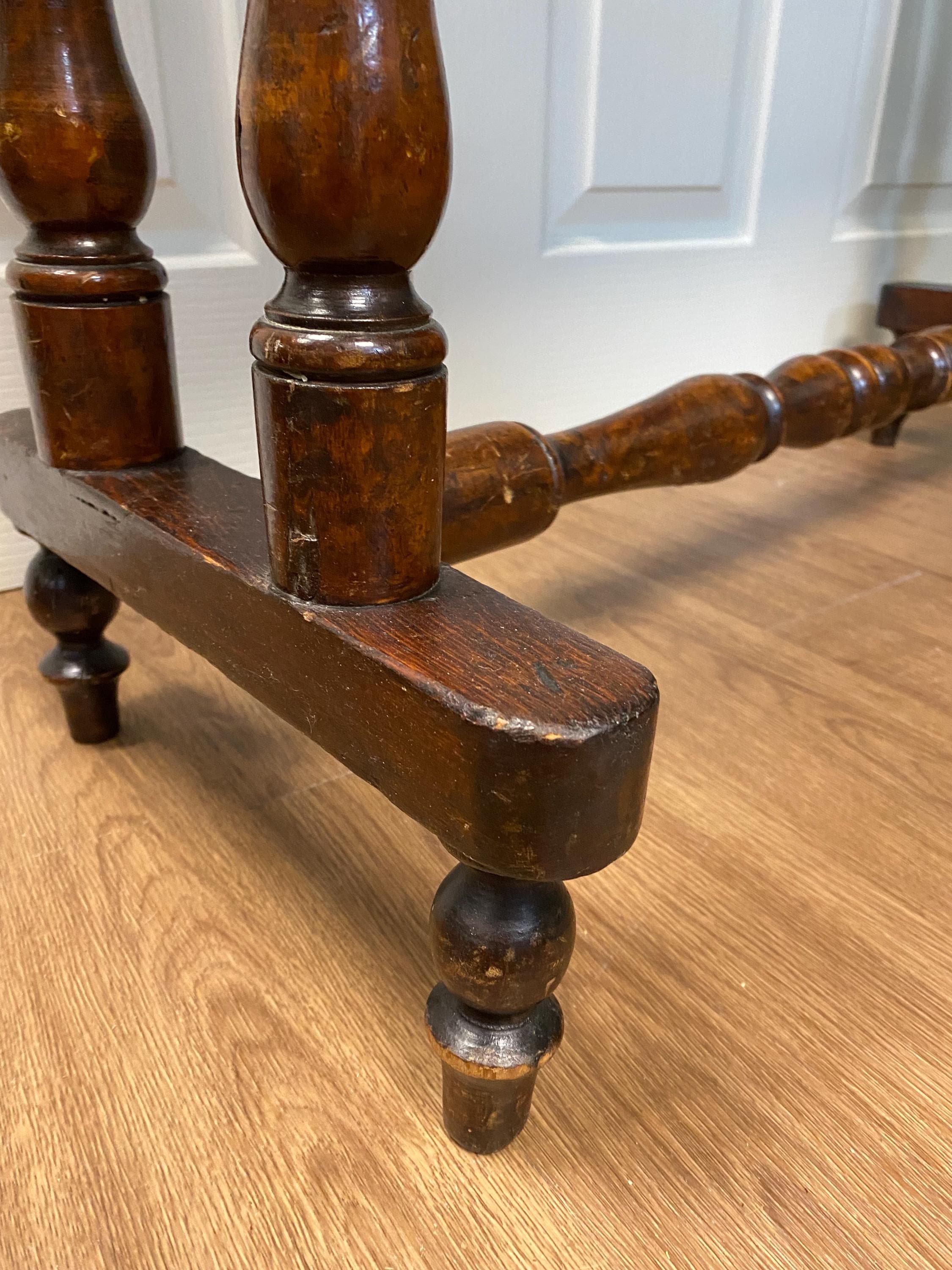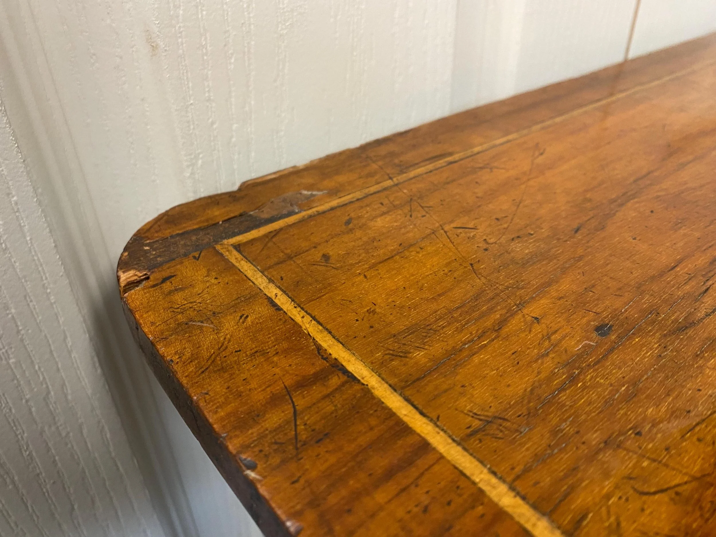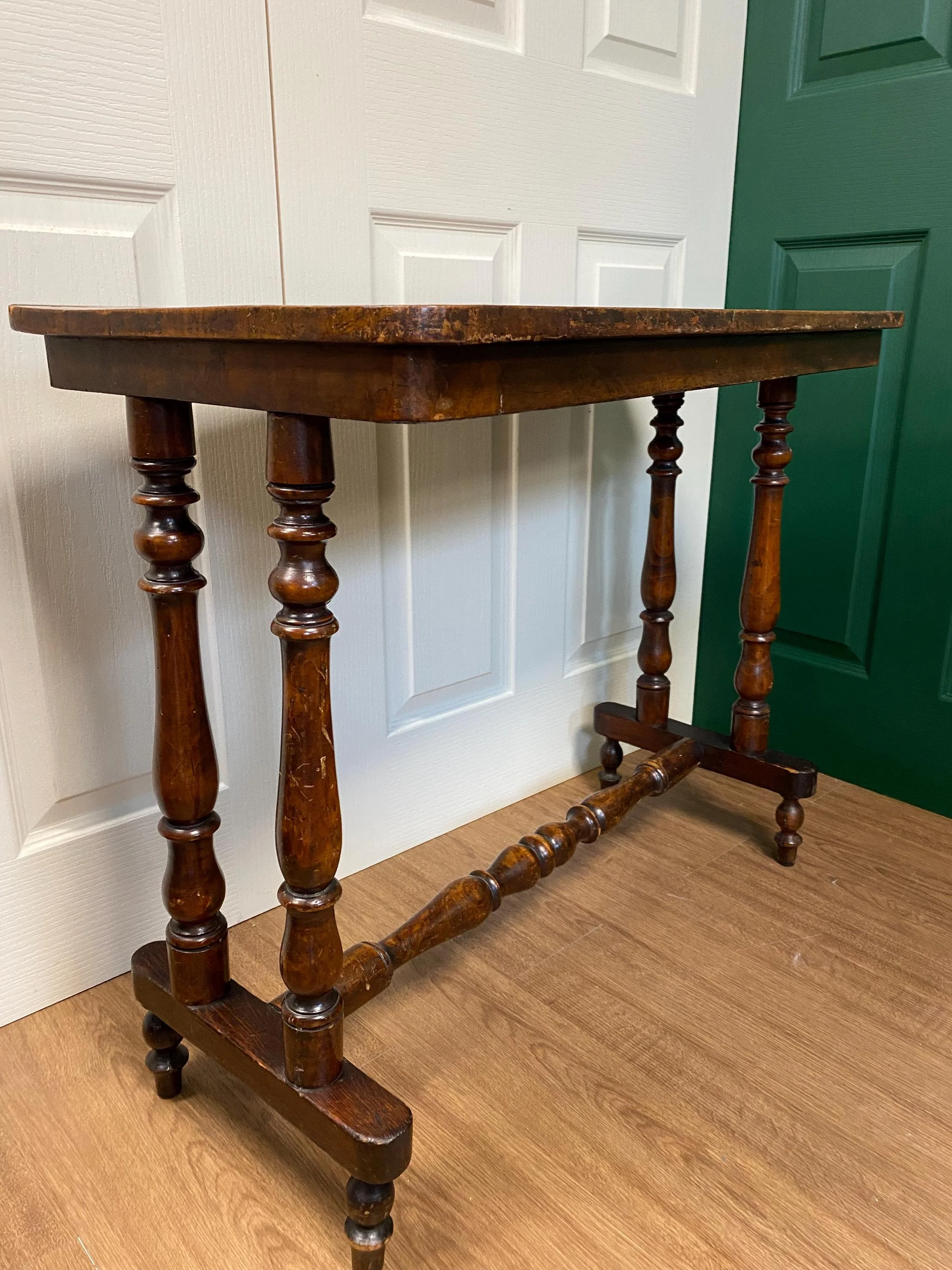 Has a lot of signs of wear which adds to its charm. The legs are wobbly. Although the table is still solid, it would benefit from gluing.