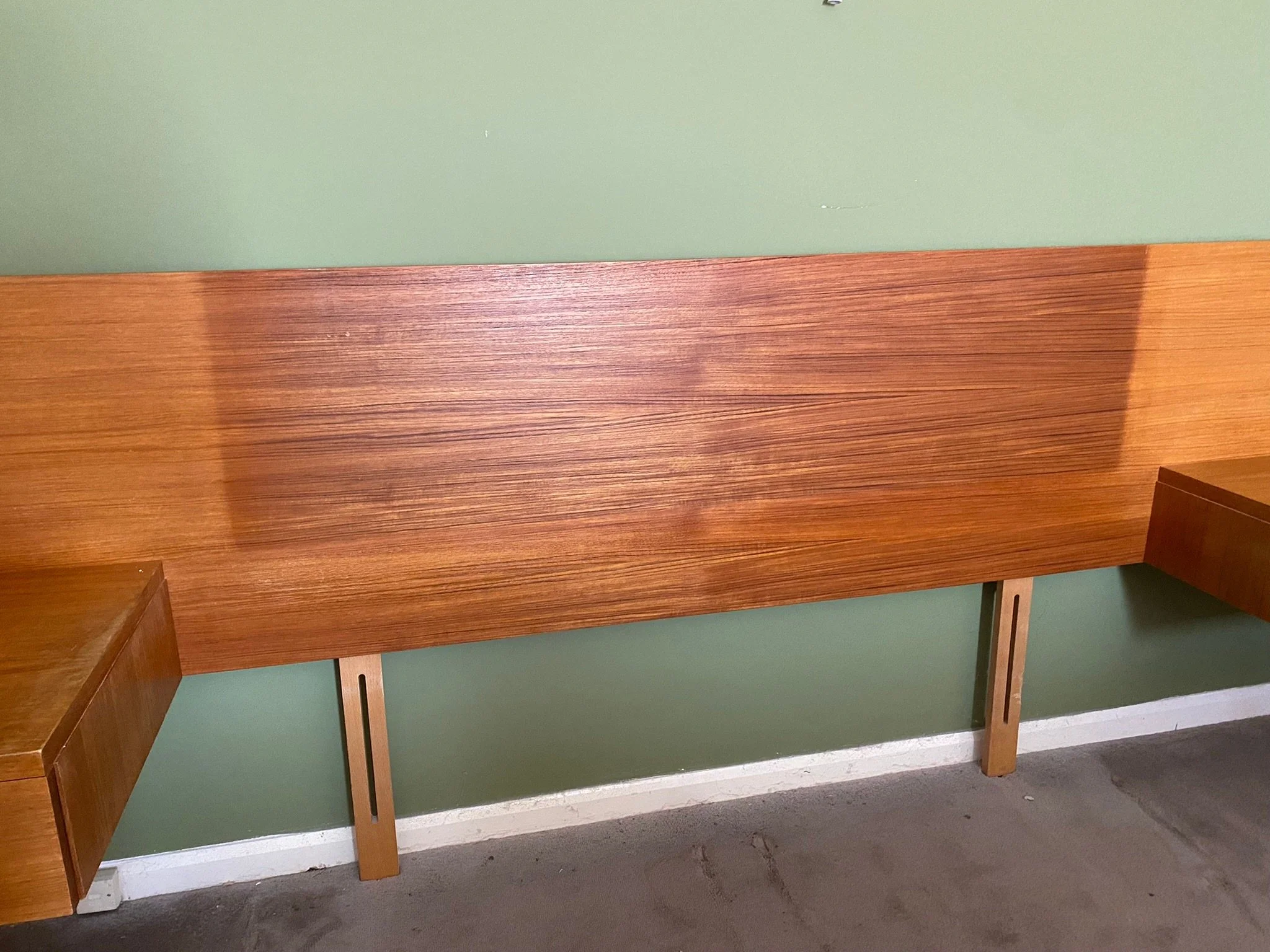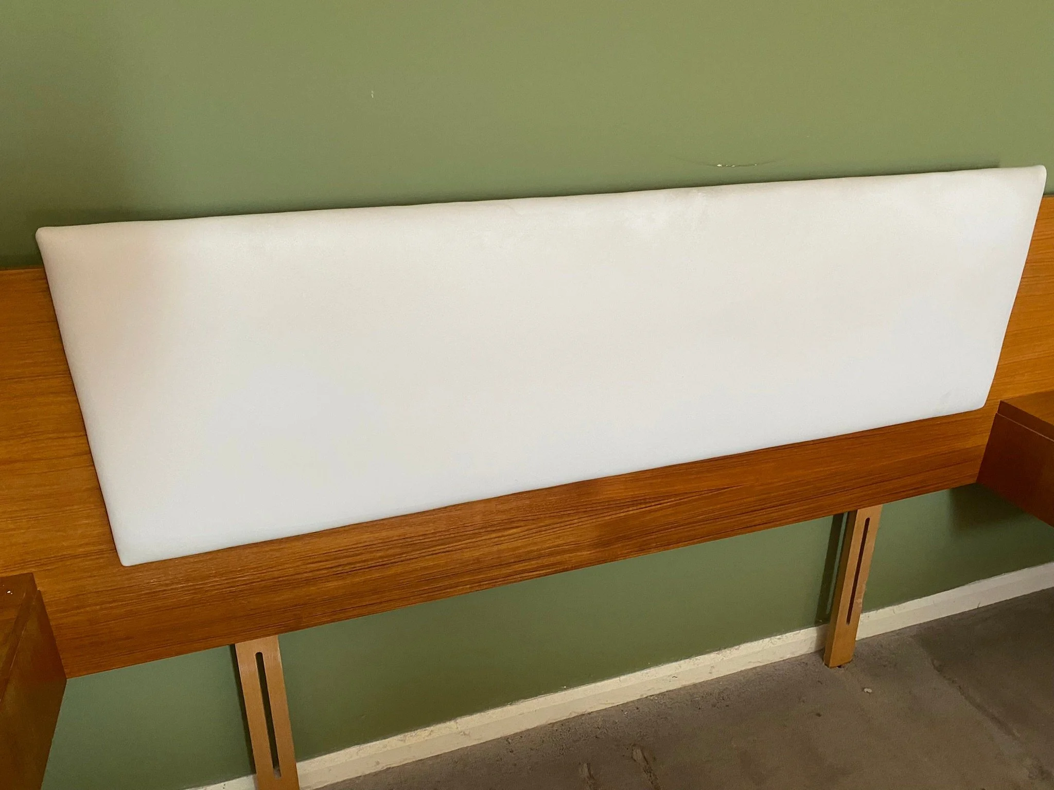 G Plan E Gomme Quadrille mid century teak bedside tables with headboard unit 1960s sleek Danish design Fits a standard double bed Two single drawer units with single sleigh leg Comes with a removable white faux leather padded headboard