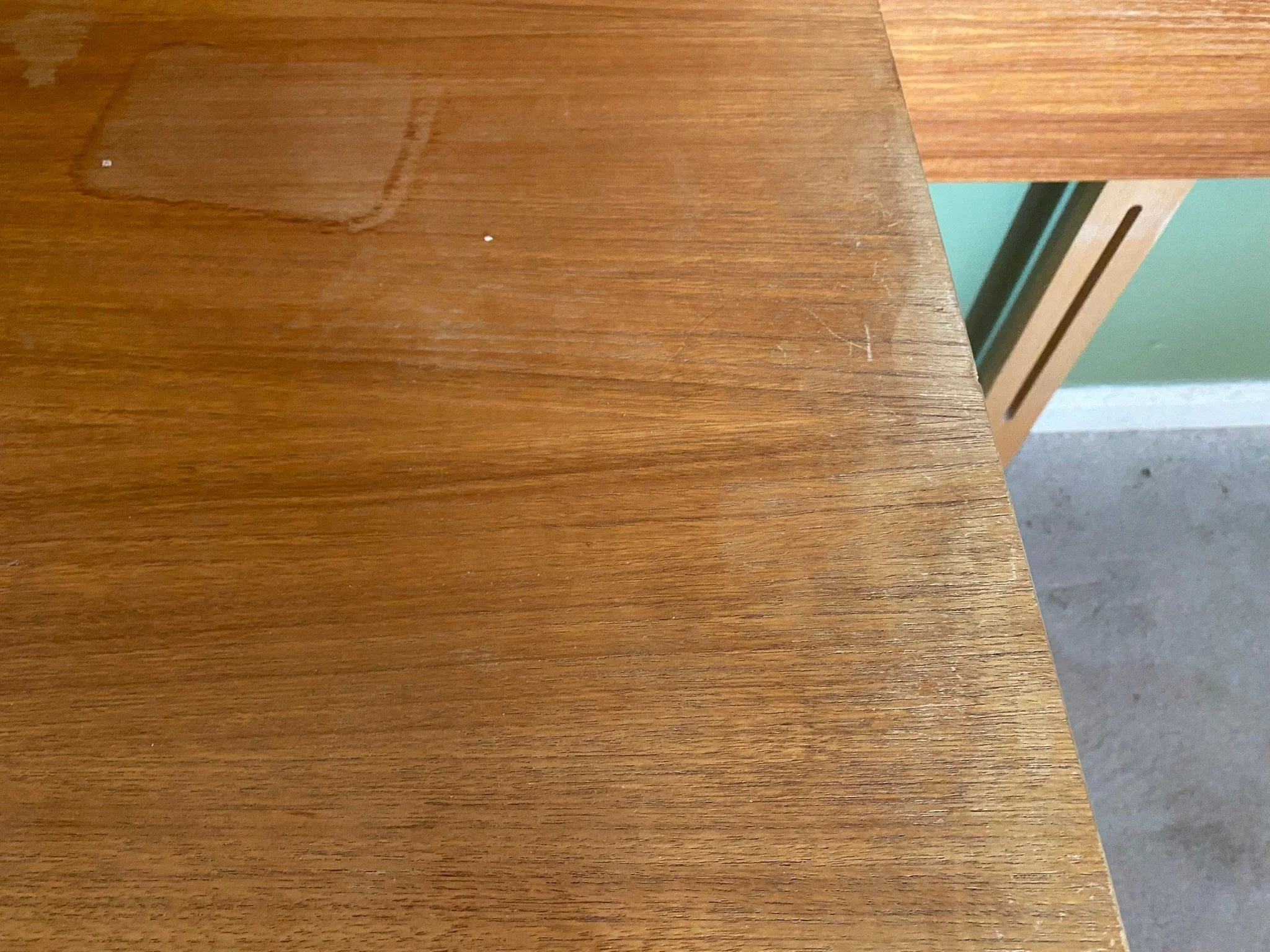 The right table in good condition The left table has several marks and a water mark. It would need rubbing down and refinishing The padded headboard can easily be removed but it shows sun fading underneath. One of the hooks has come loose