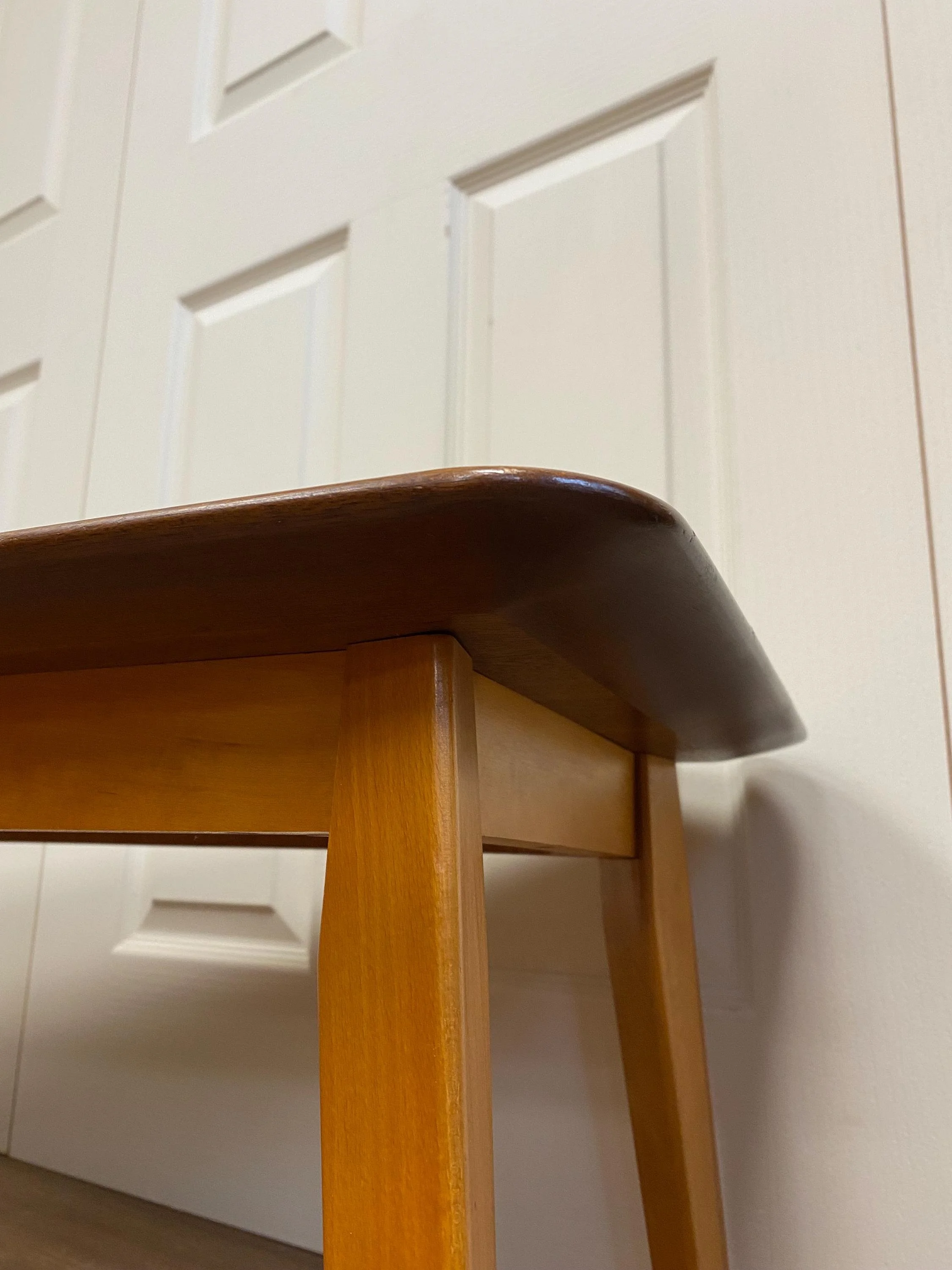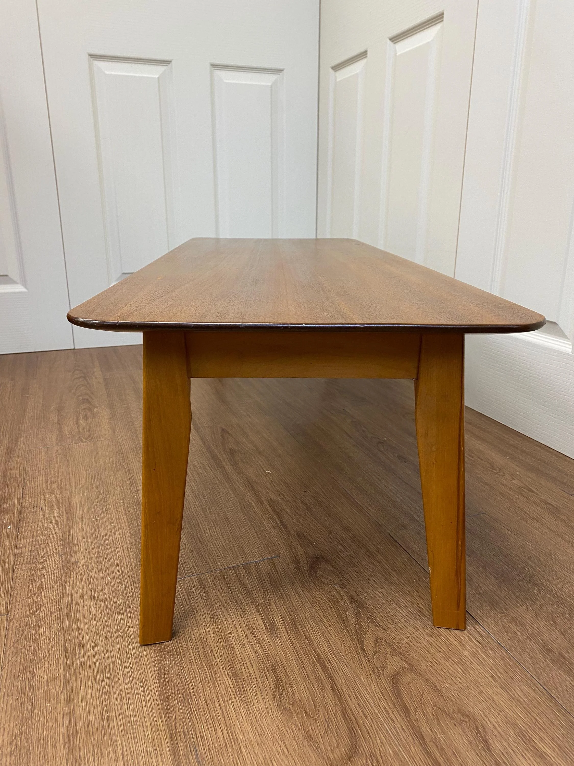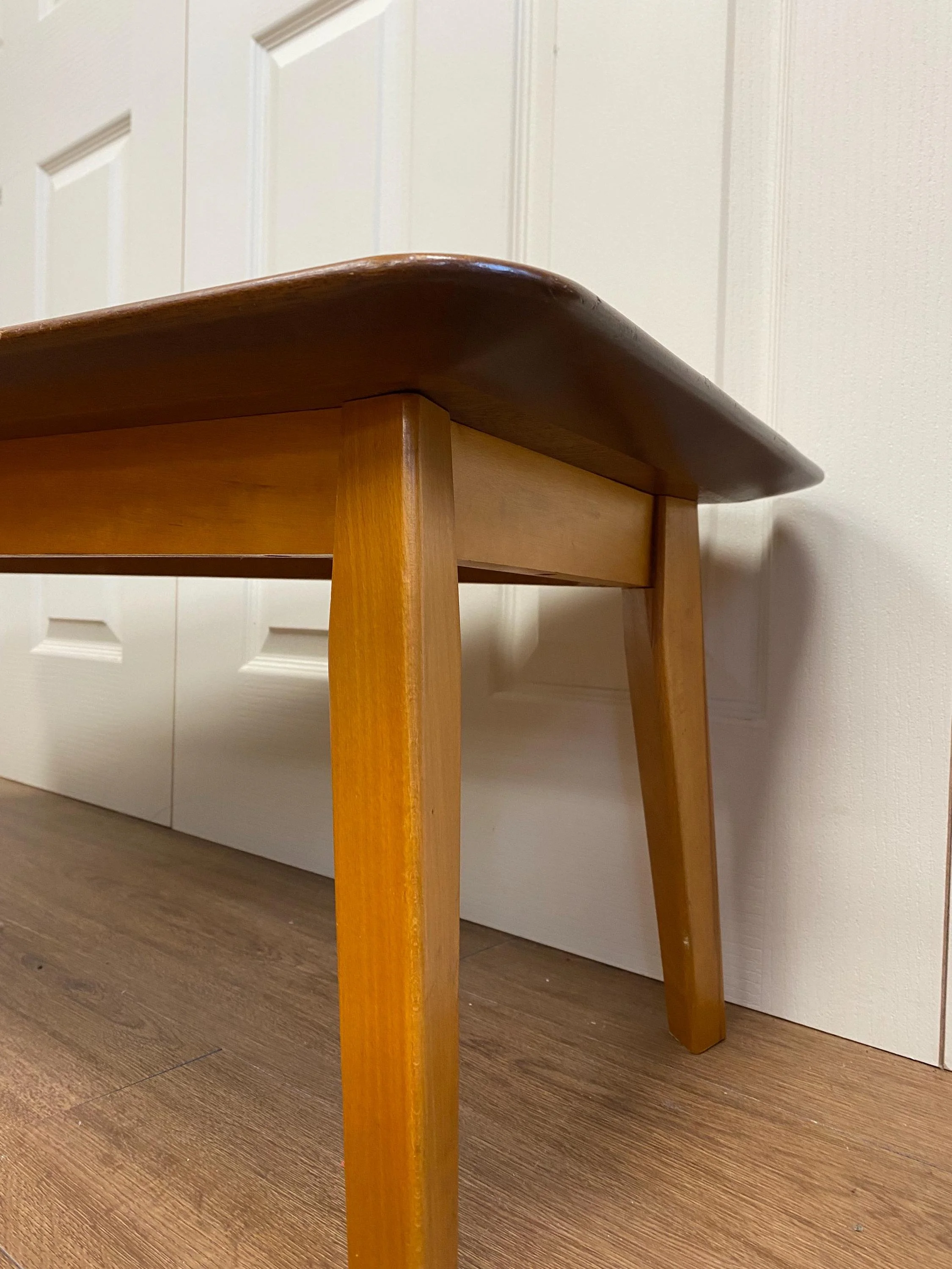 Mid century 1960s coffee table by E&S Teak veneer with splayed legs Aesthetic curved edges