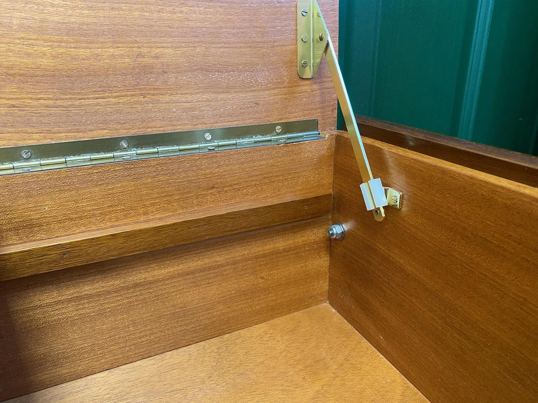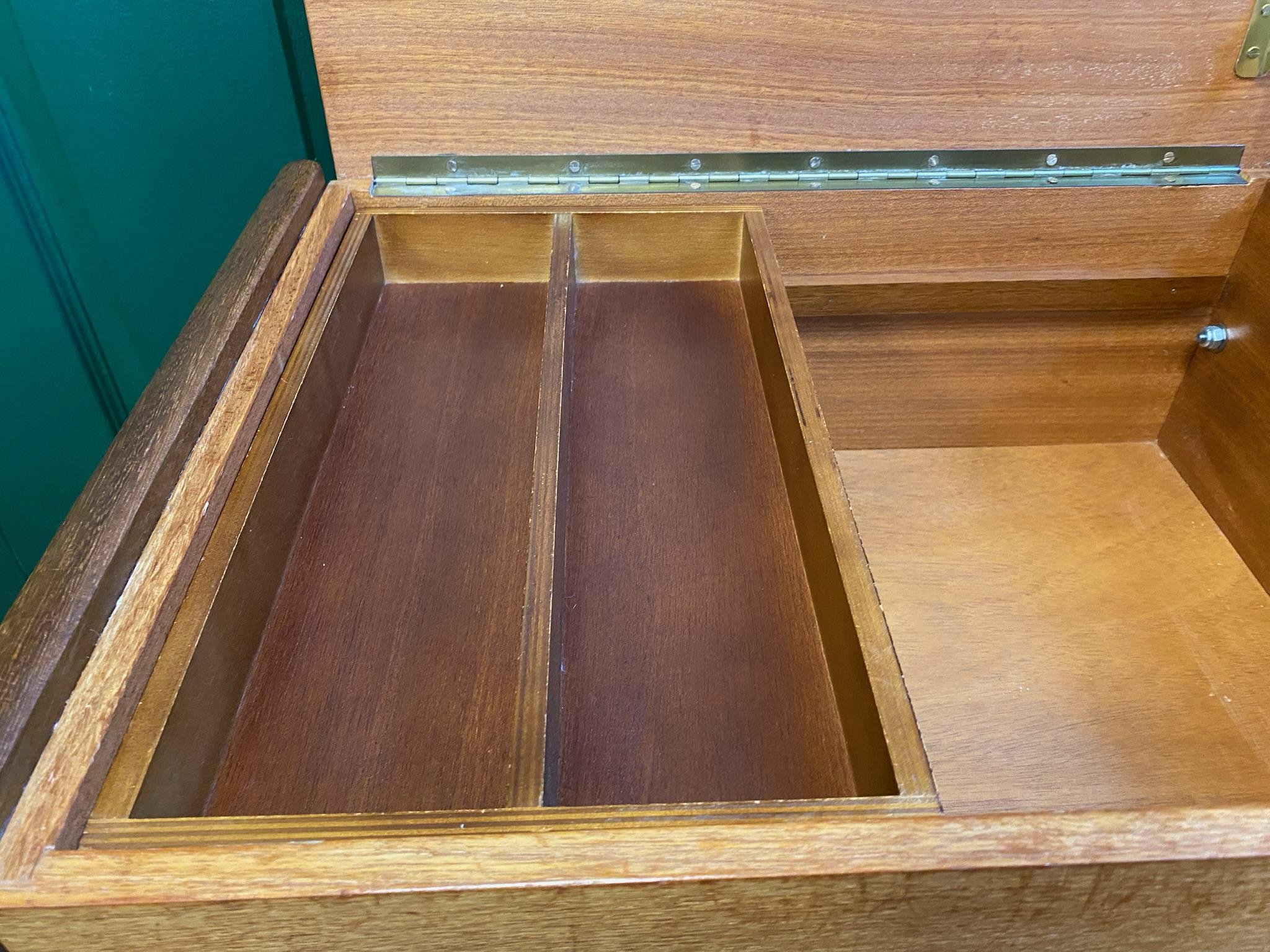 Mid century 1960s teak sewing box Teak veneer on solid teak quadrille legs Lift up lid with removable storage tray