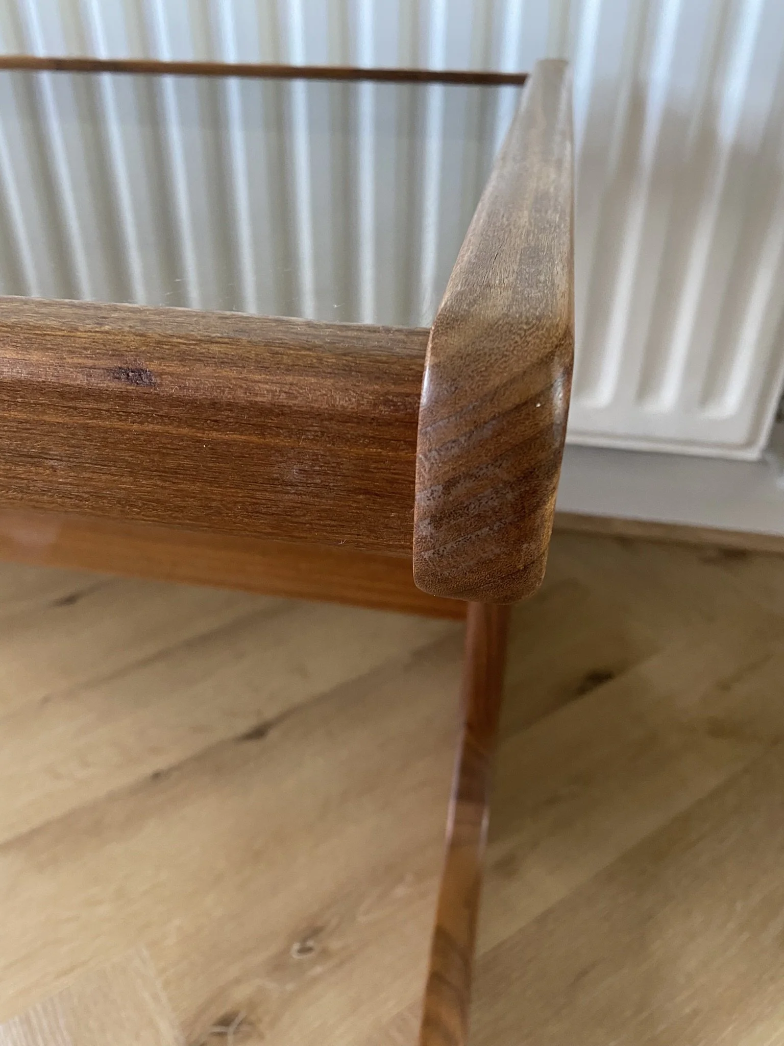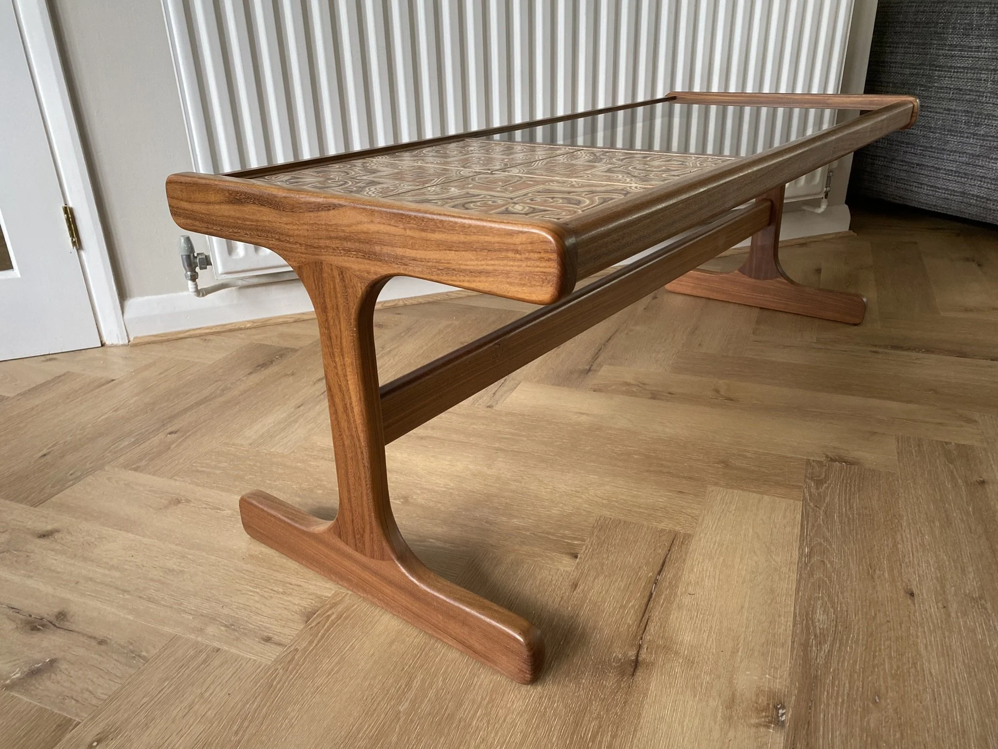 Mid century Danish style teak G Plan rectangular tiled and smoked glass coffee table