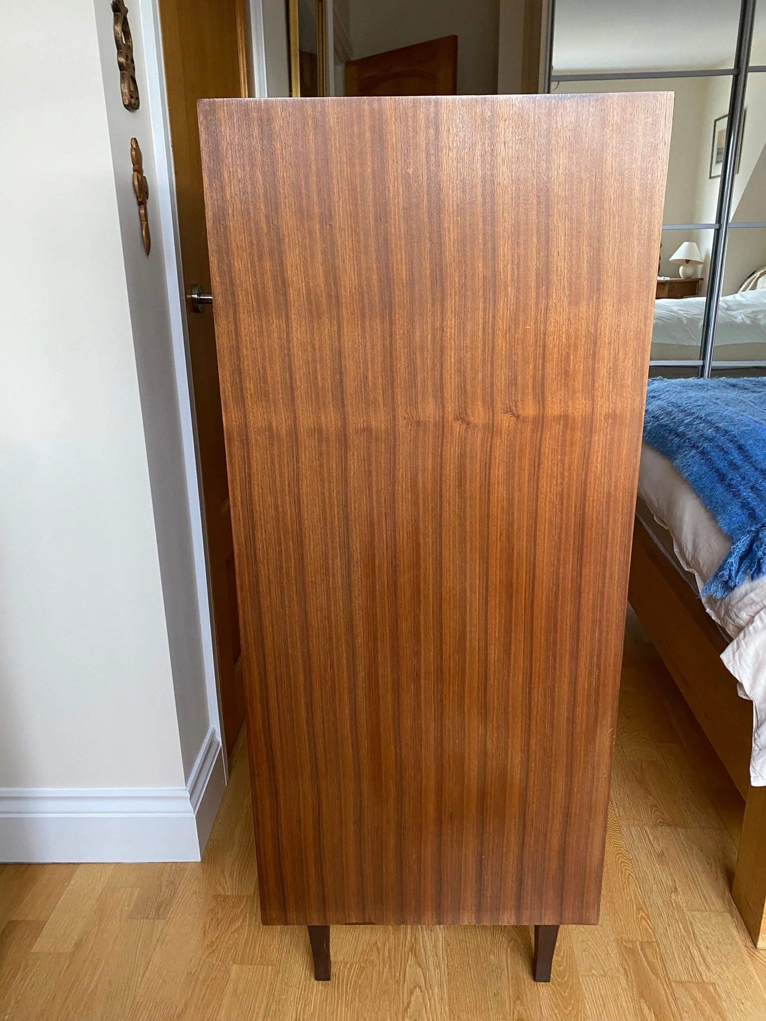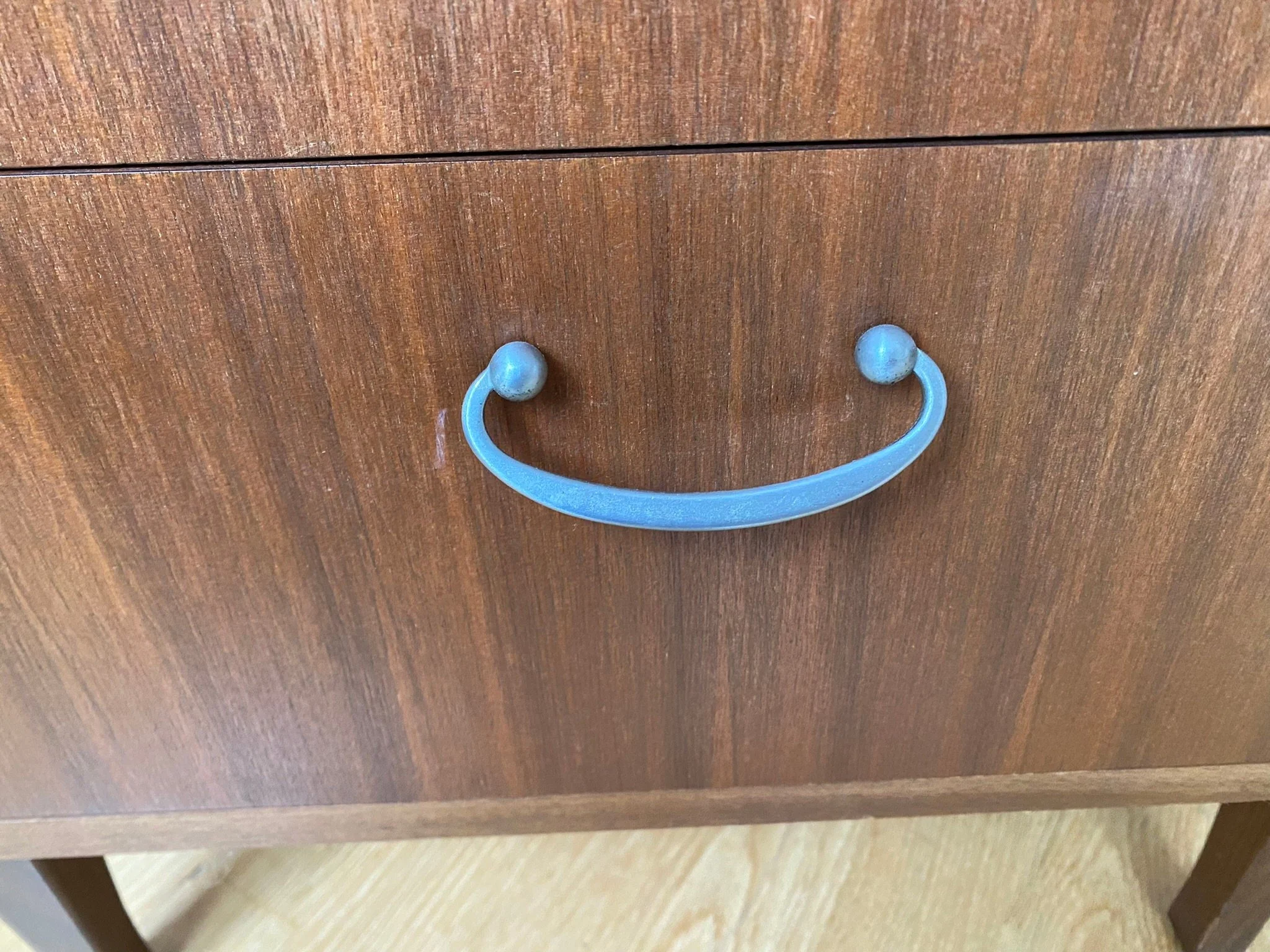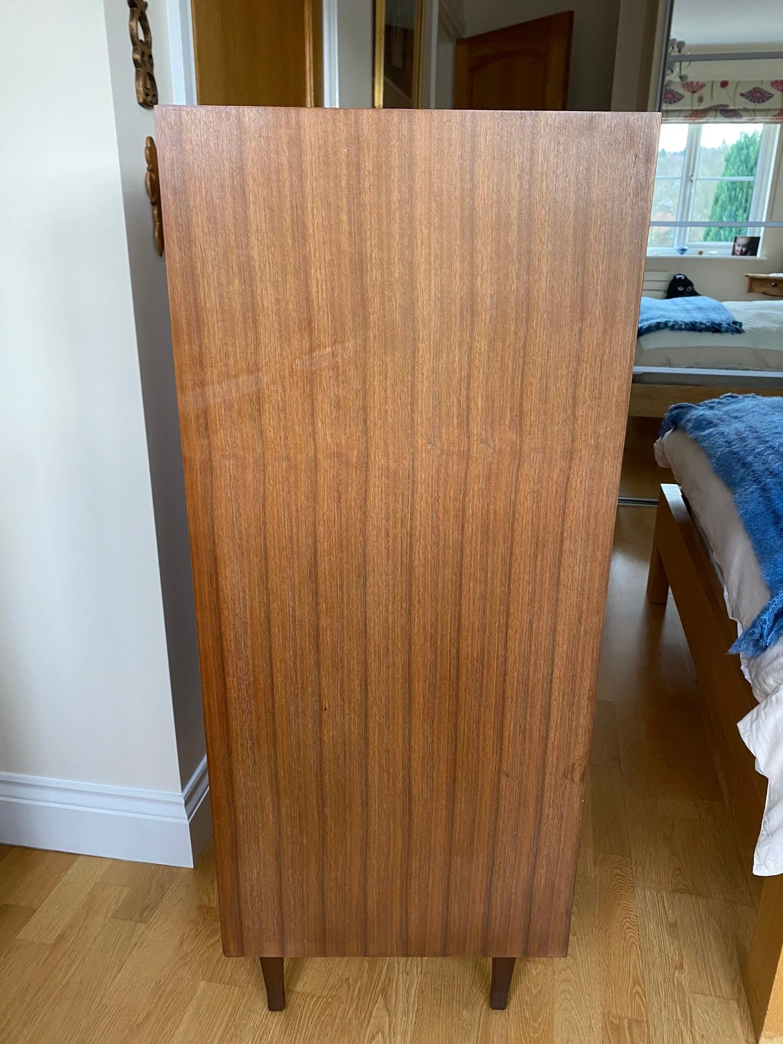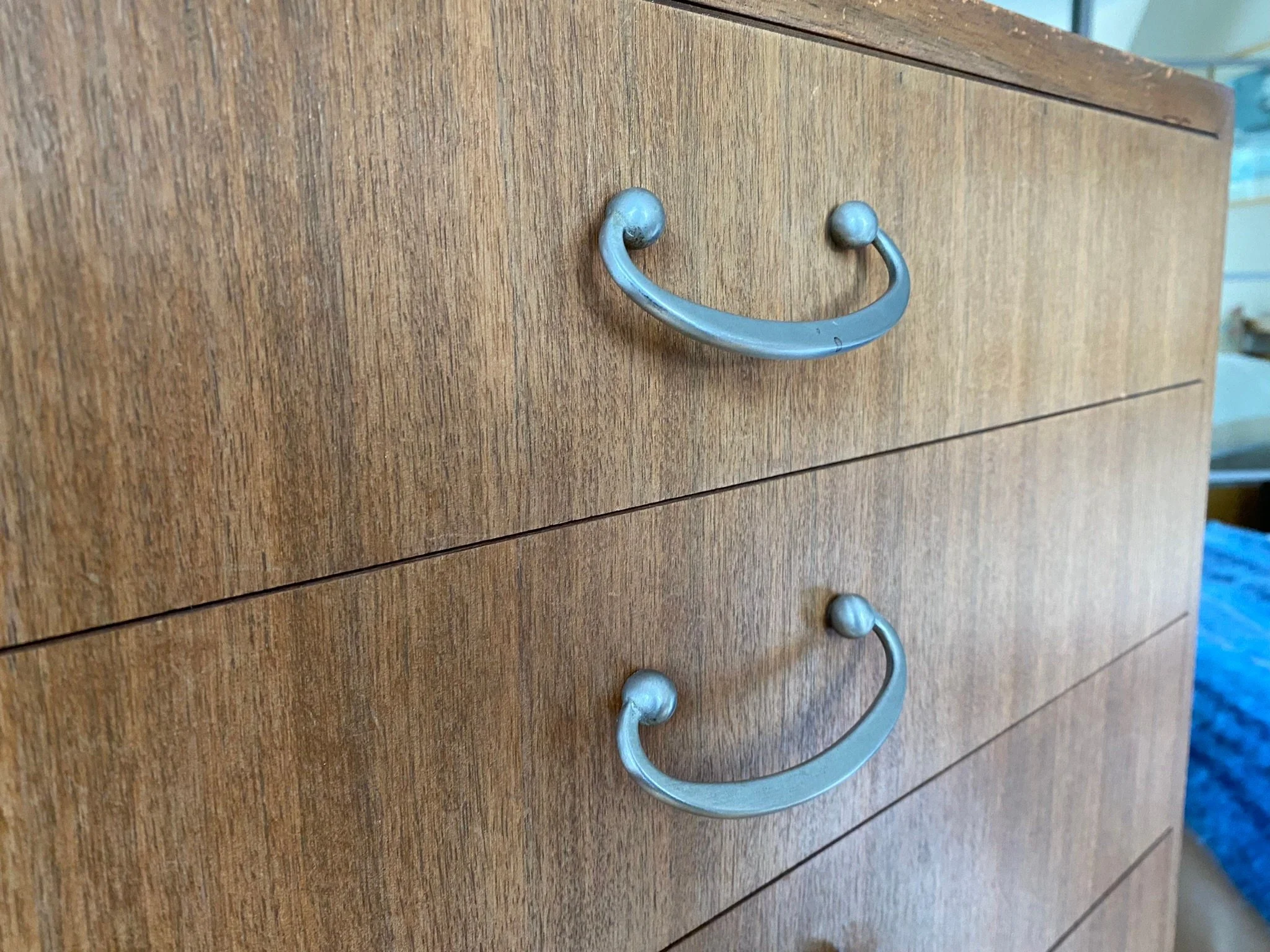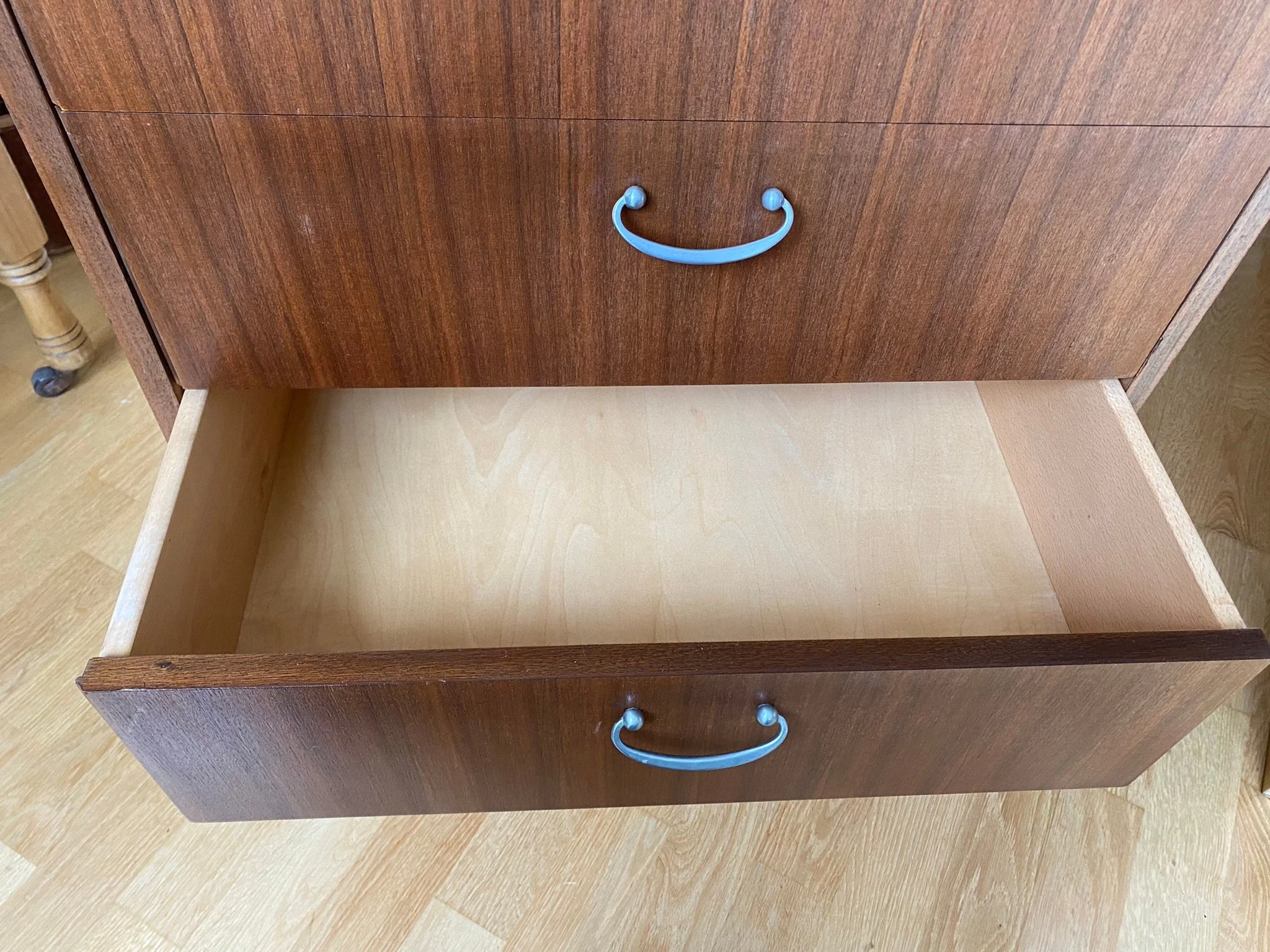 Tall boy featuring seven drawers with chrome handles Mid century style in teak veneer with solid teak pin legs Purchased new in 1964