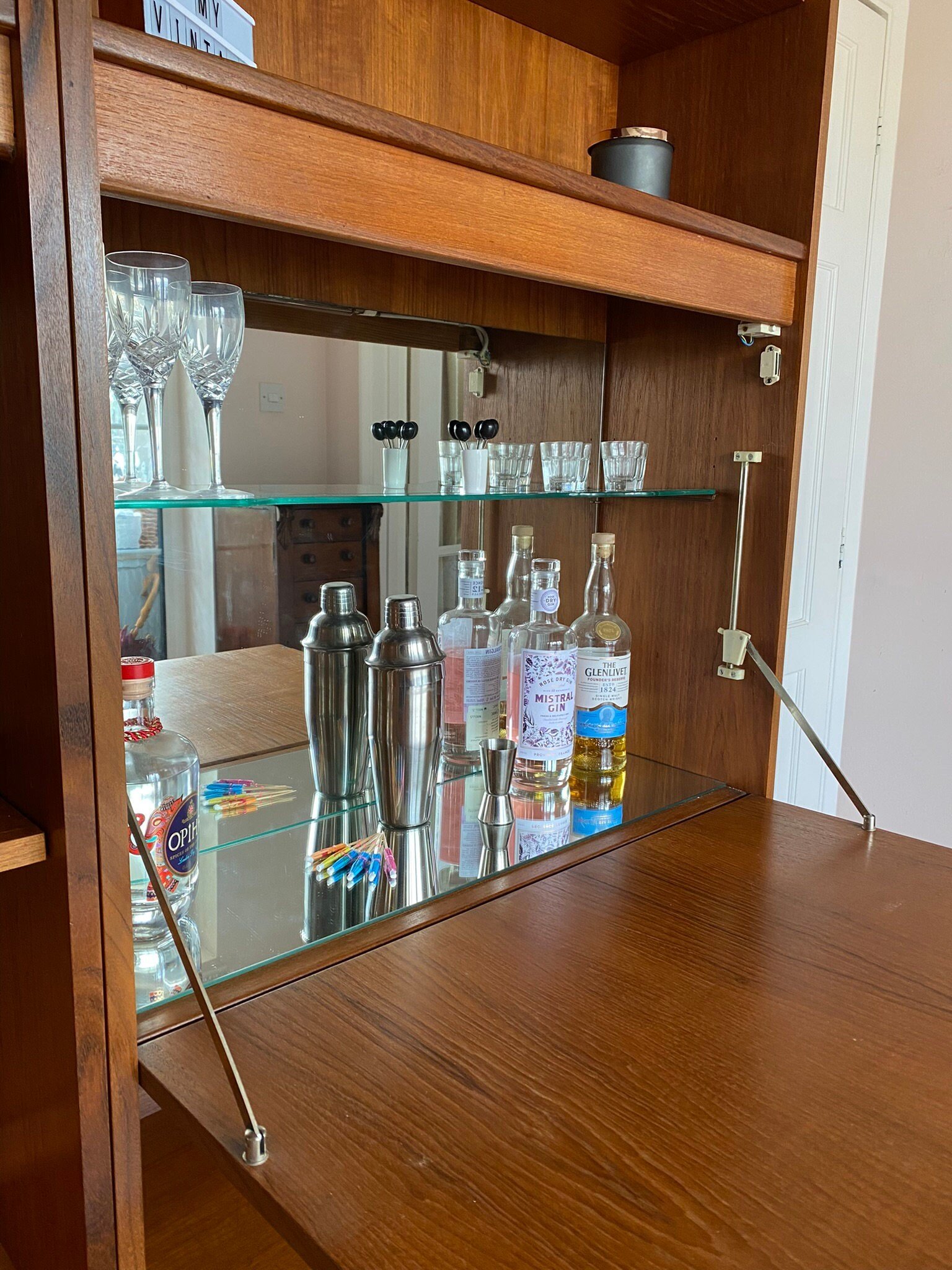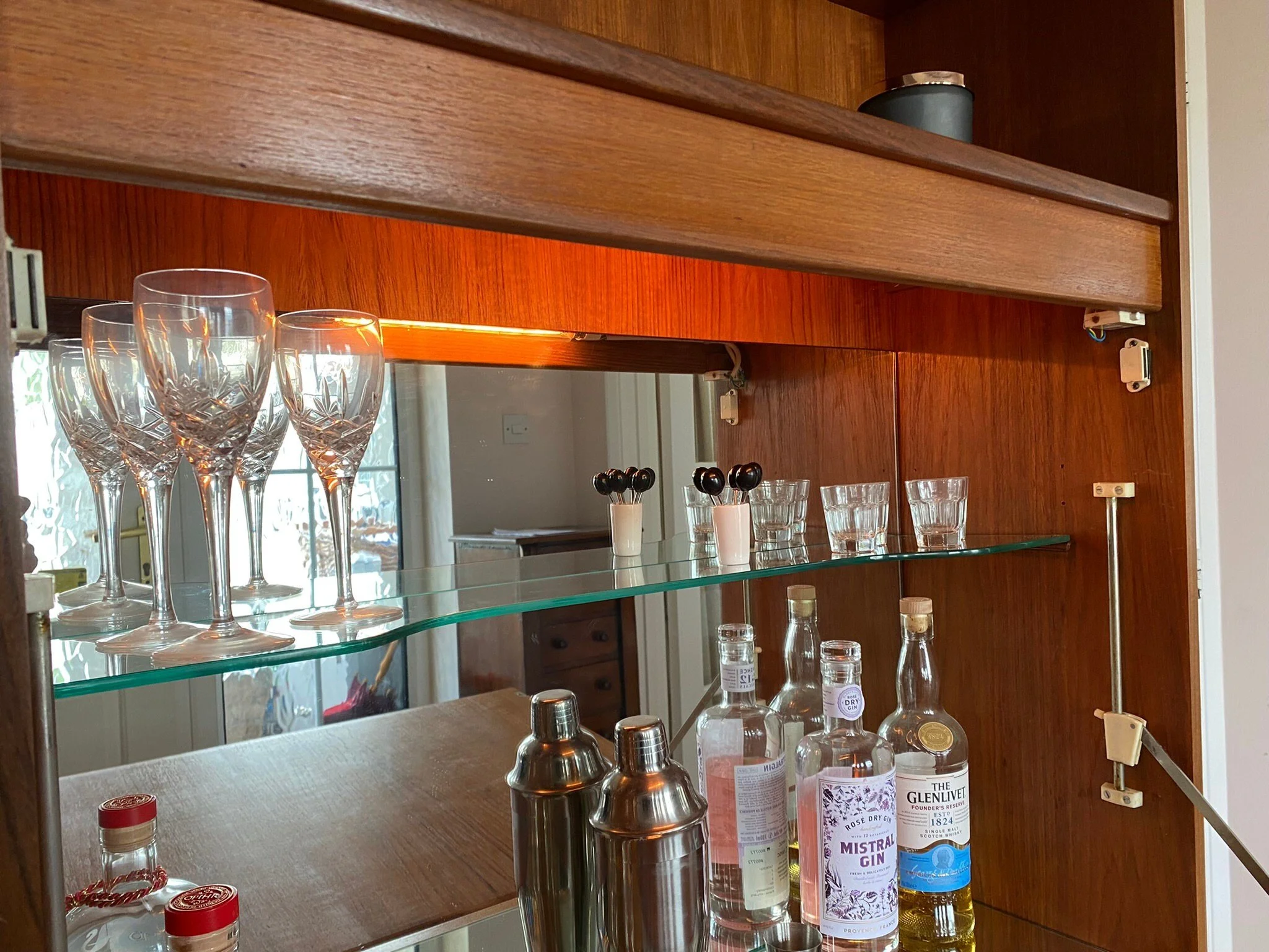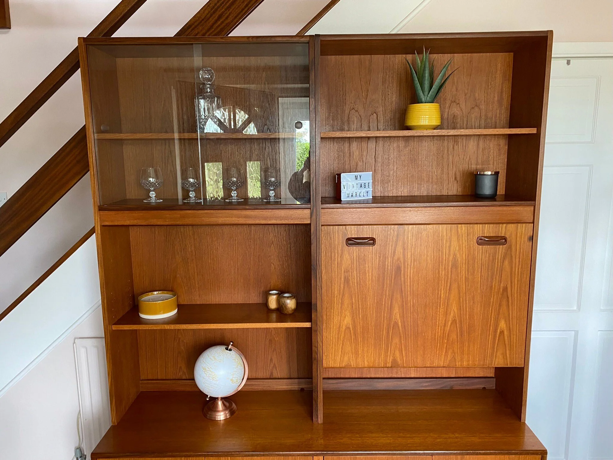 This piece has been restored with an oil and polish. There is the odd surface scratch as expected for its age, and a small bit of damage to the wood on the side of the cocktail door and the underside of the shelf above it, see photos. This doesn’t detract aesthetically. A beautiful retro piece in very good condition.