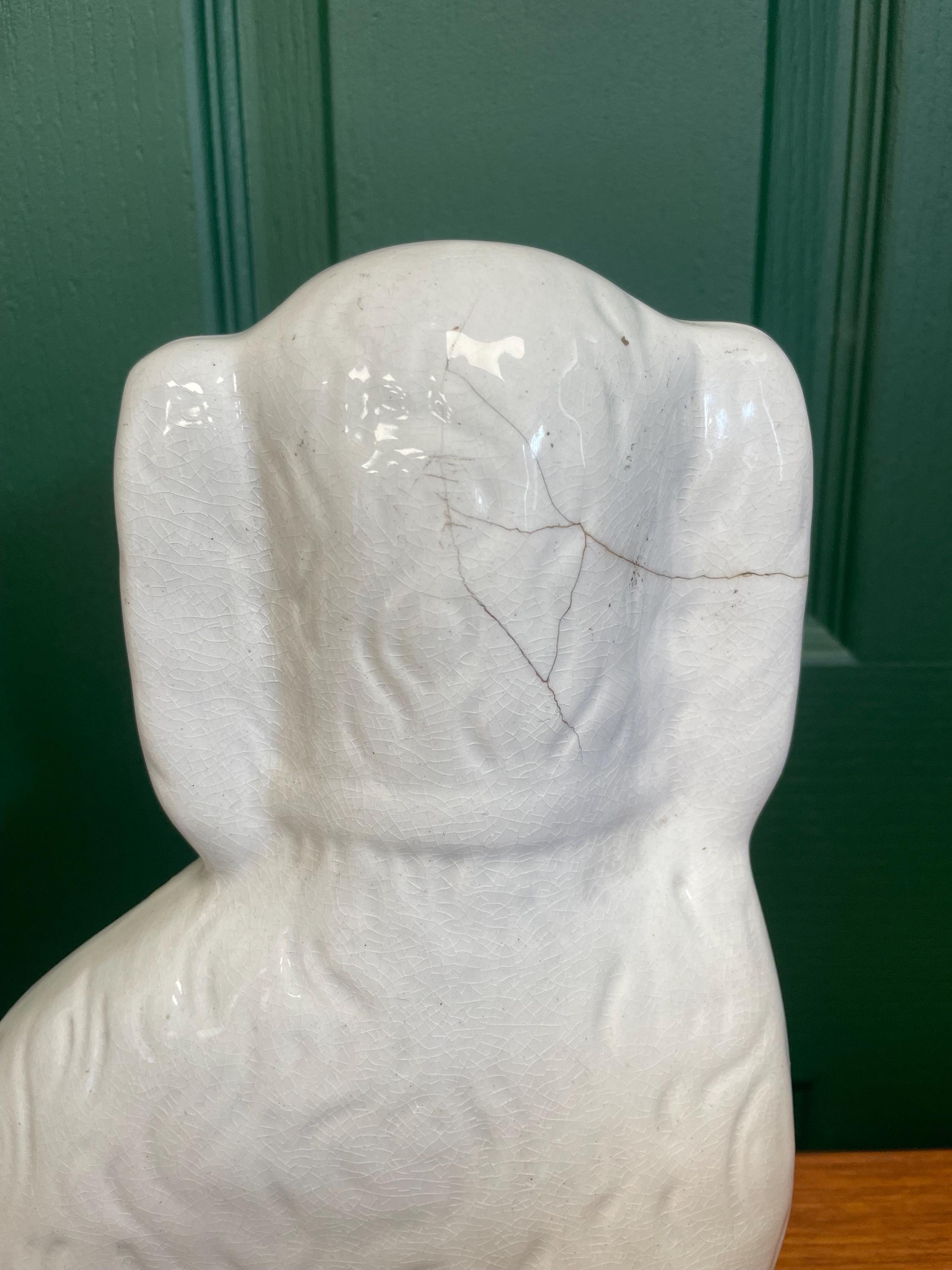 Pair of Antique Victorian hand painted Staffordshire Dogs. This pair show the brush strokes demonstrating hand painting on the faces of the dogs and will have been made for a cottage mantelpiece in a working class home. The gold paint has faded over the years and the ceramic glaze has crazed over the whole ornament adding to its charm. One dog has been mended sympathetically.