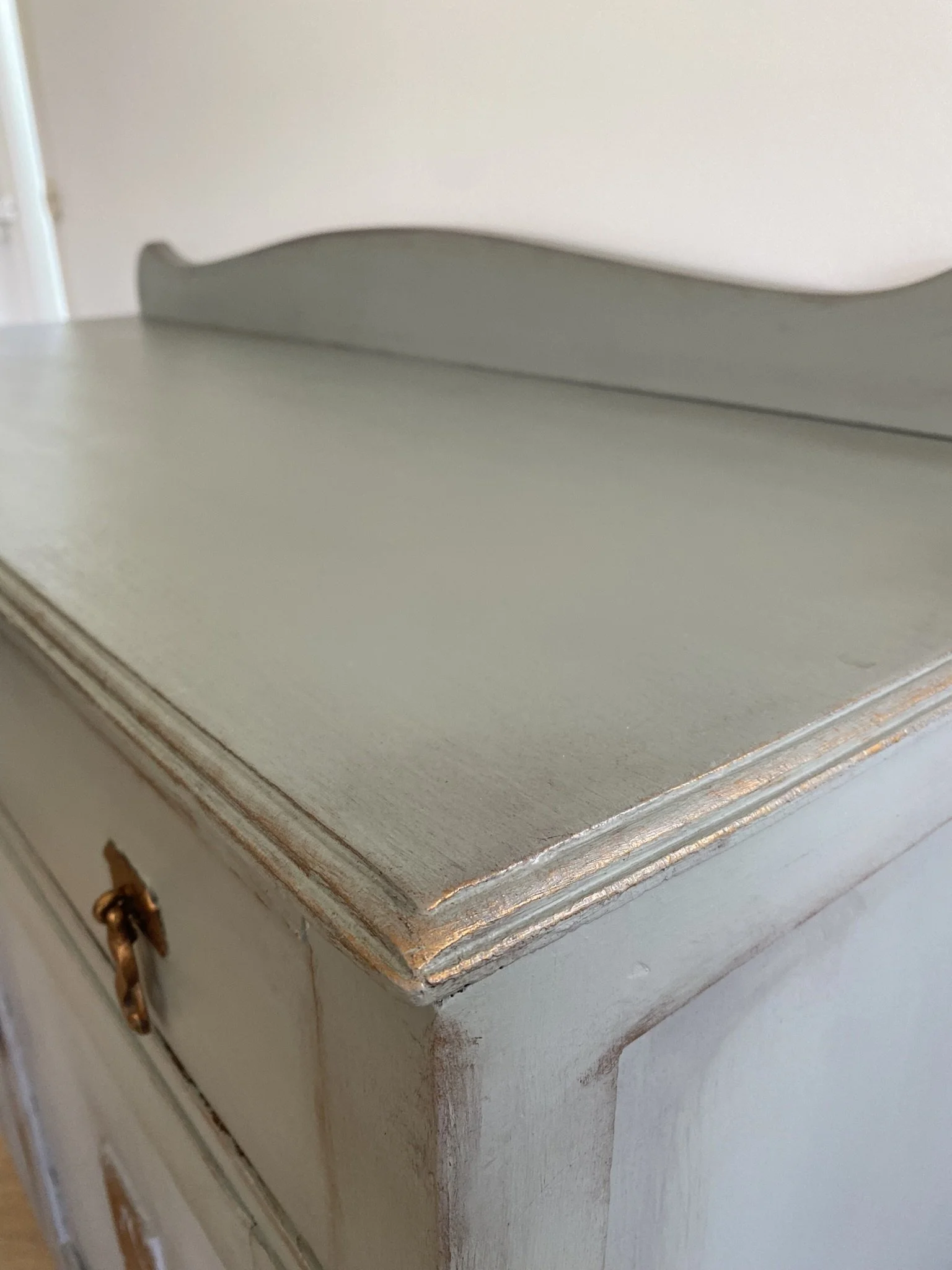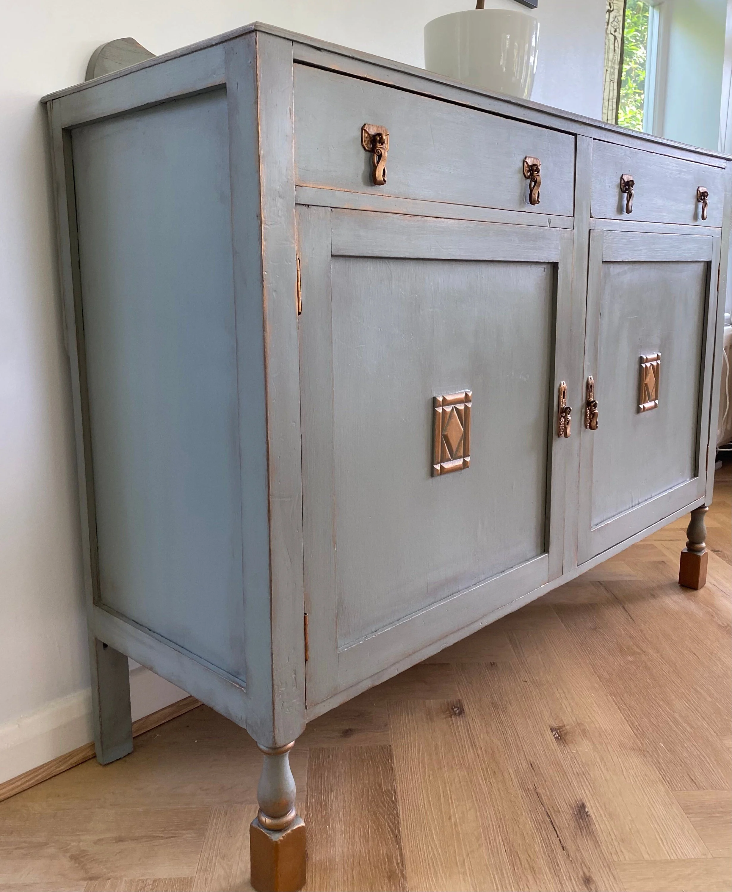 Refurbished antique sideboard, painted green grey, bronze detail