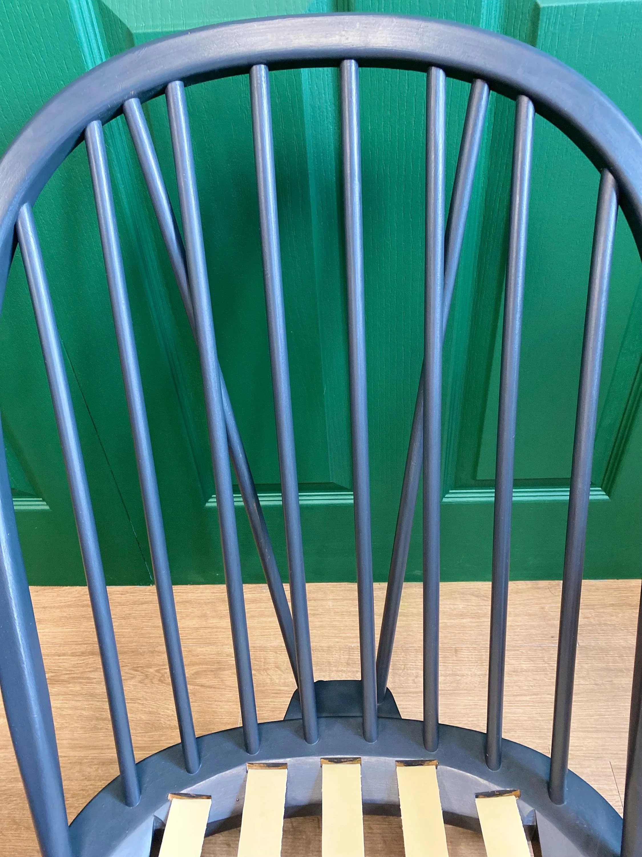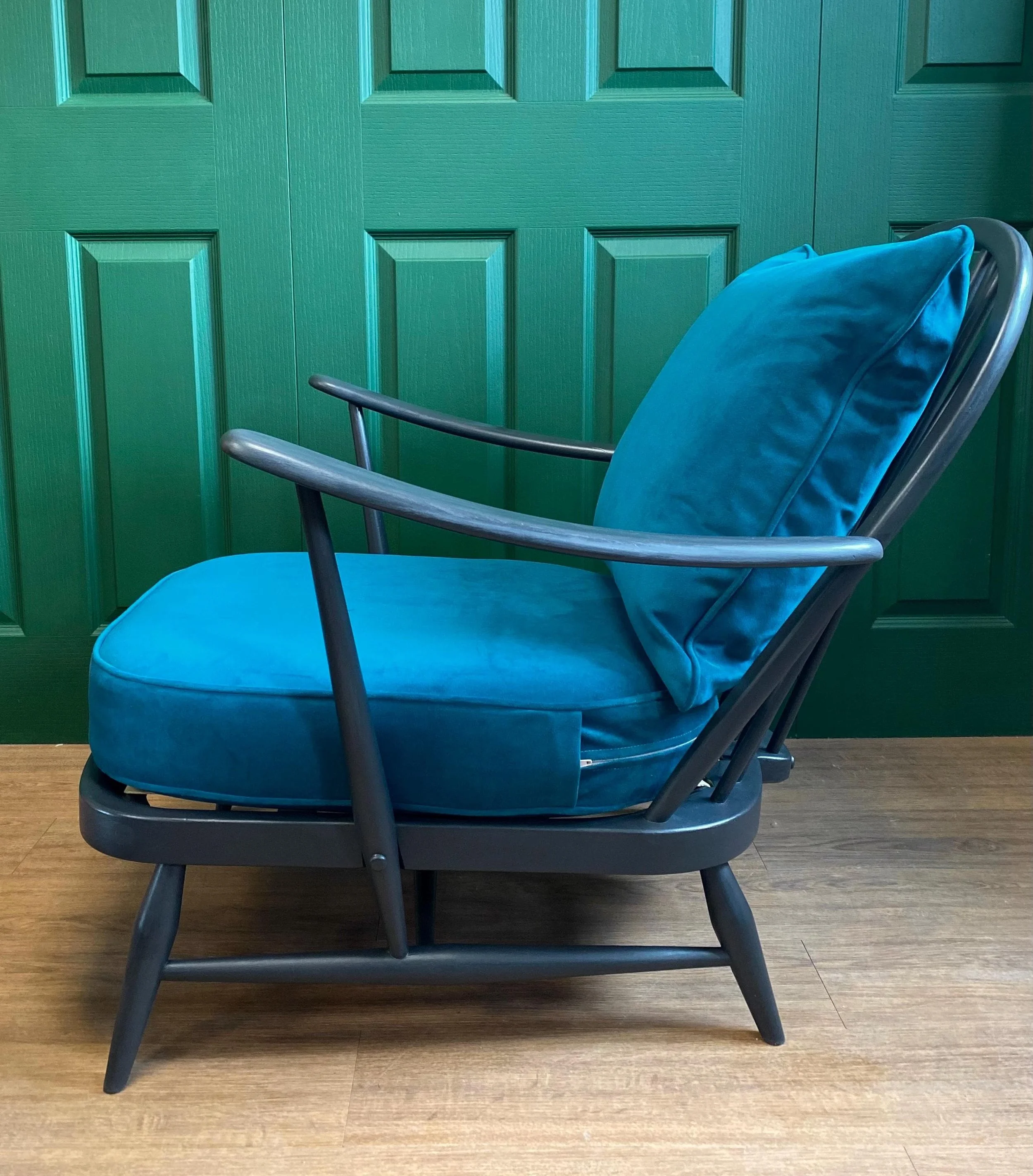Mid century Ercol Windsor armchair Timeless elegant design Has been refurbished and reupholstered in a modern style The frame has been hand painted in a dark ash grey The foam and base straps have been replaced and it has been upholstered in a rich teal blue green velvet fabric. The original back cushions have been replaced with a scatter cushion for a more up to date look.
